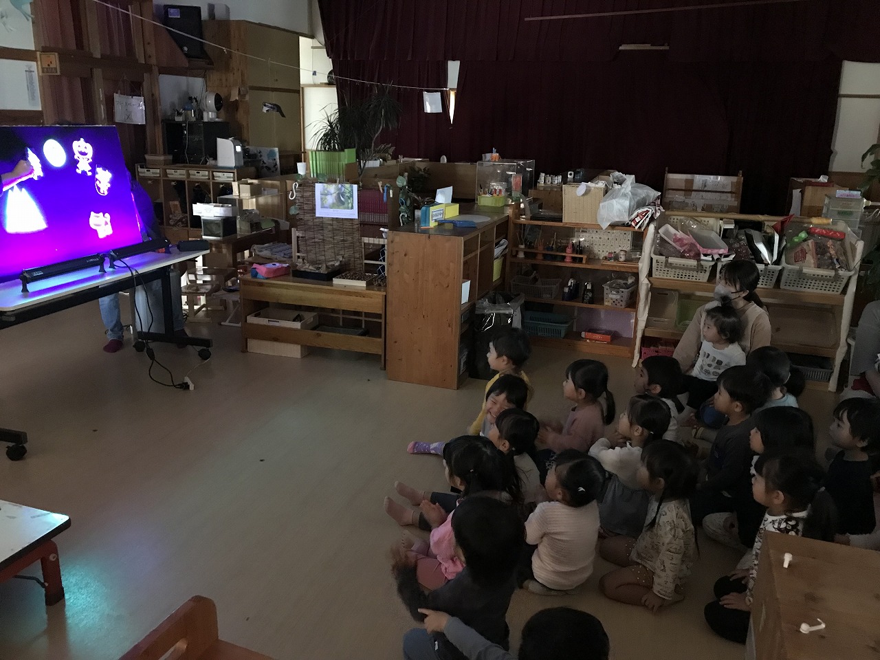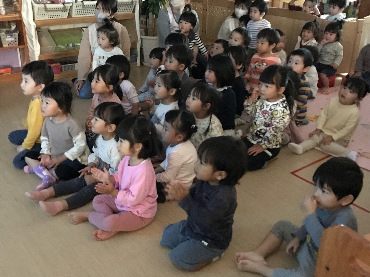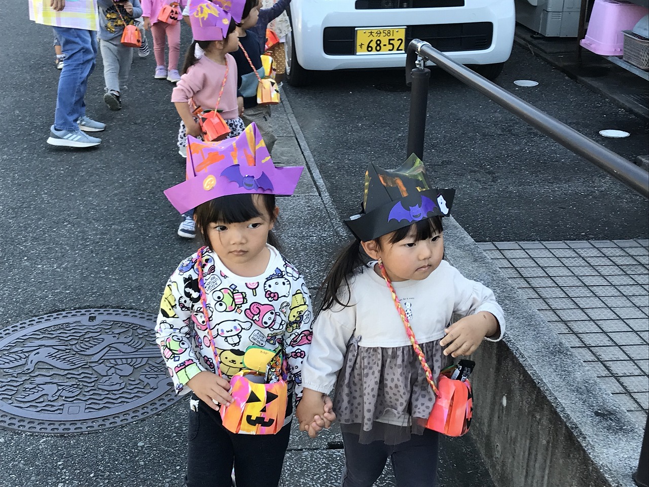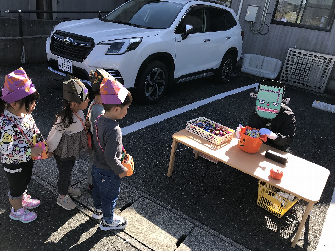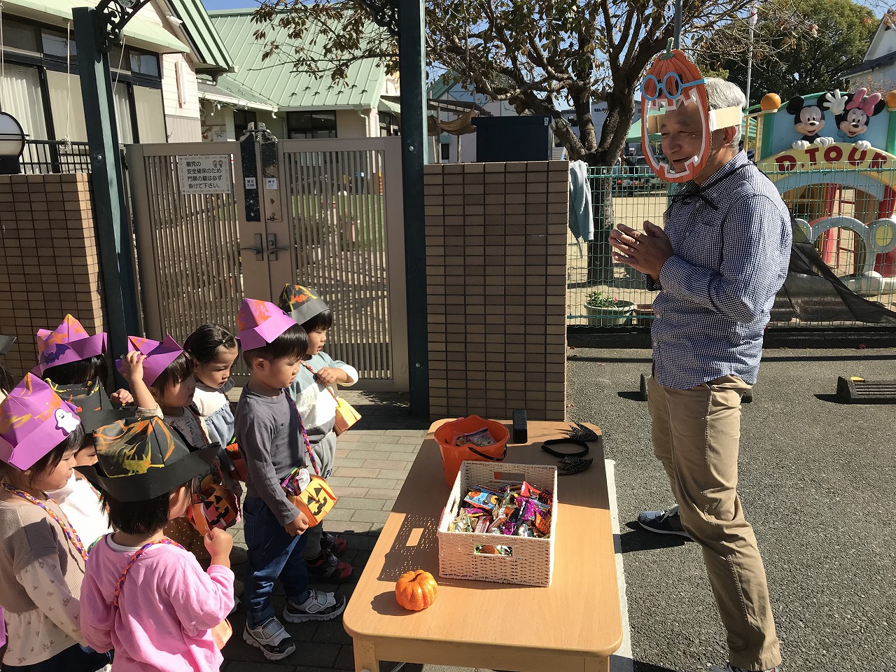 待ちに待ったハロウィンの日。たんぽぽ組(2歳児)は早くから帽子やバックをつくり、部屋に飾っていたので「明日、ハロウィン?」と待ち遠しかったようです。最初に暗い中でのブラックシアターは泣いてしまった子もいましたが、ほとんどの子が終わって楽しかったね!と言っていました。さて、準備してお菓子をもらいに回ります。「今日は三つもらいにいくよ!」としっかり数えながら「トリックオアトリート!」とみんなで元気に声を出してもらいました。お菓子はおうちでのお楽しみです…。