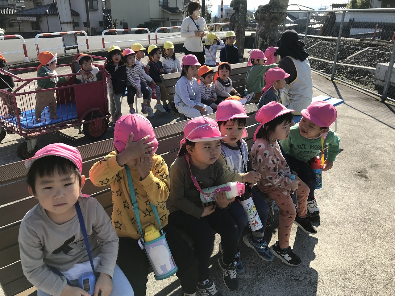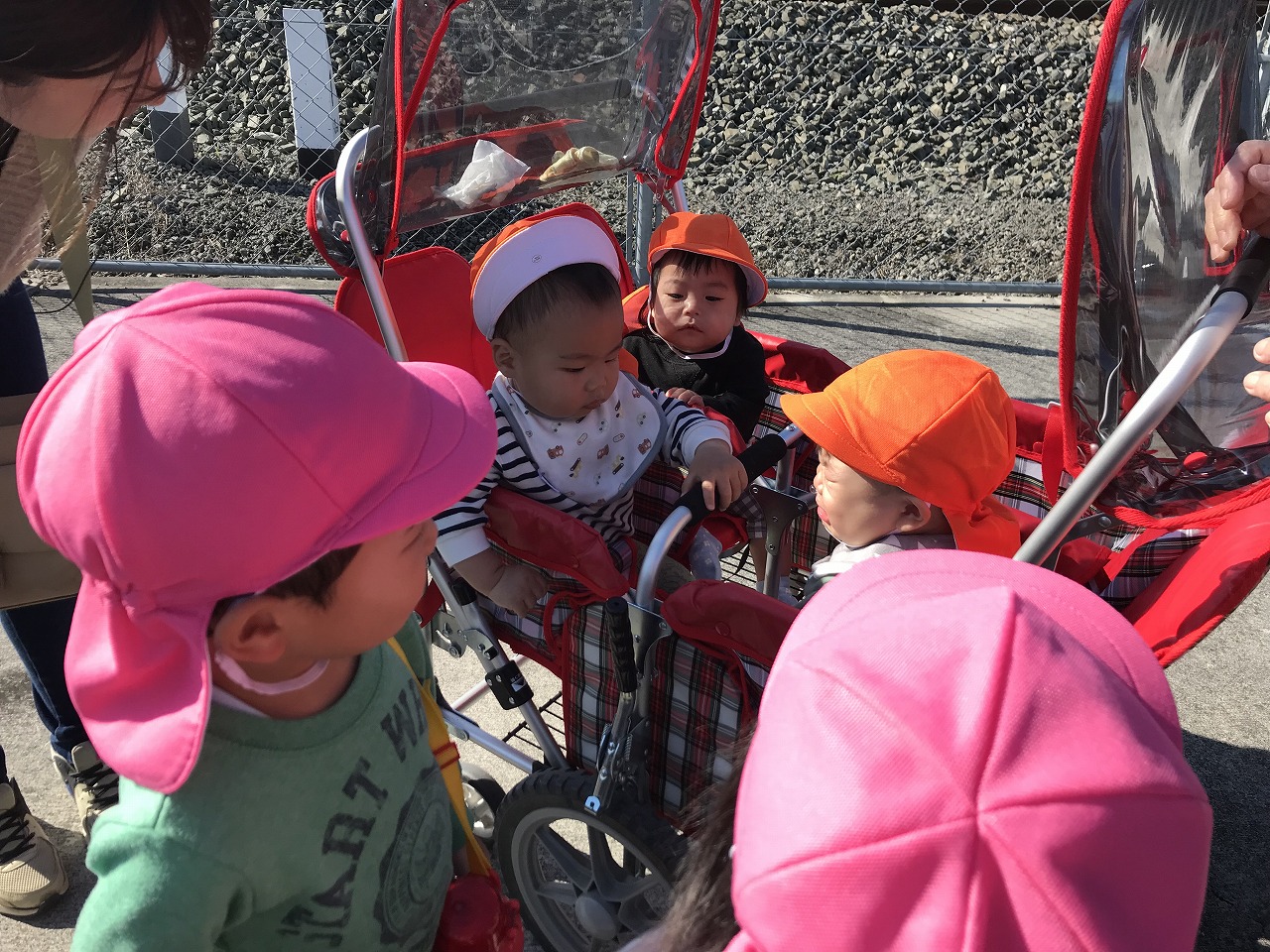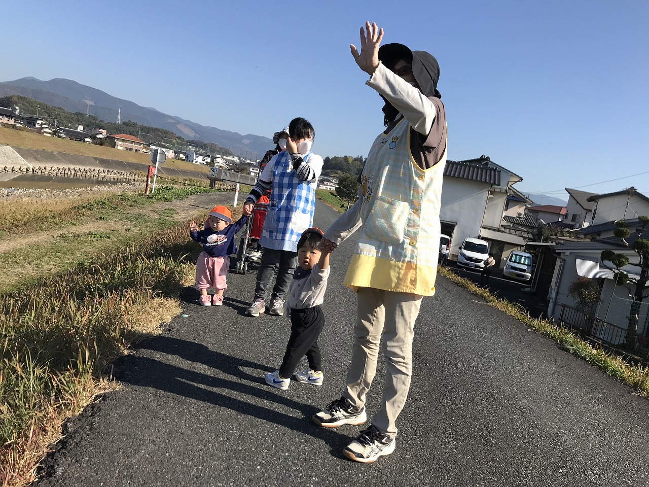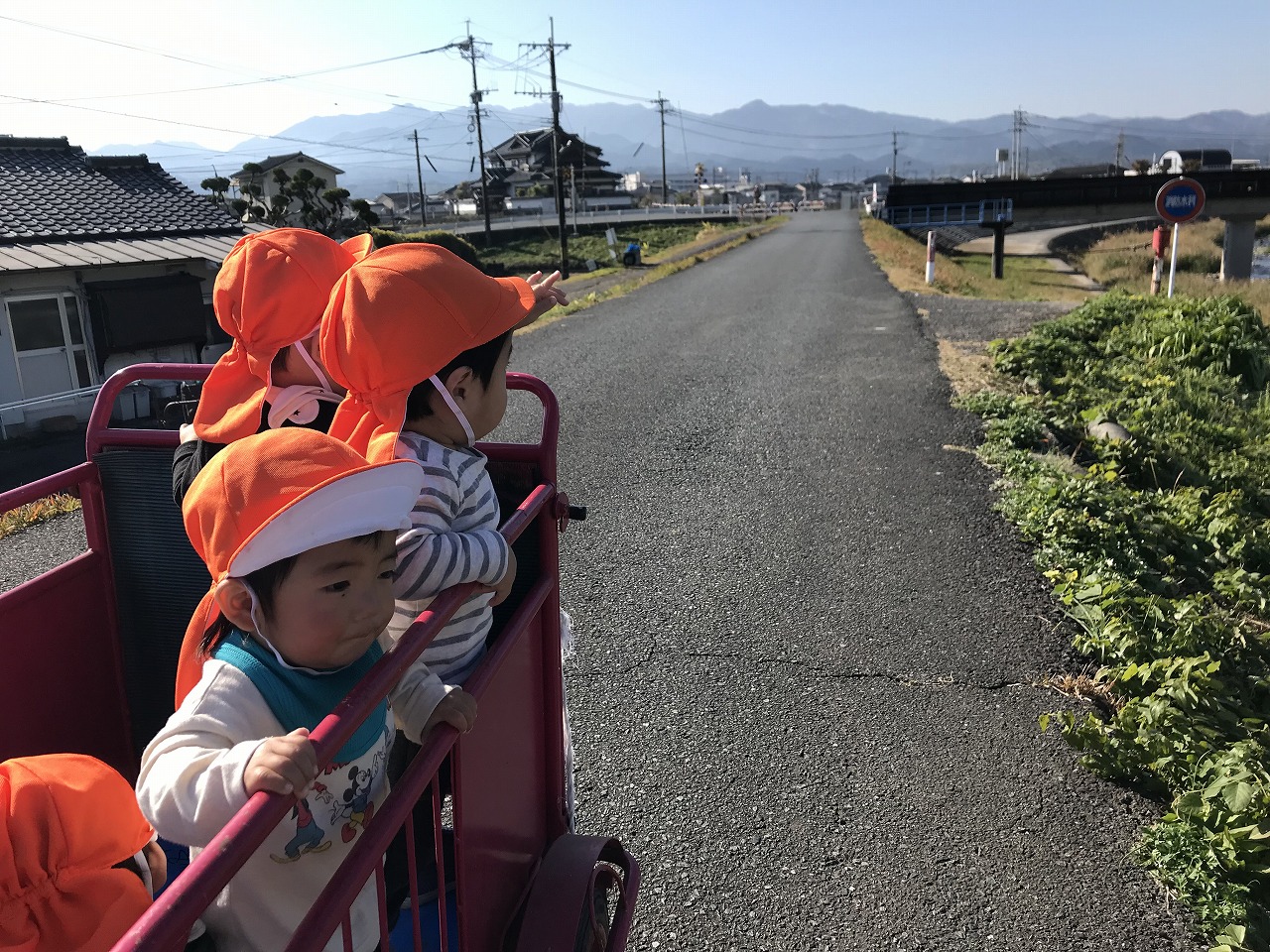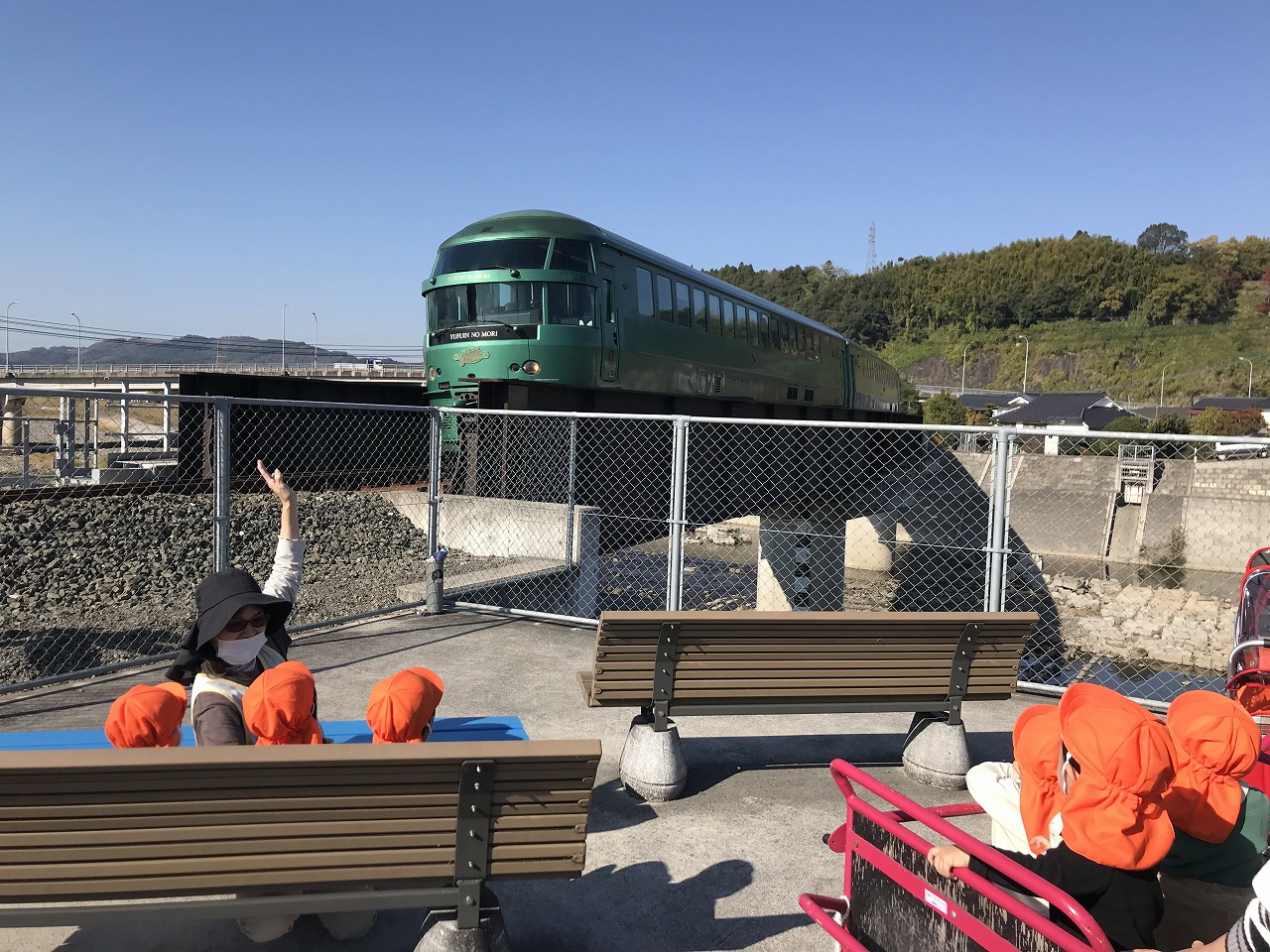 朝晩は寒いですが、日中はぽかぽか陽気でおさんぽ日和です。ひよこ組(0歳児)は汽車を見にお散歩にでかけました。散歩途中の土手もとっても気持ちが良くて、バイパスを通るトラックにも大興奮の子どもたちです。川にいるカモやサギにも気付き、「あっ!」と指差しで教えてくれます。手を振る姿がとてもかわいいです。汽車が見える広場に行くと、ちょうどゆふいんの森号が通り、運転手さんが手を振ってくれました。うめ組(3歳児)やさくら組(4歳児)もお散歩に来て、一緒に過ごし、赤い電車を見送りました。にぎやかな楽しいお散歩でした。