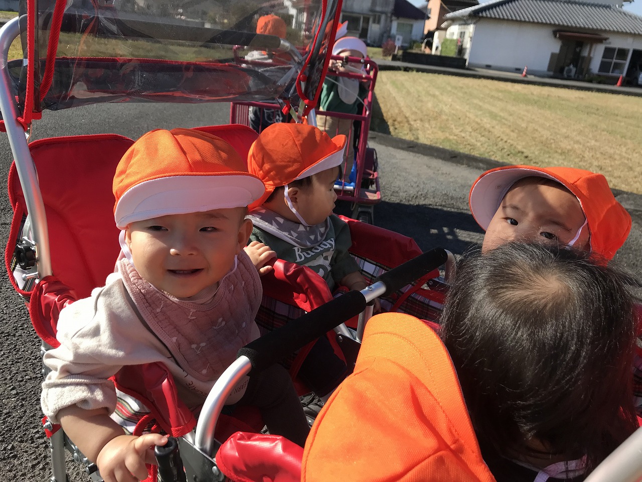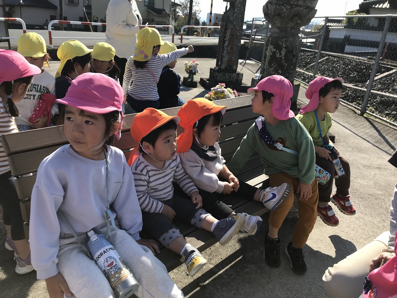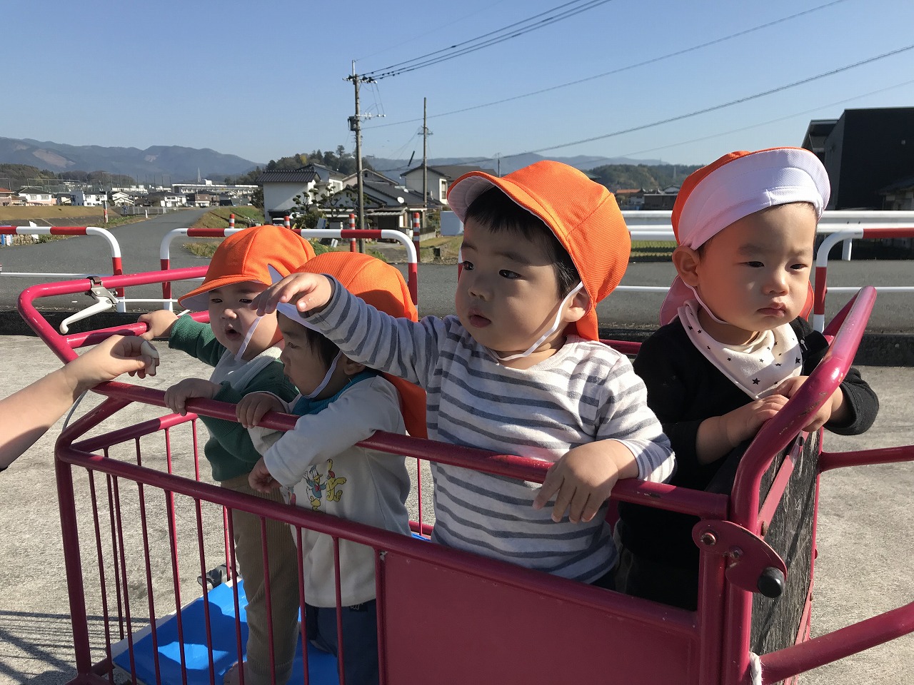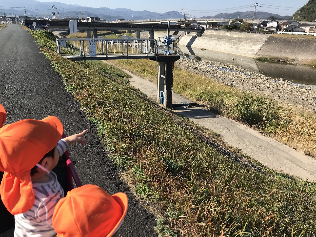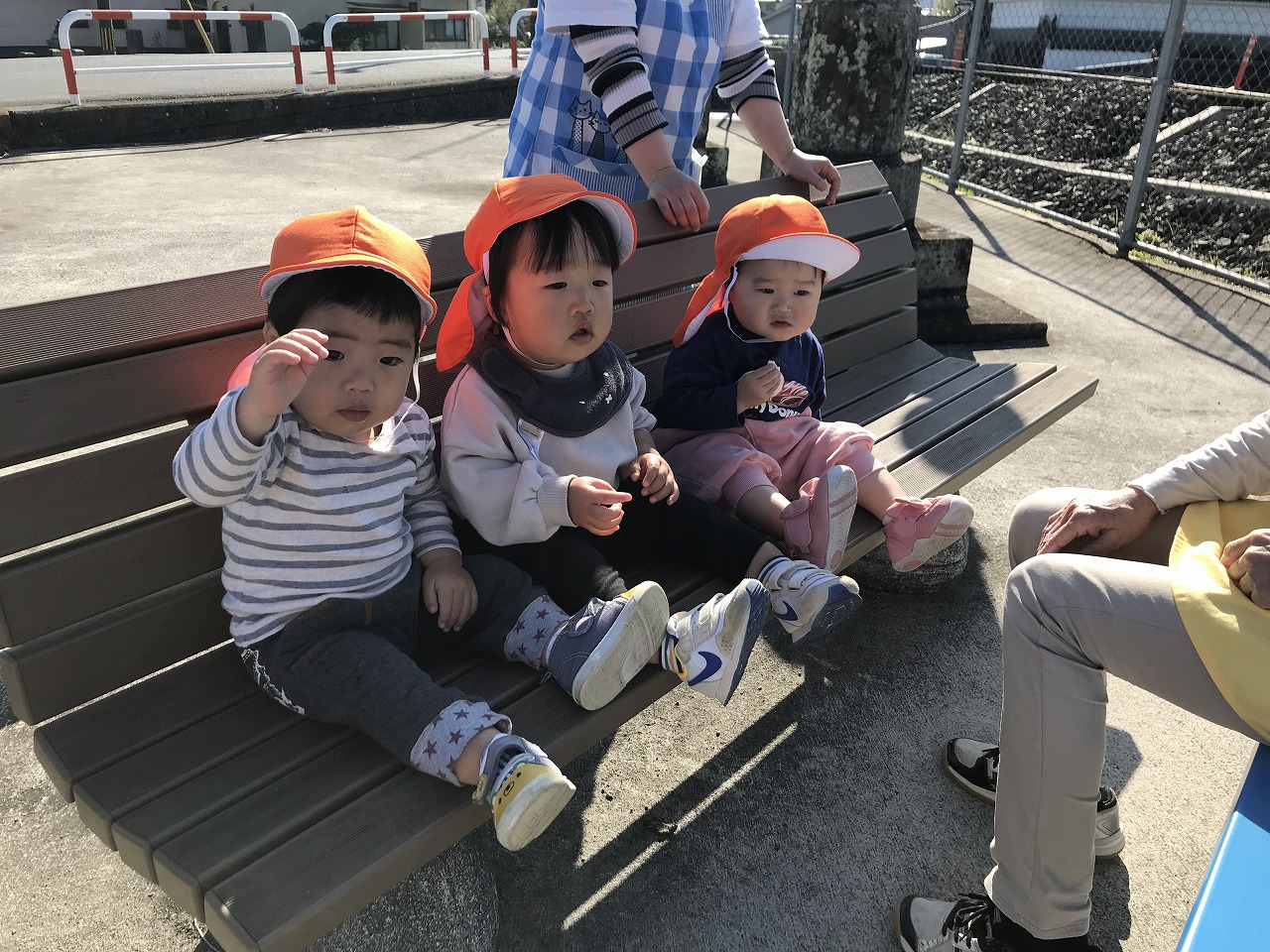 朝晩は寒いですが、日中はぽかぽか陽気でおさんぽ日和です。ひよこ組(0歳児)は汽車を見にお散歩にでかけました。散歩途中の土手もとっても気持ちが良くて、バイパスを通るトラックにも大興奮の子どもたちです。川にいるカモやサギにも気付き、「あっ!」と指差しで教えてくれます。手を振る姿がとてもかわいいです。汽車が見える広場に行くと、ちょうどゆふいんの森号が通り、運転手さんが手を振ってくれました。うめ組(3歳児)やさくら組(4歳児)もお散歩に来て、一緒に過ごし、赤い電車を見送りました。にぎやかな楽しいお散歩でした。