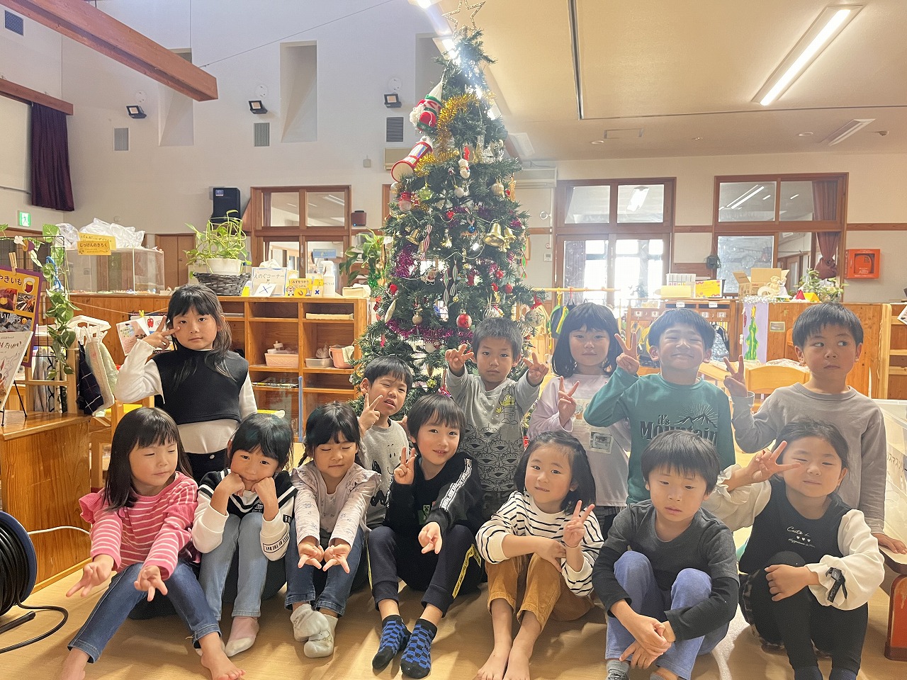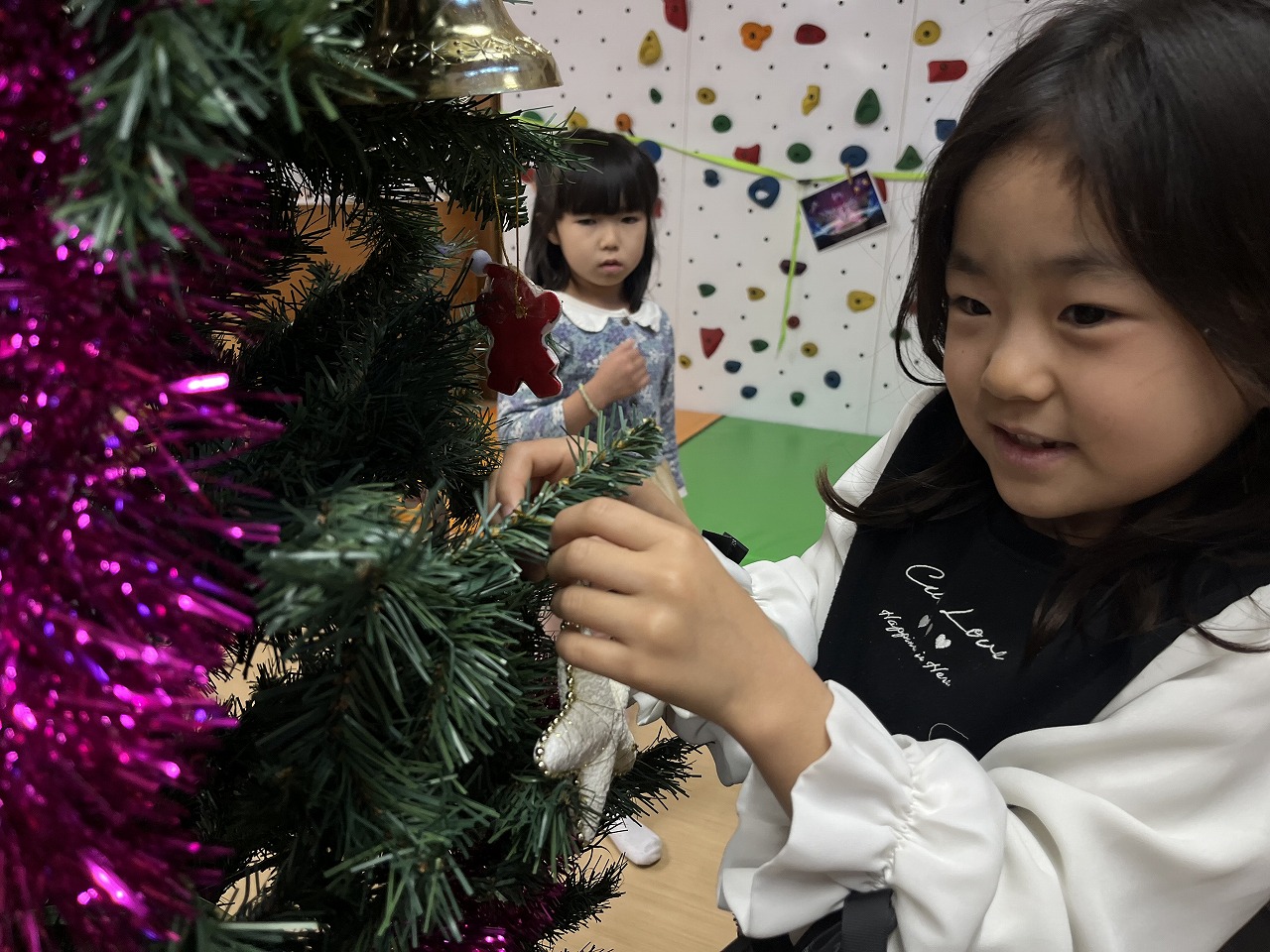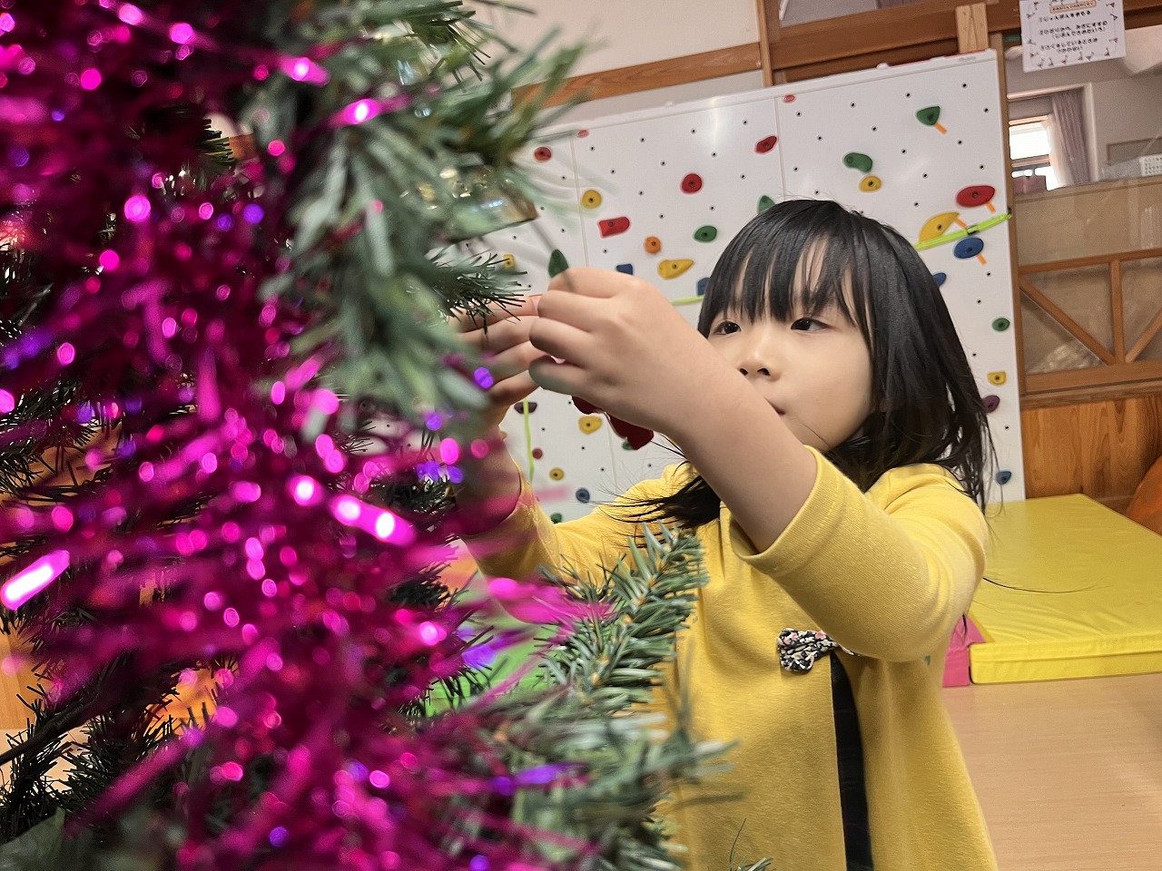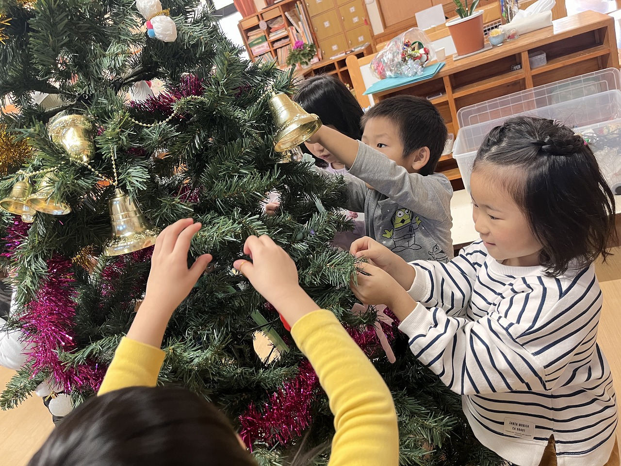 観葉植物にも「これもツリーみたい!!」と飾りつけをしてくれて、わくわくランドの中もクリスマスの雰囲気でとっても賑やかになりました。