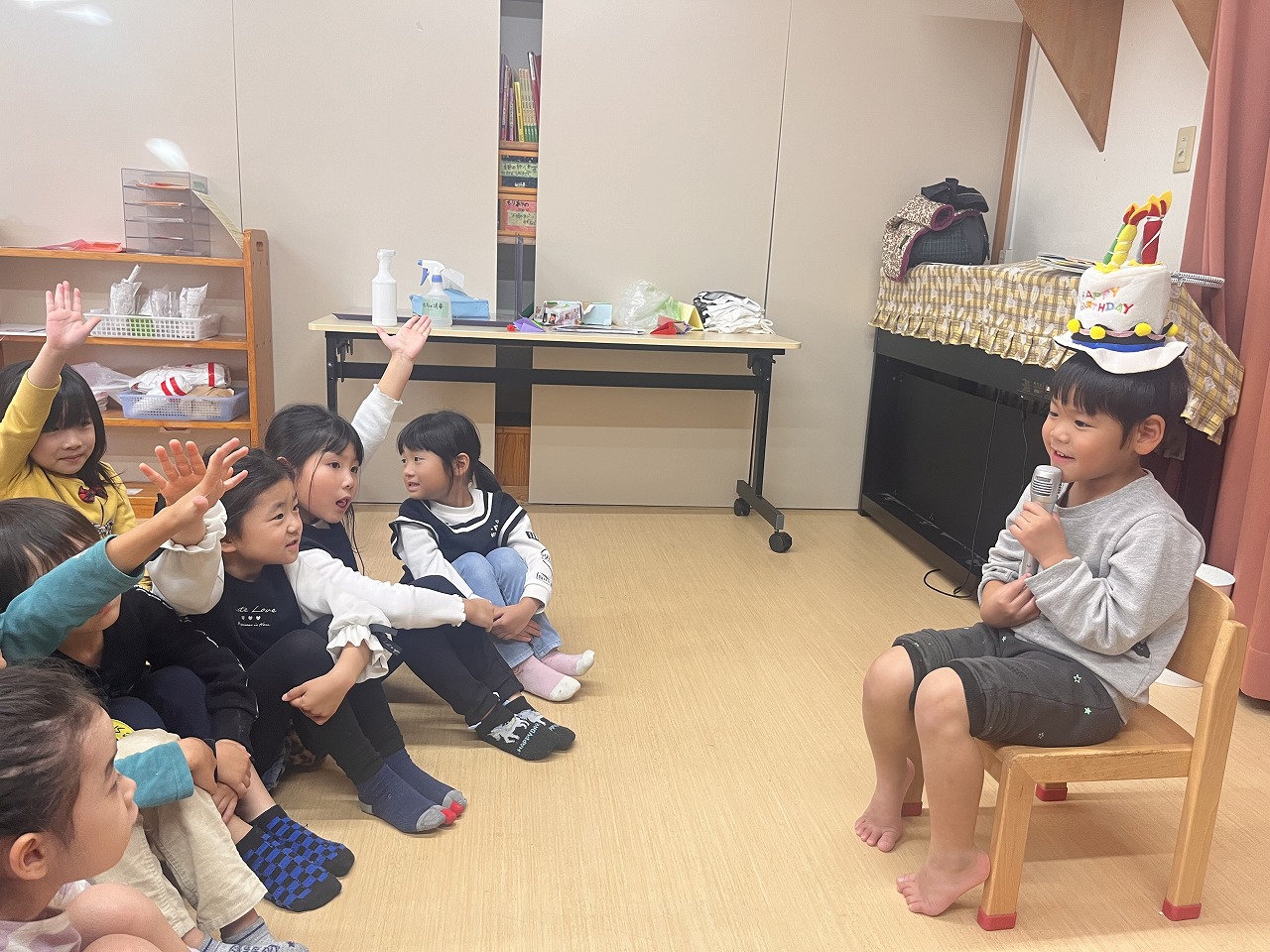 今月のお誕生会は感染症予防の為、各クラスに分かれて行いました。お誕生日のお友達はみんなの前に出て、嬉しそうだったり、恥ずかしそうな表情を浮かべながらも、インタビューに答えていました。