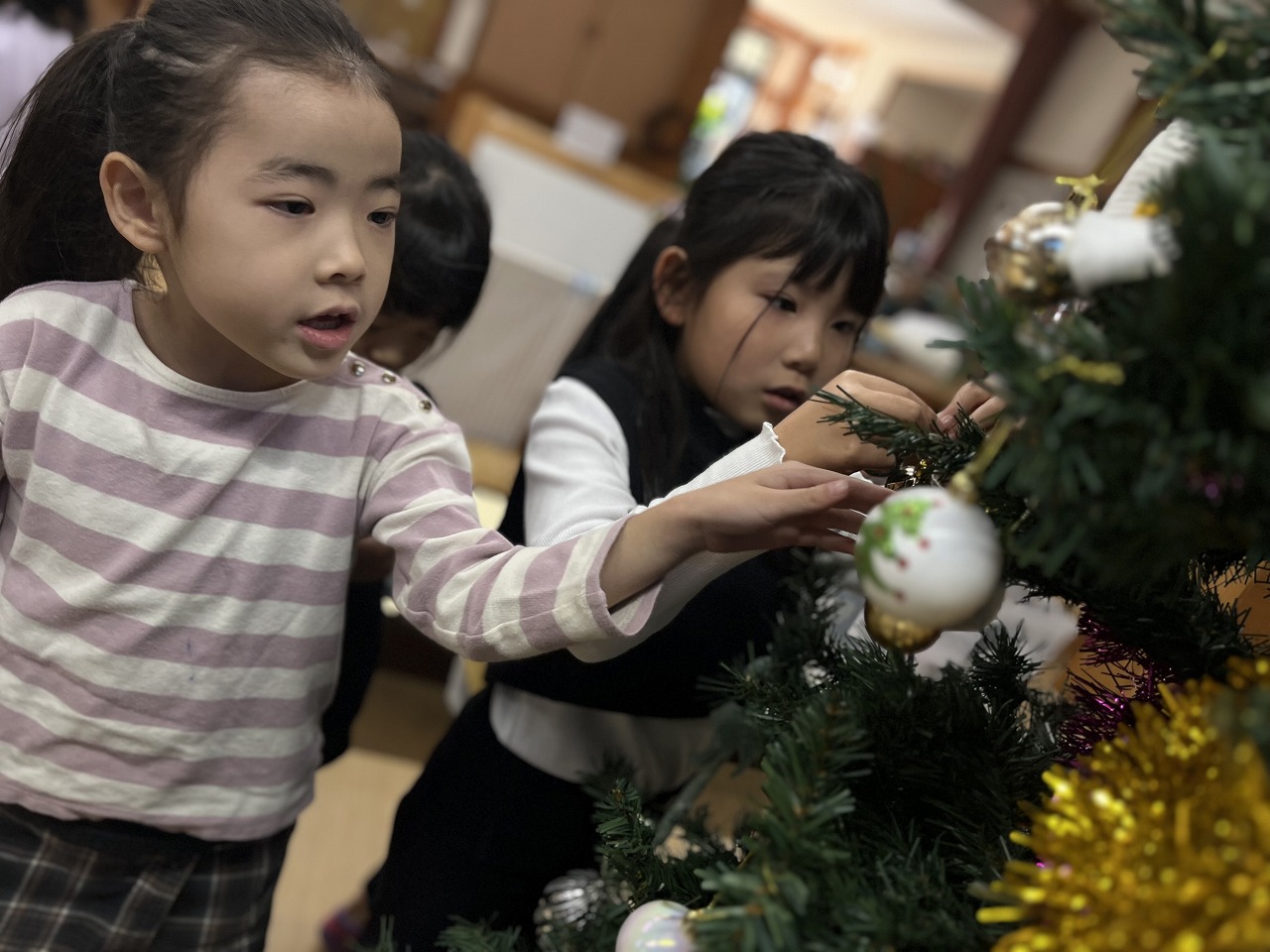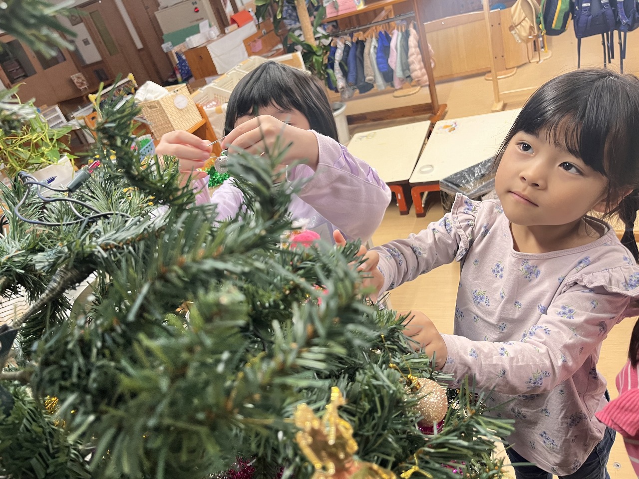 ホールに飾ってあったクリスマスツリーにもも組(5歳児)がクリスマス飾りをつけてくれました。