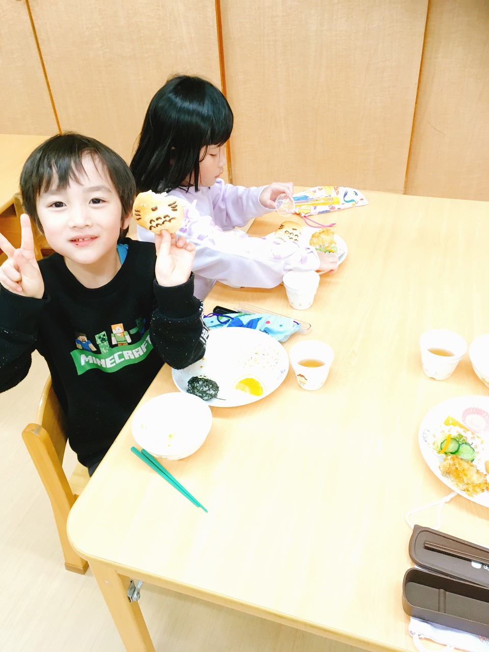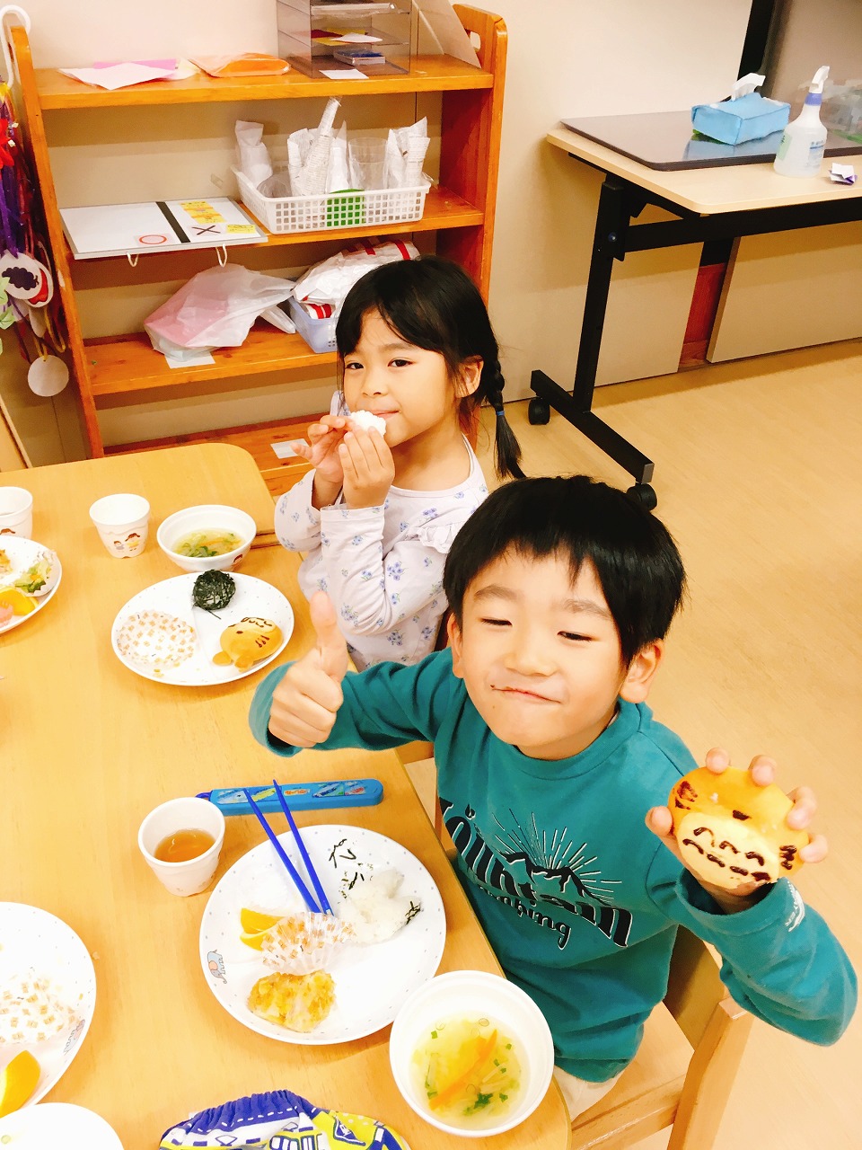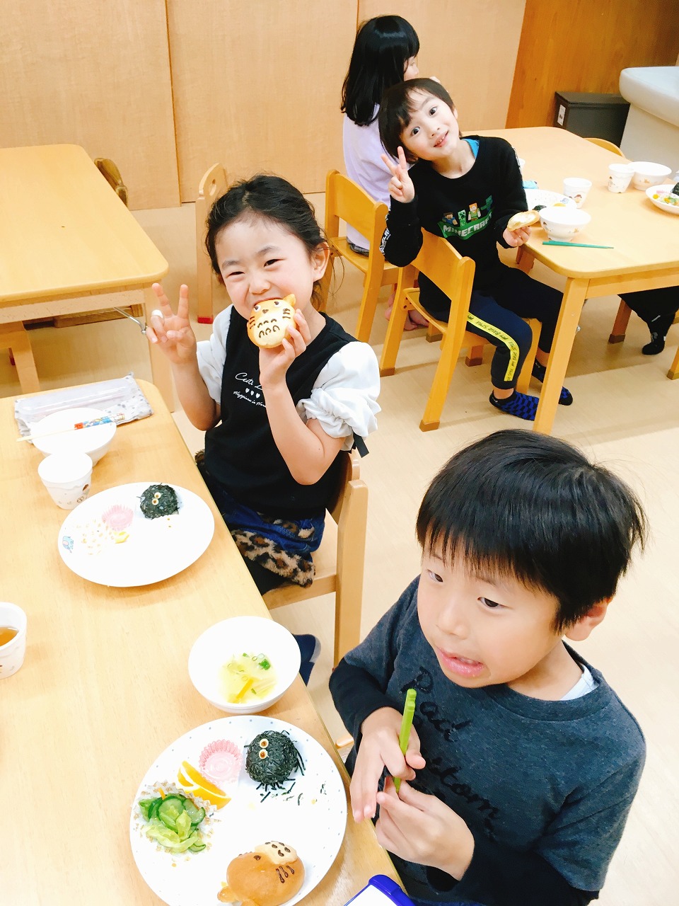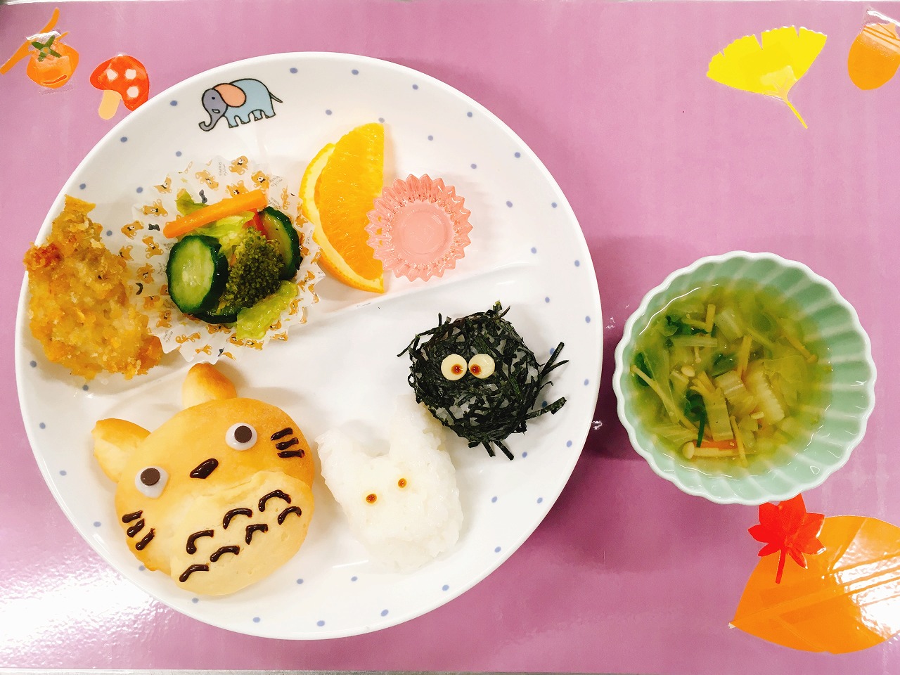 トトロはメロンパンで体を作り、ココアで顔を描きました。小トトロは塩おにぎり、まっくろくろすけはわかめおにぎりの周りにきざみのりを