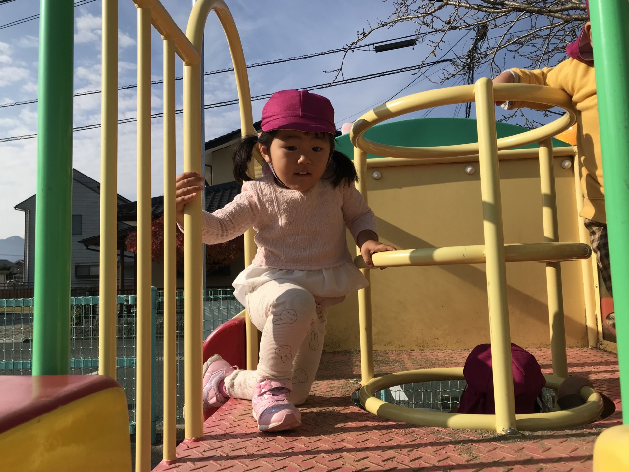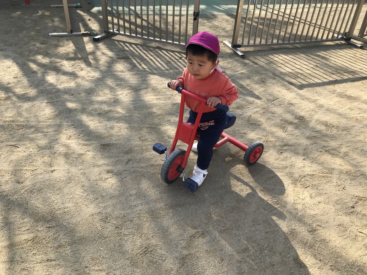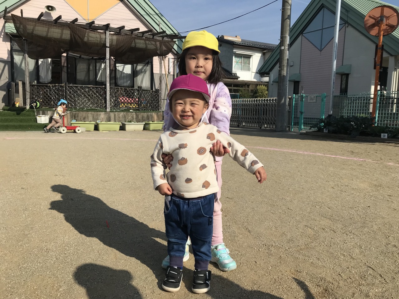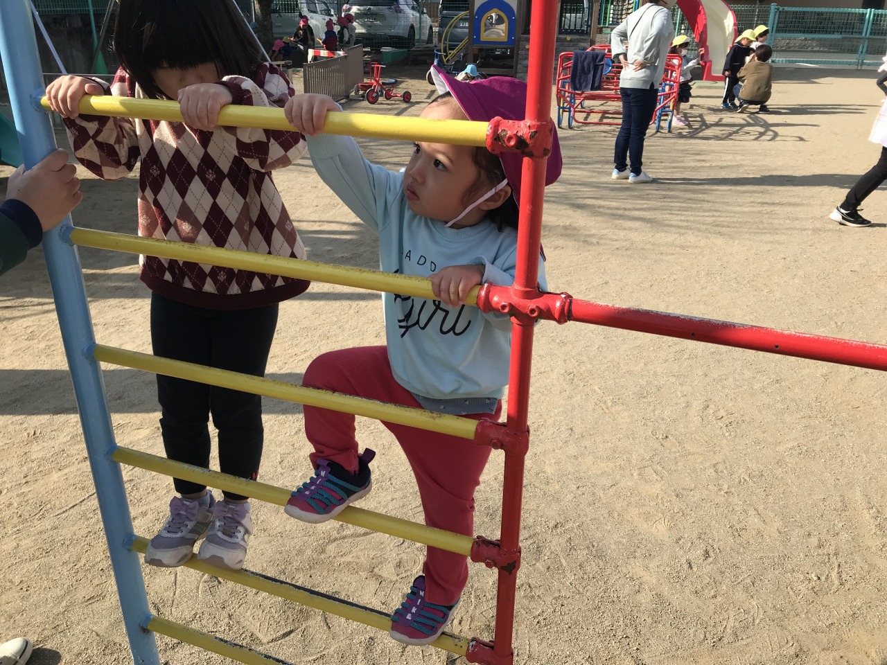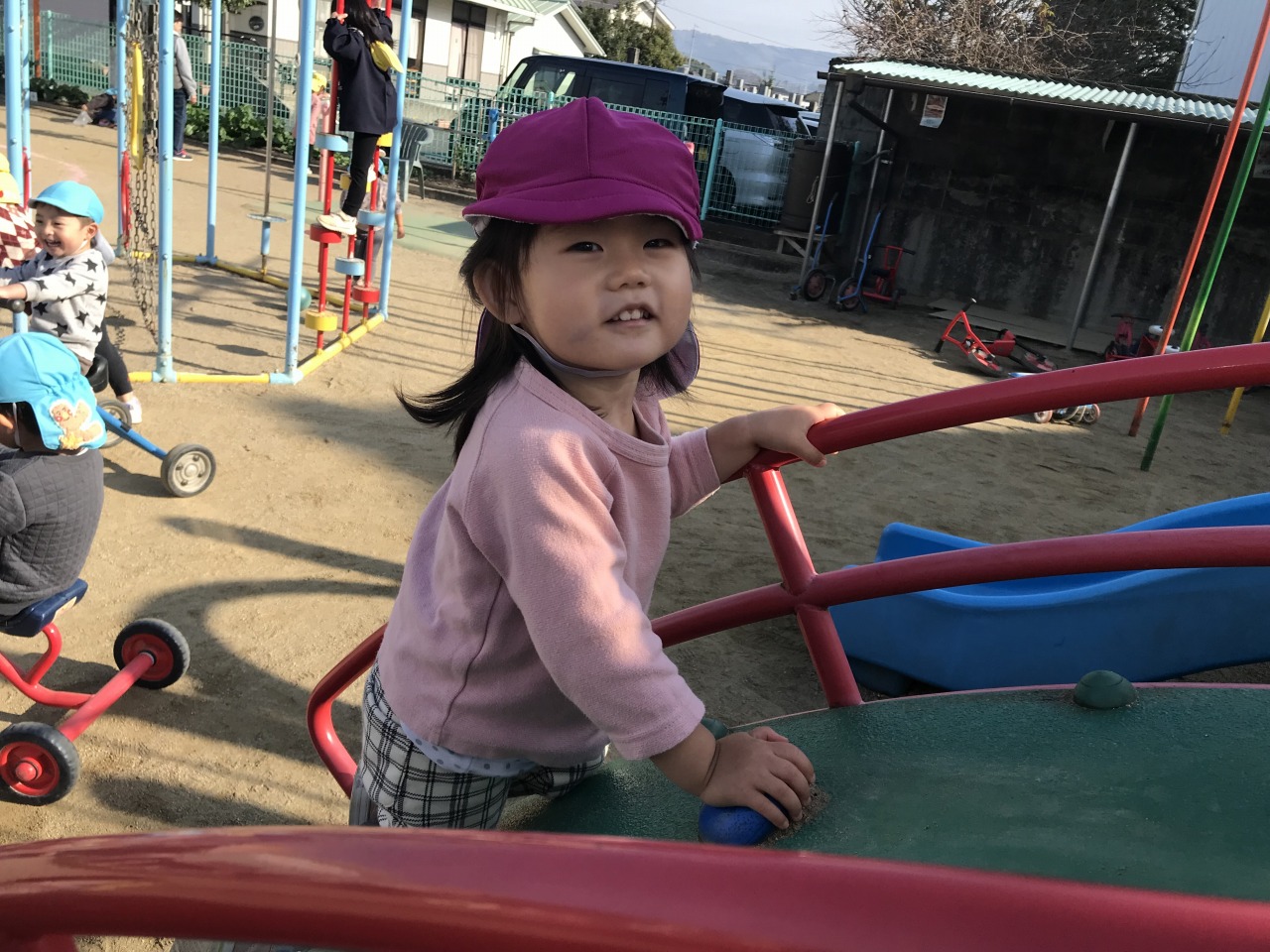 今日は日中は日差しもあり暖かく、戸外遊びを楽しむことができました。お外が大好きなすみれ組さんは、「お外に行きましょう」と言う保育士の声掛けで、帽子をかぶったり靴下を履いたりと自分で頑張って準備をしようとする姿が見られます。そして戸外では、チャレンジすることが大好きで、“せんせい、みてててね!”と言うように大型の遊具に登ったり自分ですべり台を滑っていったりと積極的に遊んでいます。できないことにチャレンジしてそれが達成できたときの嬉しそうな表情がとても可愛いです。以上児のお兄ちゃんお姉ちゃんもすみれ組さんを見ると一緒に遊んでくれました。たくさん身体を使って遊んで元気に過ごしたいです。お部屋でも好きな遊びを楽しむことができました。