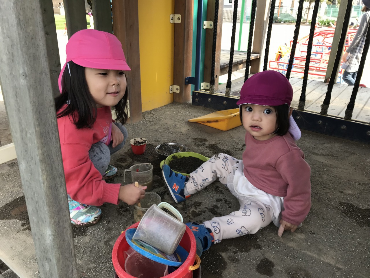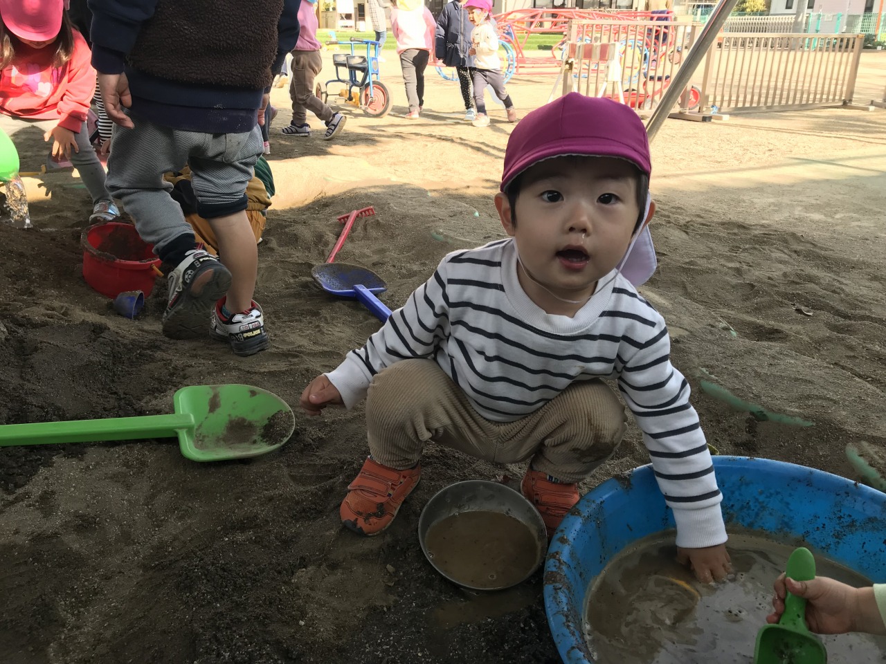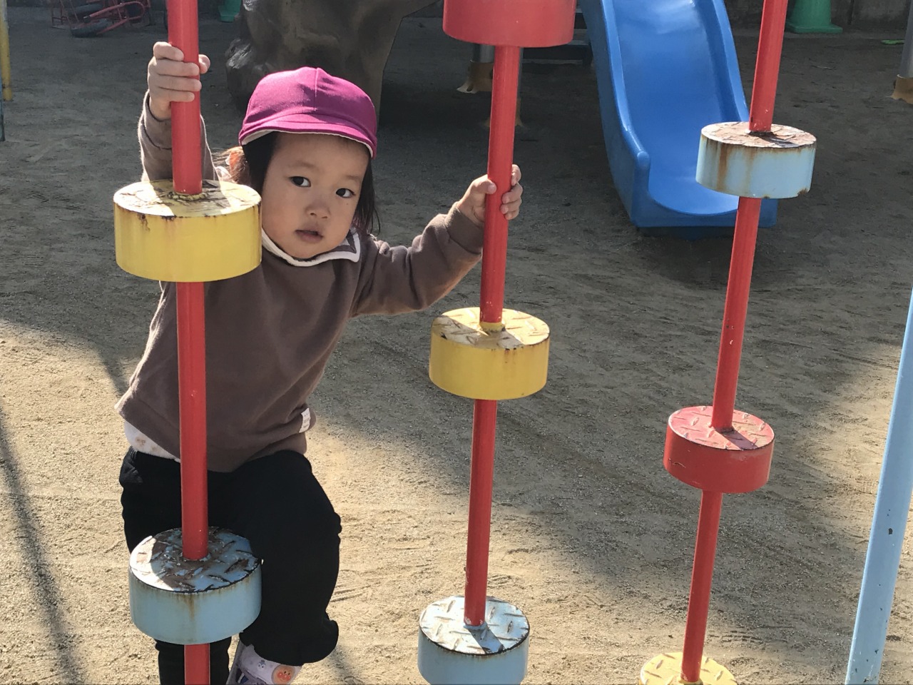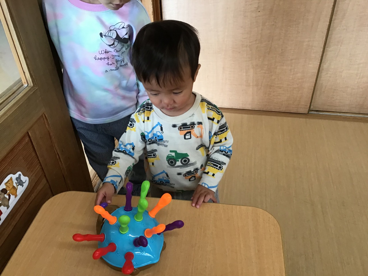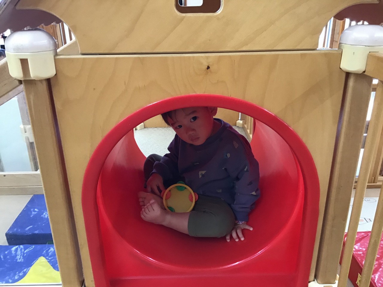 今日は日中は日差しもあり暖かく、戸外遊びを楽しむことができました。お外が大好きなすみれ組さんは、「お外に行きましょう」と言う保育士の声掛けで、帽子をかぶったり靴下を履いたりと自分で頑張って準備をしようとする姿が見られます。そして戸外では、チャレンジすることが大好きで、“せんせい、みてててね!”と言うように大型の遊具に登ったり自分ですべり台を滑っていったりと積極的に遊んでいます。できないことにチャレンジしてそれが達成できたときの嬉しそうな表情がとても可愛いです。以上児のお兄ちゃんお姉ちゃんもすみれ組さんを見ると一緒に遊んでくれました。たくさん身体を使って遊んで元気に過ごしたいです。お部屋でも好きな遊びを楽しむことができました。