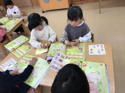 毎月の絵本に興味があり、絵本の世界を楽しんでいます。月間絵本はストーリーのある本ではなく生活や日常に関わるものも含まれていますので、興味や関心が持てるようクイズをだしたりしながら行っています。