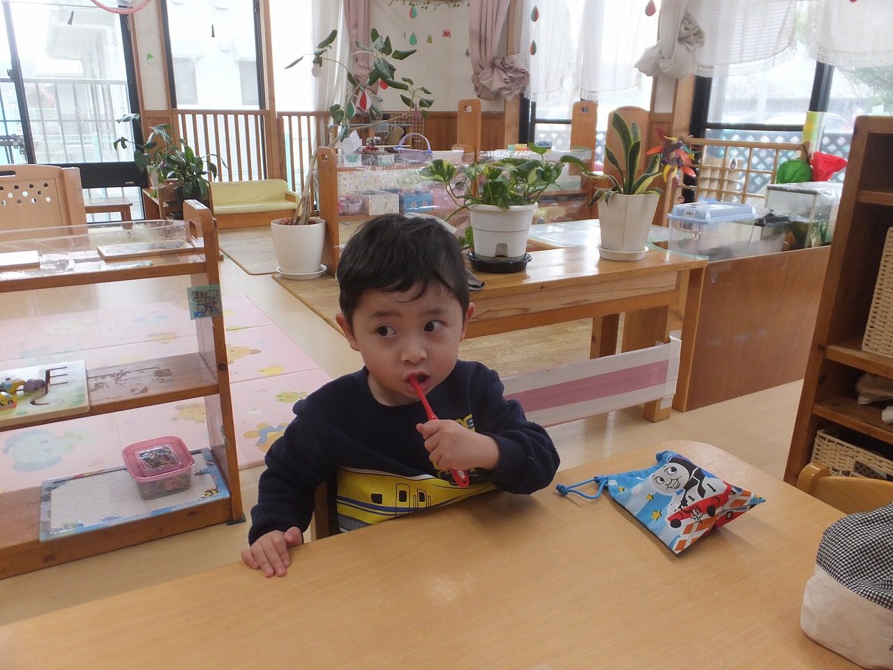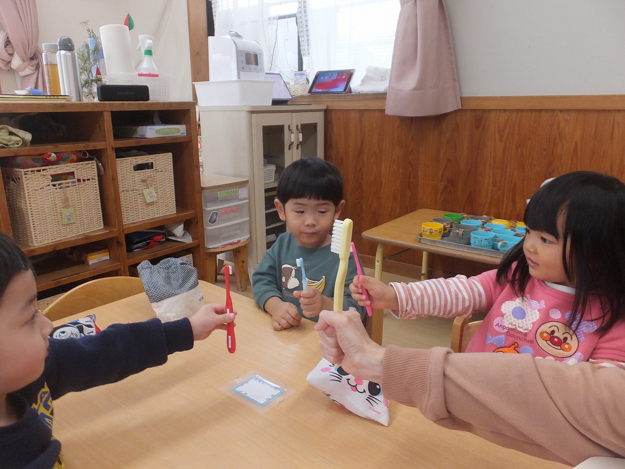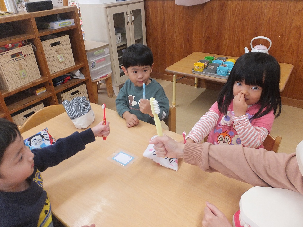 たんぽぽ組の歯みがき指導の2回目です。歯ブラシの持ちかた・磨き方・すすぎかたをお話しました。お家でもしているので、磨き方がとっても上手でした。早速、今日のお昼から開始しています。こっそり見に行くと「持つ手はグー」と言いながら磨いていました。「よくできてるね」と声をかけると笑顔の3人でした。