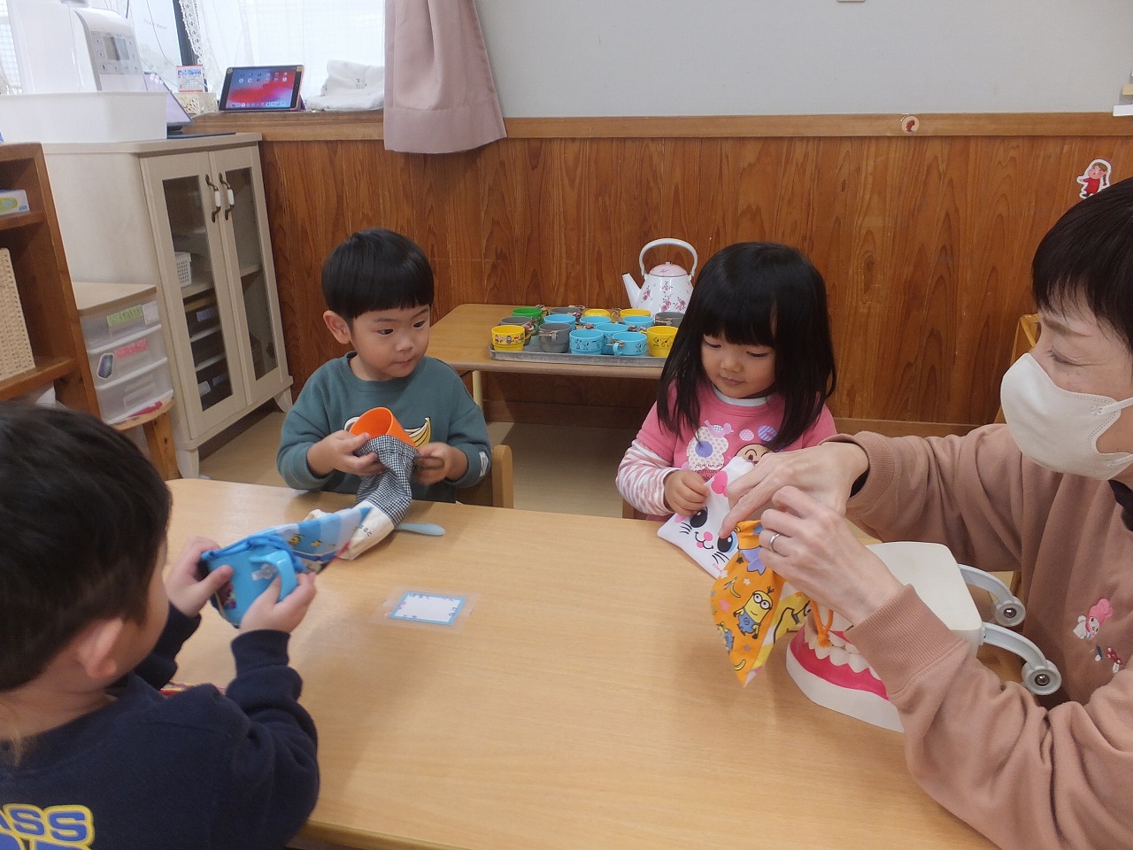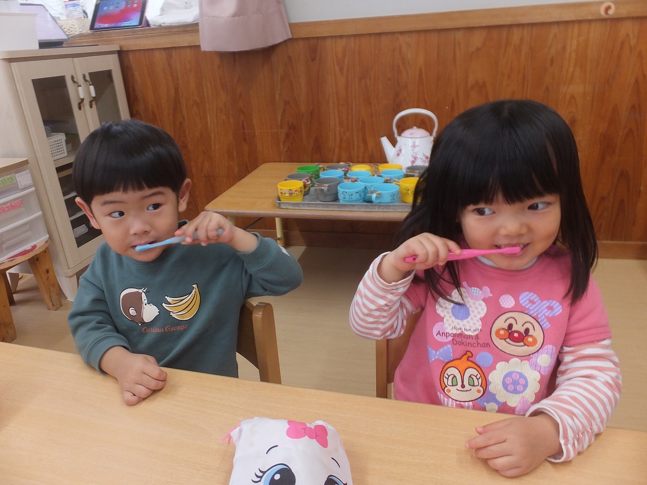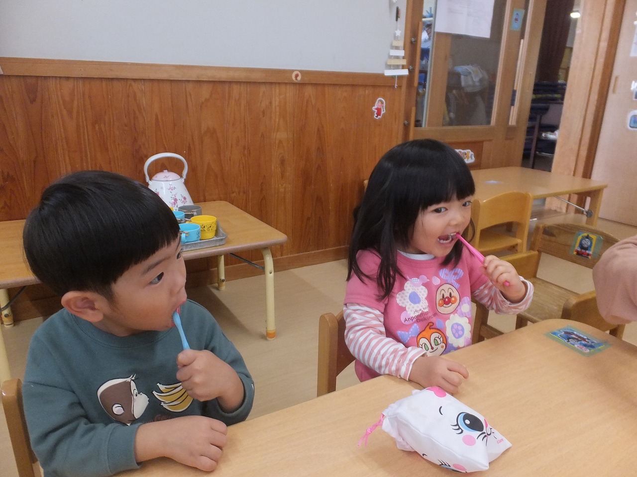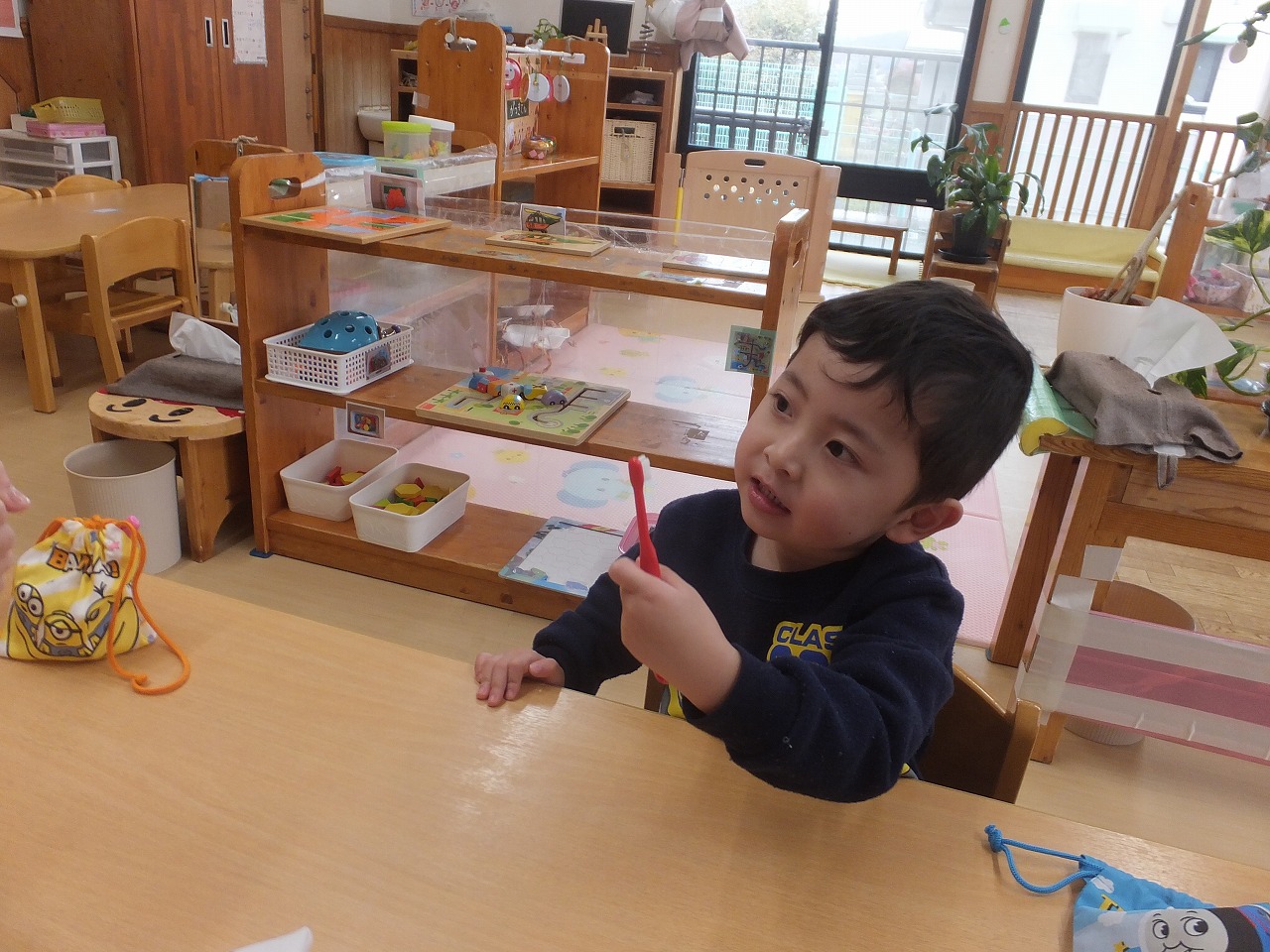 たんぽぽ組の歯みがき指導の2回目です。歯ブラシの持ちかた・磨き方・すすぎかたをお話しました。お家でもしているので、磨き方がとっても上手でした。早速、今日のお昼から開始しています。こっそり見に行くと「持つ手はグー」と言いながら磨いていました。「よくできてるね」と声をかけると笑顔の3人でした。