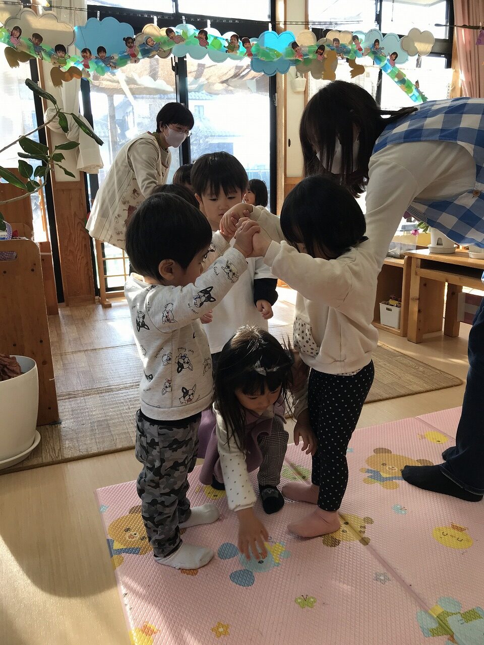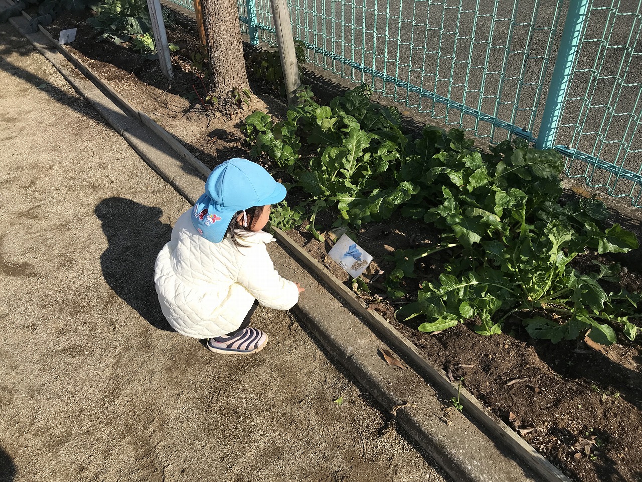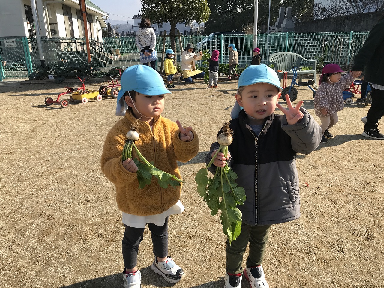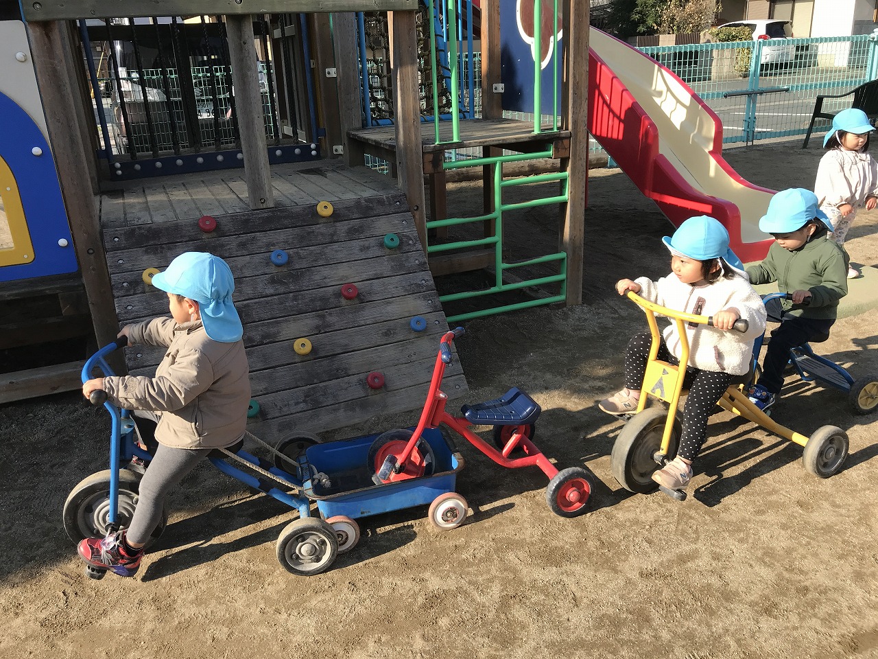 簡単なルールのある遊びを最近楽しんでいるたんぽぽ組さん(2歳児)。昨日は「かごめかごめ」「はないちもんめ」をして遊びました。今日は「ろんどんばしがおちる」をみんなでしてみました。ルールが簡単なので、すぐに覚えて楽しむ子ども達でした。少しずつみんなで楽しめる遊びを増やしていきたいです。その後は戸外で元気に遊びました。カブやブロッコリーなどの野菜がたくさんなっていたので、興味のある子は収穫を手伝ってくれました。子ども達同士で三輪車に乗って遊んだり、砂場でおままごとをしてたくさん遊びました。大型遊具での遊びも活発になってきた子ども達です。今年もお世話になりました。子ども達の成長を保護者の方々と見守ることができ嬉しく思います。また来年もよろしくお願い致します。