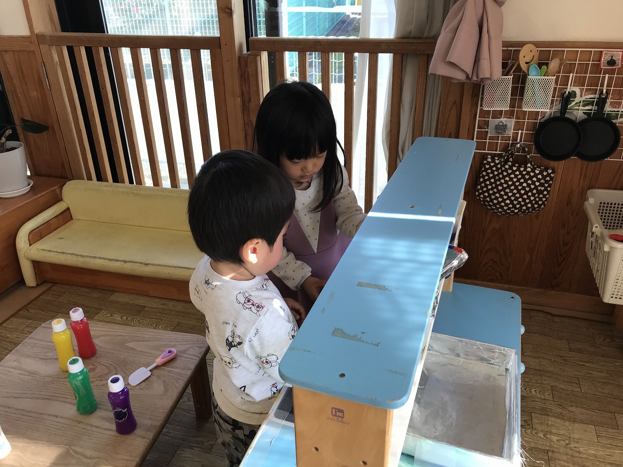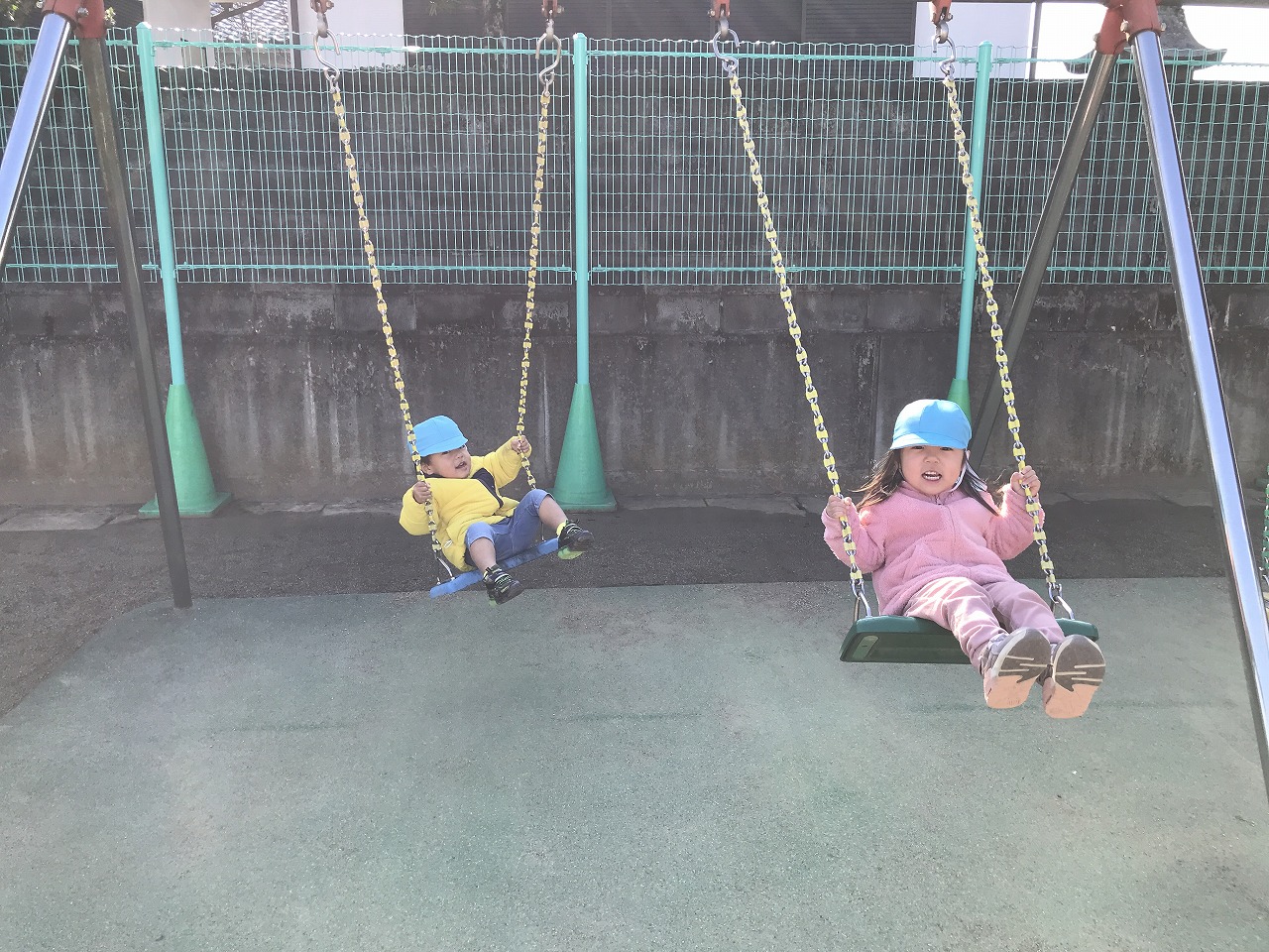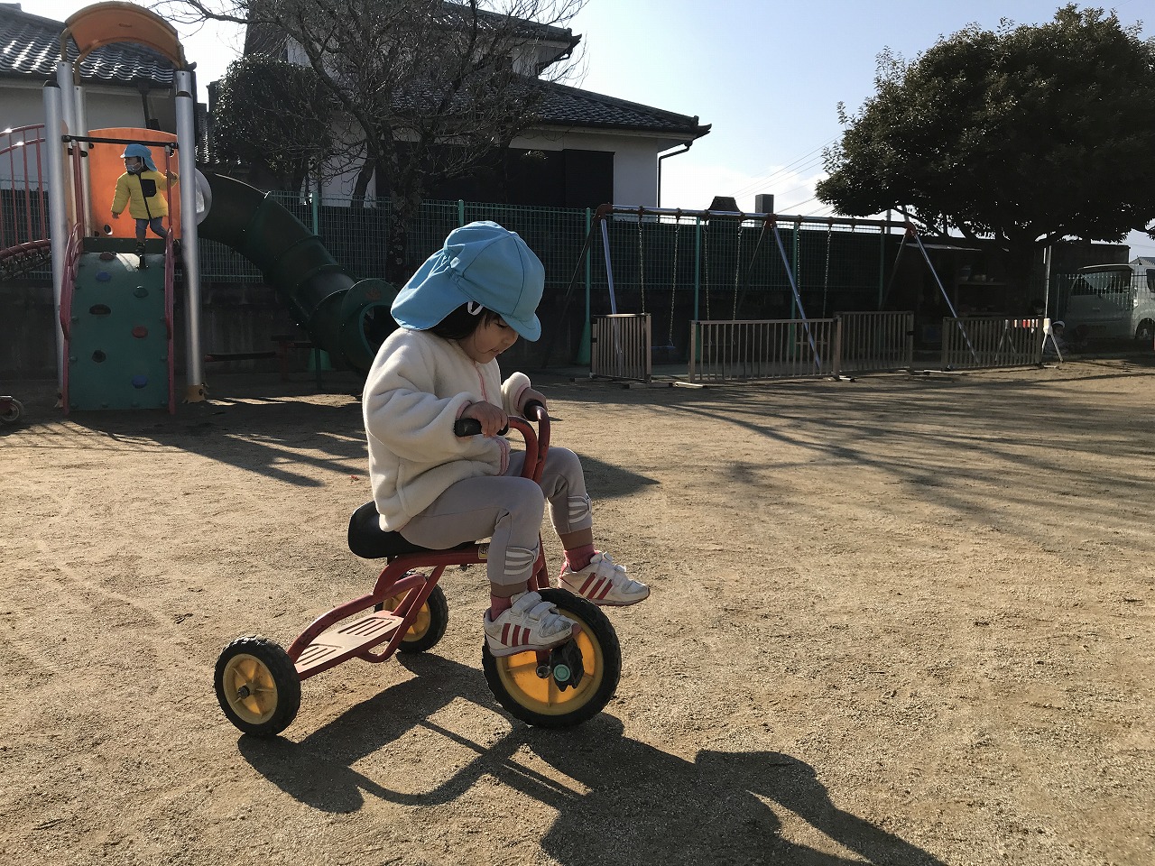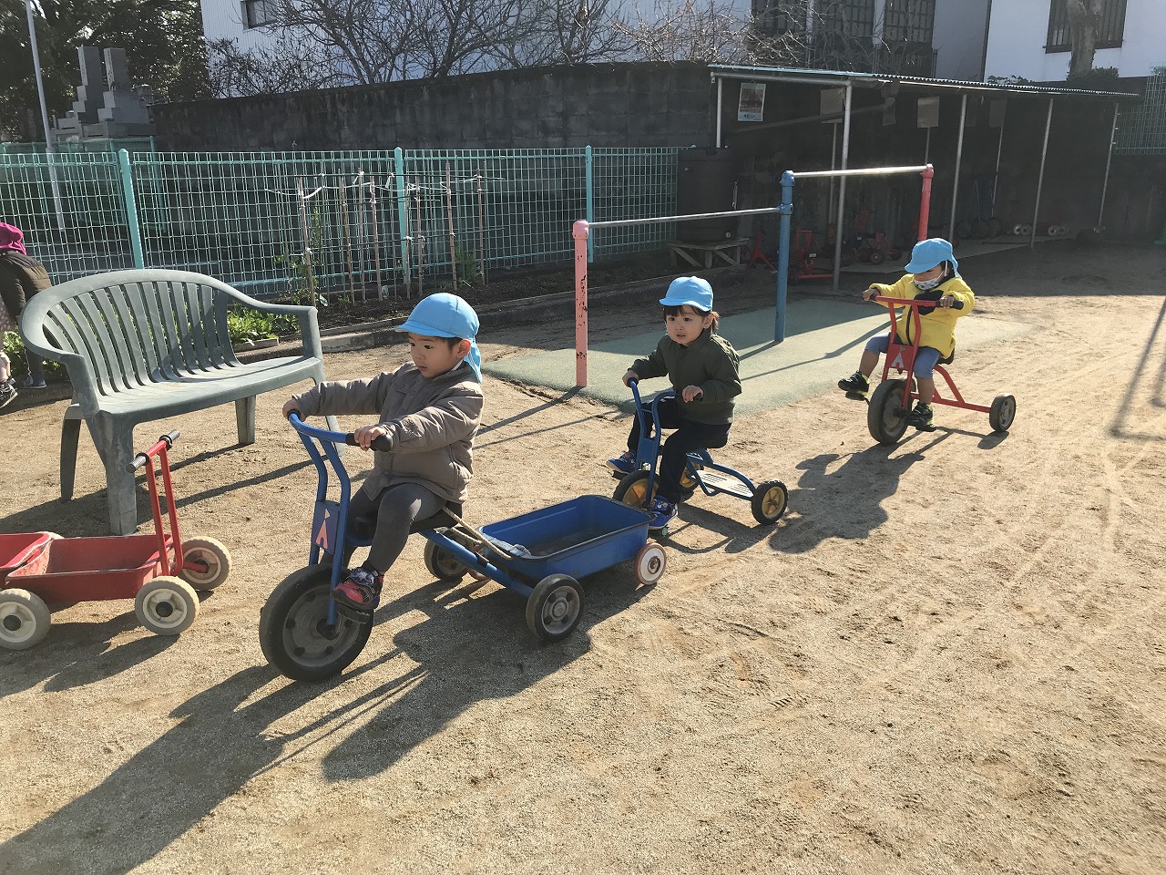 簡単なルールのある遊びを最近楽しんでいるたんぽぽ組さん(2歳児)。昨日は「かごめかごめ」「はないちもんめ」をして遊びました。今日は「ろんどんばしがおちる」をみんなでしてみました。ルールが簡単なので、すぐに覚えて楽しむ子ども達でした。少しずつみんなで楽しめる遊びを増やしていきたいです。その後は戸外で元気に遊びました。カブやブロッコリーなどの野菜がたくさんなっていたので、興味のある子は収穫を手伝ってくれました。子ども達同士で三輪車に乗って遊んだり、砂場でおままごとをしてたくさん遊びました。大型遊具での遊びも活発になってきた子ども達です。今年もお世話になりました。子ども達の成長を保護者の方々と見守ることができ嬉しく思います。また来年もよろしくお願い致します。