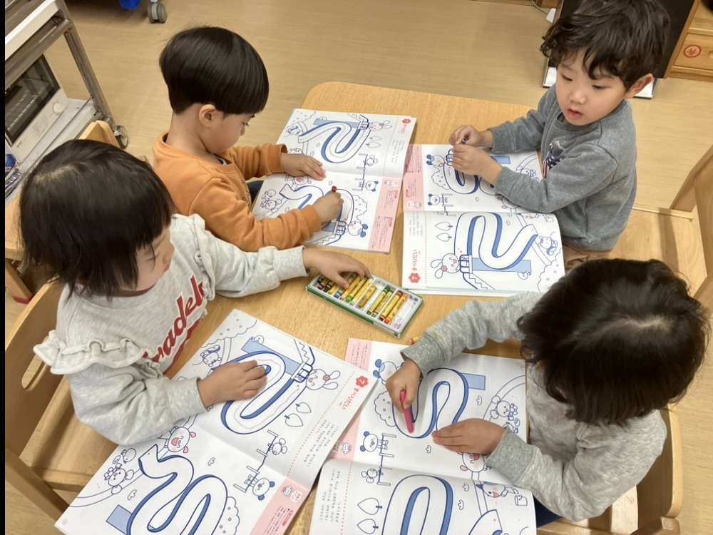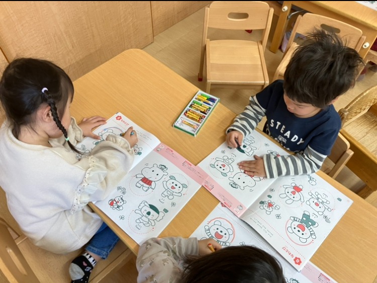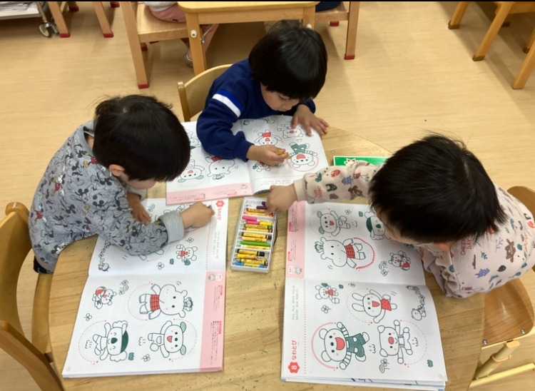 その後、うめ組(3歳児)は、「線のワーク」をしました。曲線、半円、楕円を描きました。クレパスを持ち、楽しく取り組むことができました。