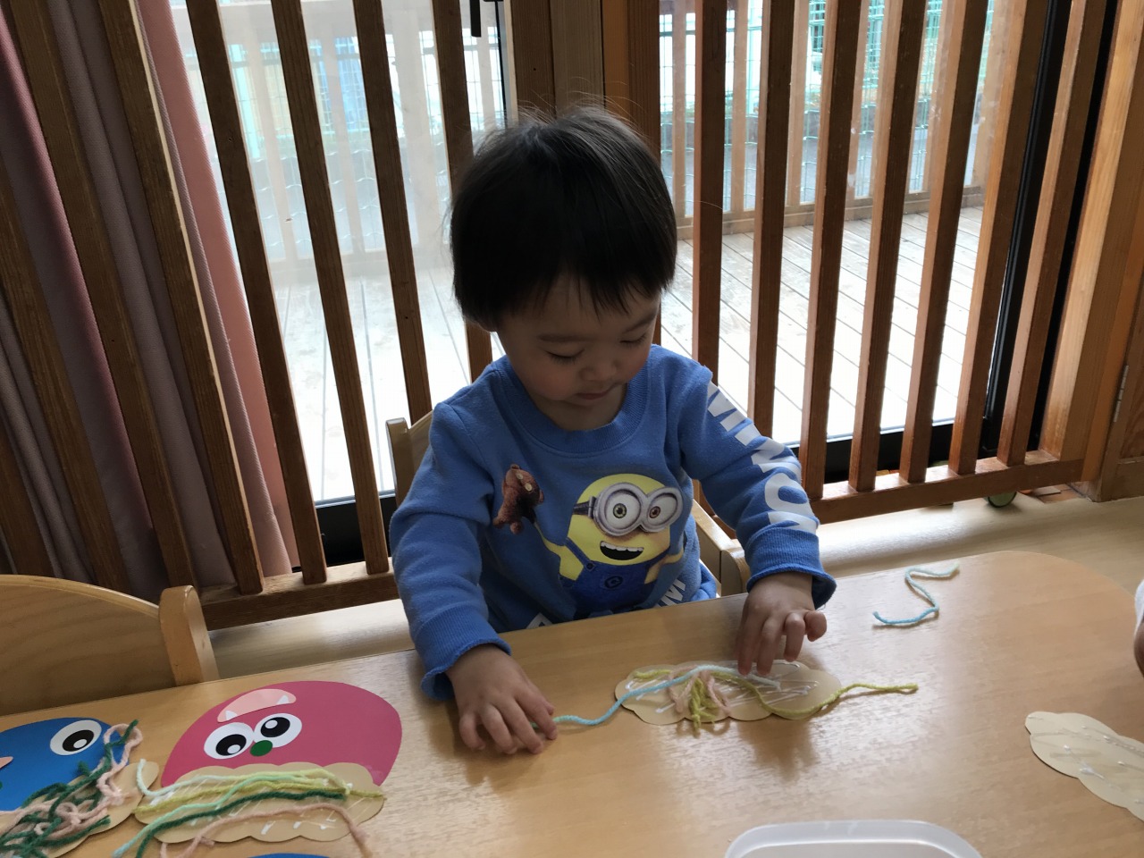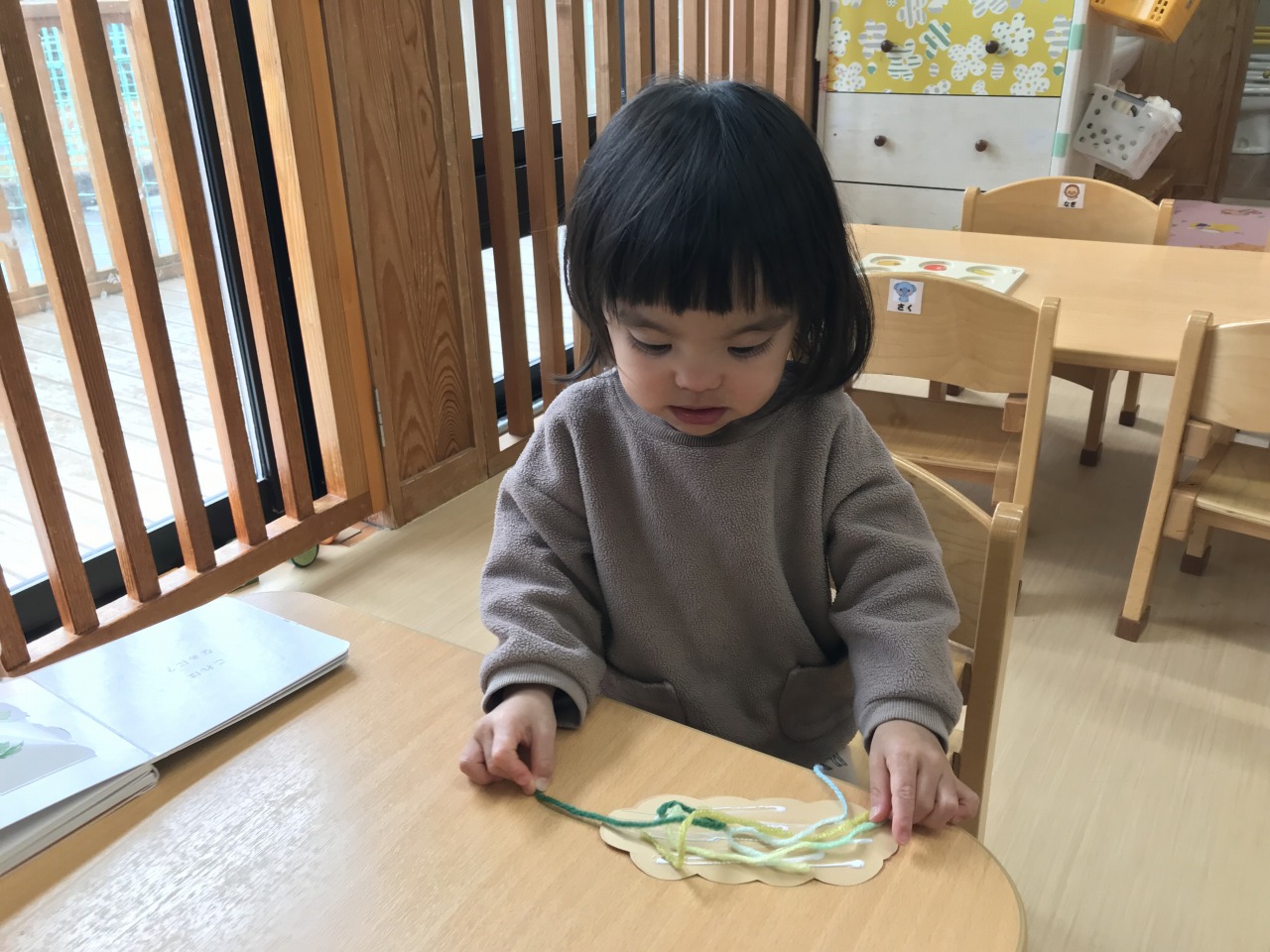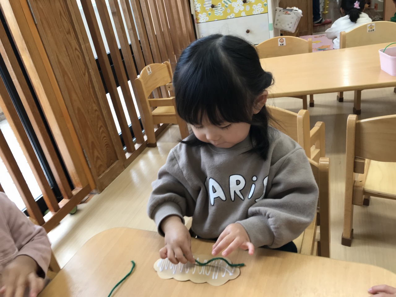 来月は節分があるので、すみれ組でも少しずつお面の制作に取り組んでいます。お集りで絵本を読んだり歌をうたったりしながら制作も楽しめるようにしています。今日は毛糸で鬼の髪の毛を貼ったり、目や口のシール貼りをしました。お友だちがしている様子を見て自分から「したい」と言ってくる姿もありました。「順番にしようね」というと待つこともできるようになっているすみれ組さんです。鬼のお面の完成が楽しみです。