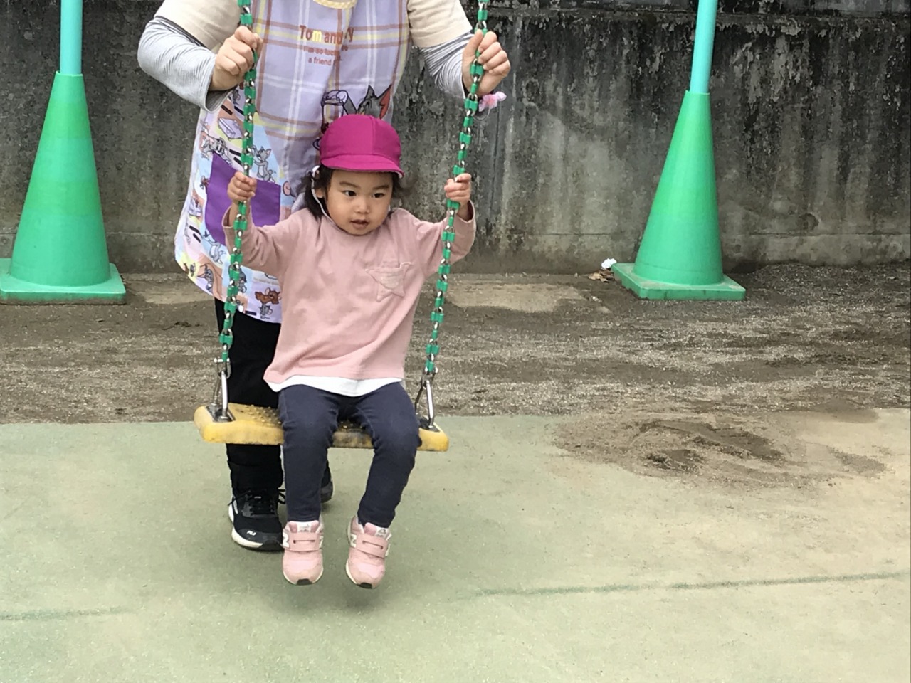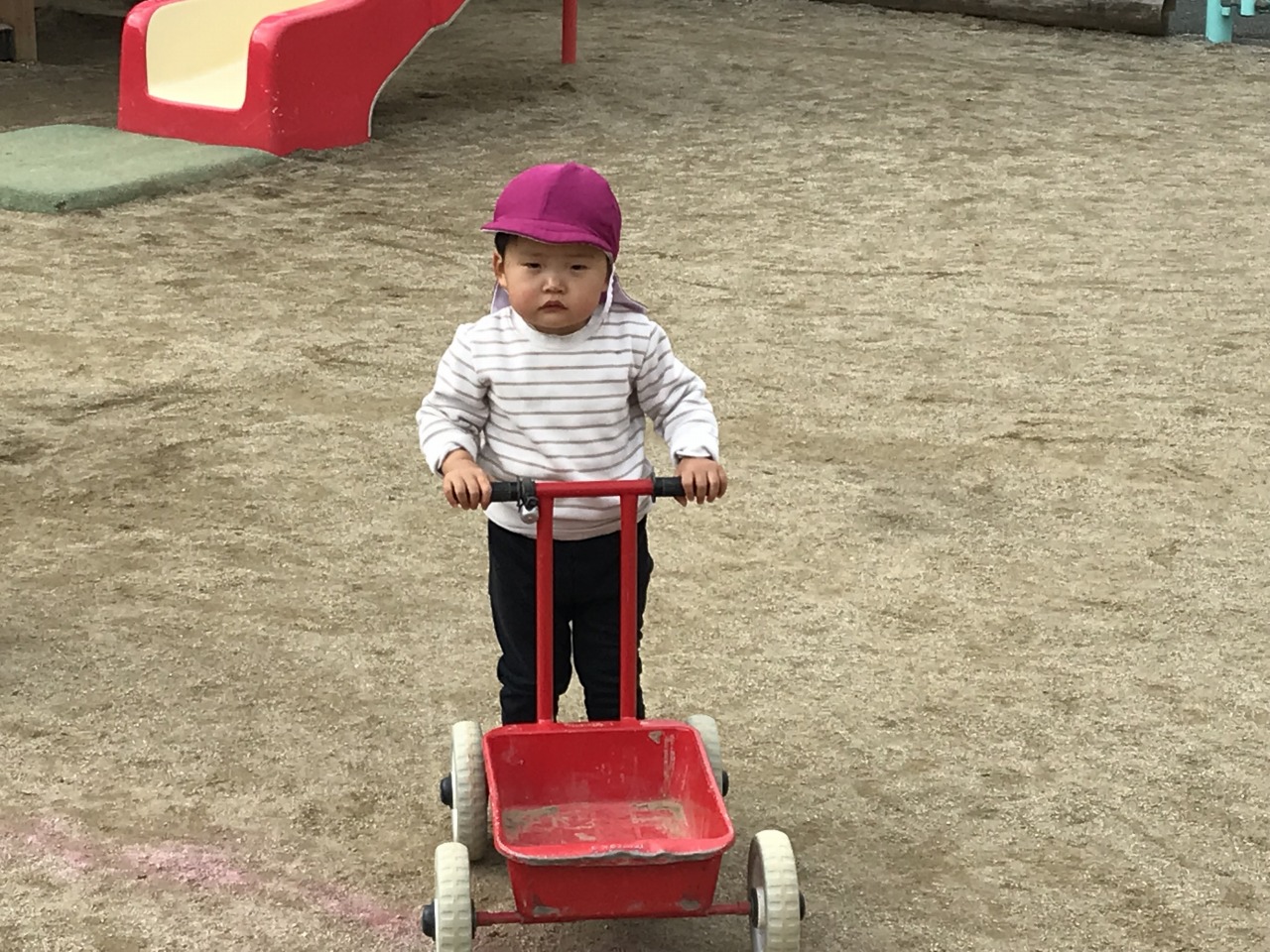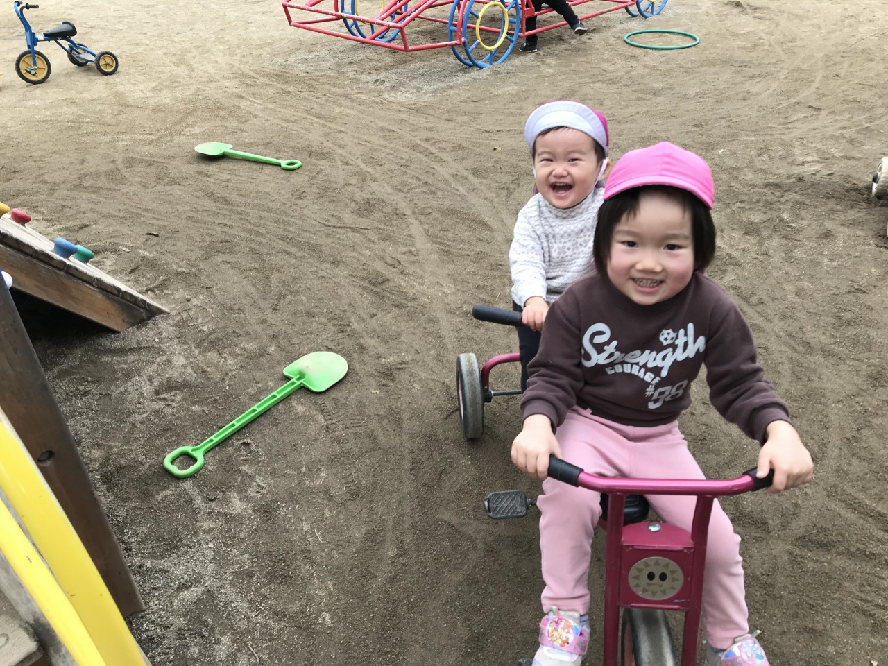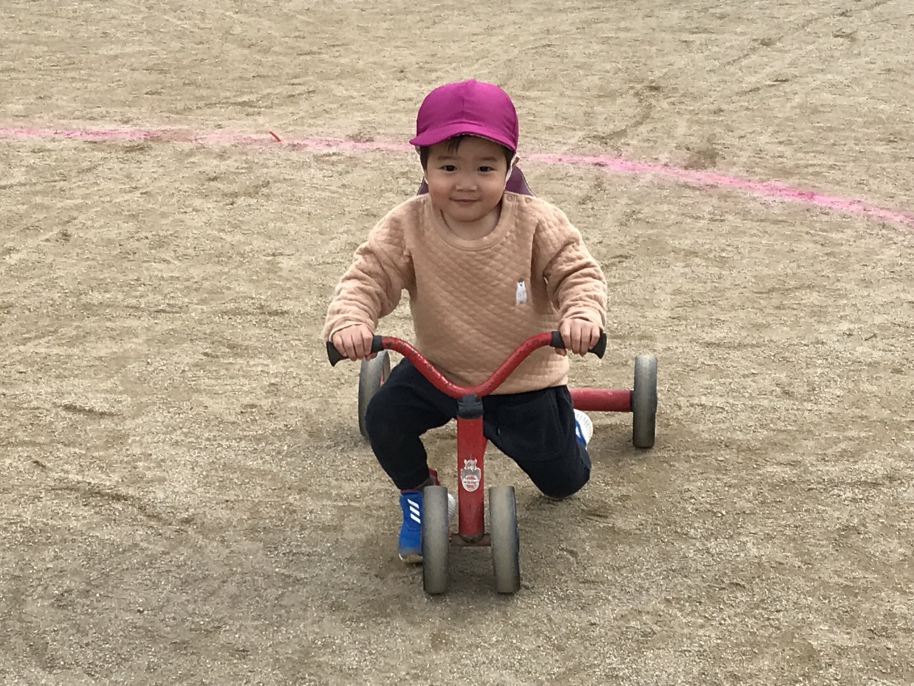 お外では、三輪車や遊具など好きな場所で遊びを楽しむことができました。お兄ちゃんお姉ちゃんが一緒に遊んでくれたりお世話をしてくれるのでみんなとても嬉しそうです。自分でできることが増えてきて“やってみたい”意欲が高まっている様子が遊びの姿から感じられます。好きなことを楽しみながら心も身体もたくましく成長しています。
