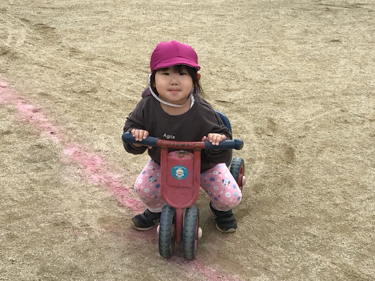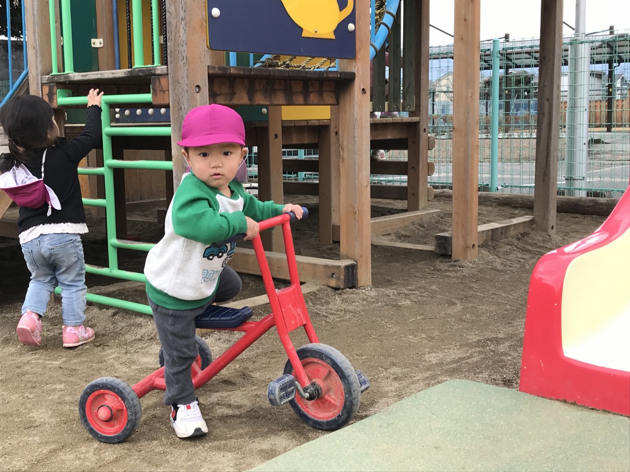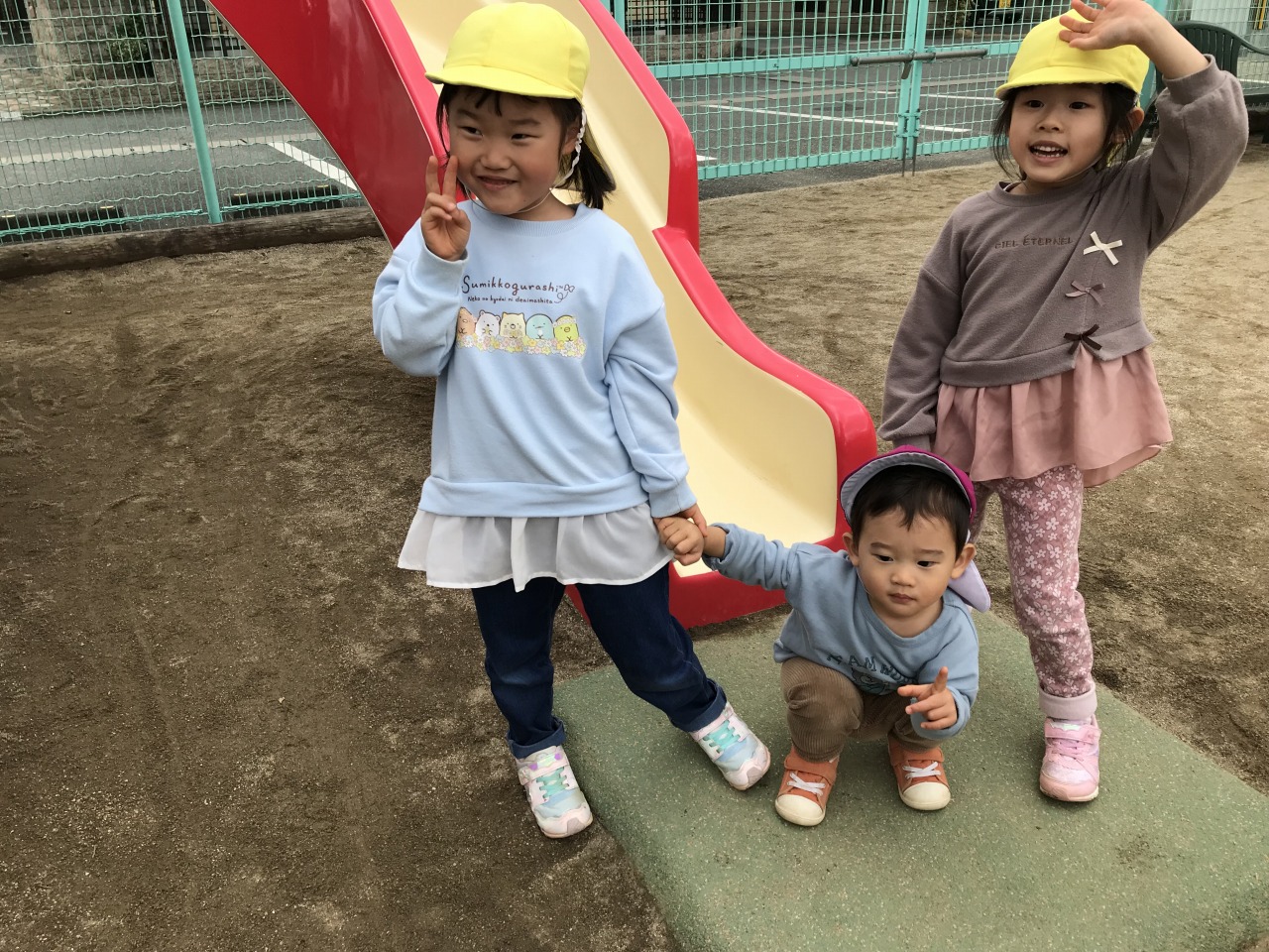 お外では、三輪車や遊具など好きな場所で遊びを楽しむことができました。お兄ちゃんお姉ちゃんが一緒に遊んでくれたりお世話をしてくれるのでみんなとても嬉しそうです。自分でできることが増えてきて“やってみたい”意欲が高まっている様子が遊びの姿から感じられます。好きなことを楽しみながら心も身体もたくましく成長しています。
