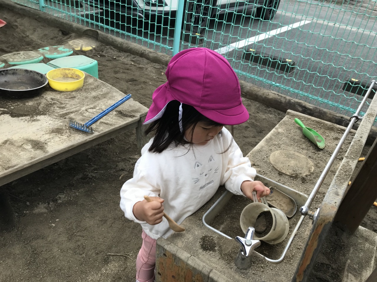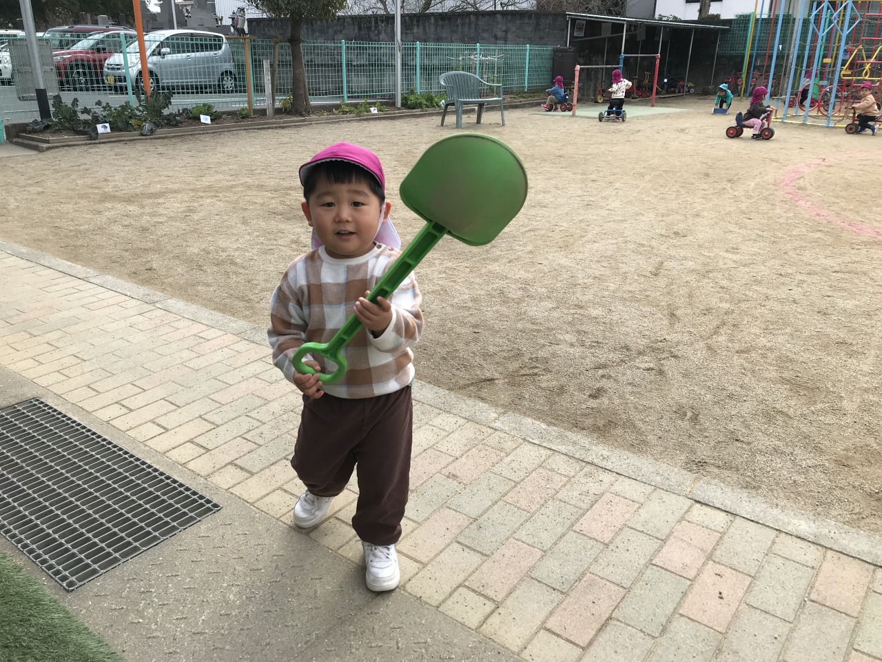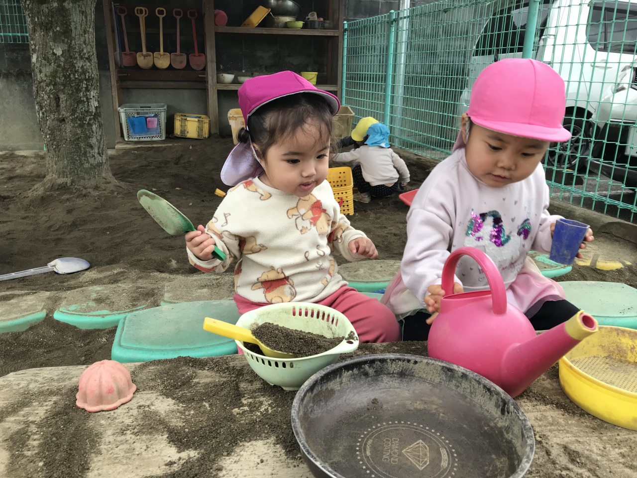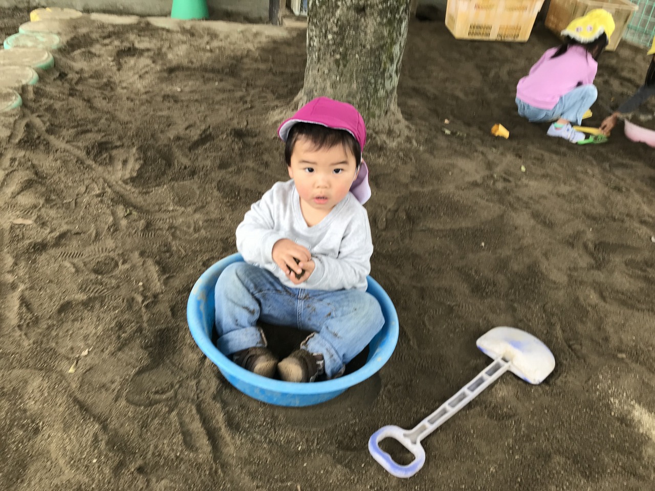お外では、三輪車や遊具など好きな場所で遊びを楽しむことができました。お兄ちゃんお姉ちゃんが一緒に遊んでくれたりお世話をしてくれるのでみんなとても嬉しそうです。自分でできることが増えてきて“やってみたい”意欲が高まっている様子が遊びの姿から感じられます。好きなことを楽しみながら心も身体もたくましく成長しています。