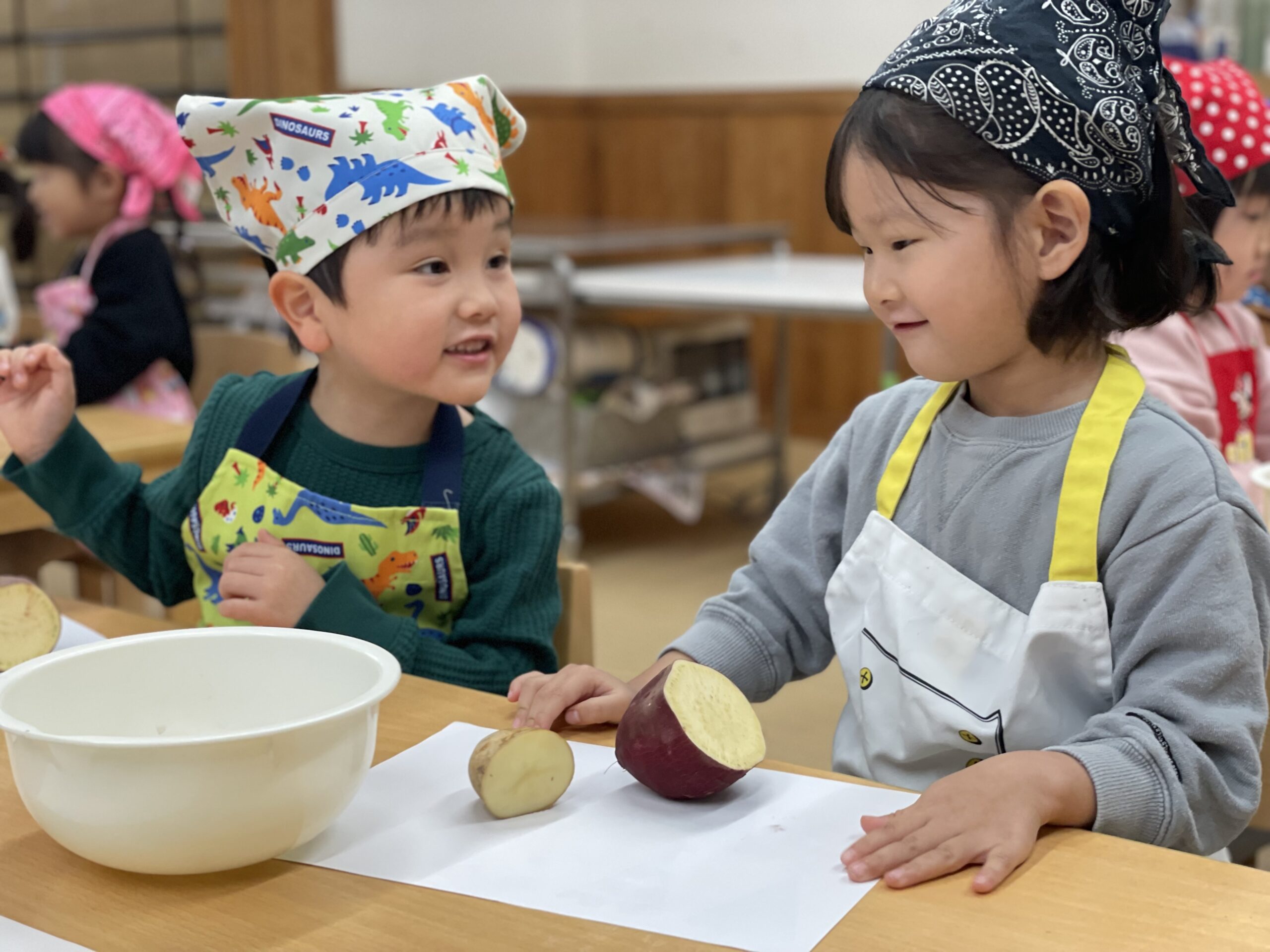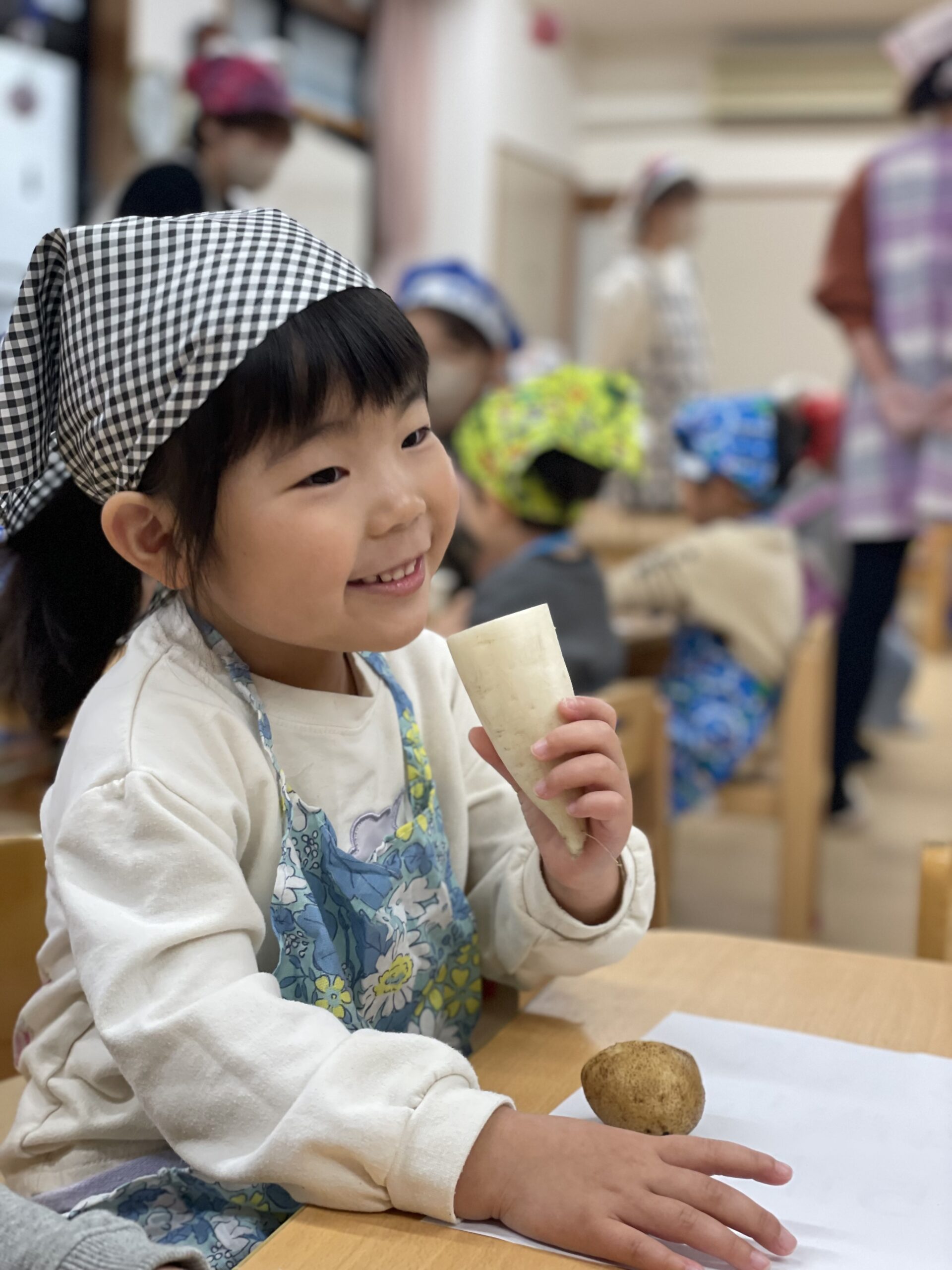 今日は、3・4・5歳児のお友達とおでん作りを楽しみました。先日、もも組(5歳児)さんが園の畑から収穫した大きな大根を使いました!他には、サツマイモ、ゴボウ、ニンジン、厚揚げ、ジャガイモ、卵と沢山の野菜や材料を調理してもらいました。