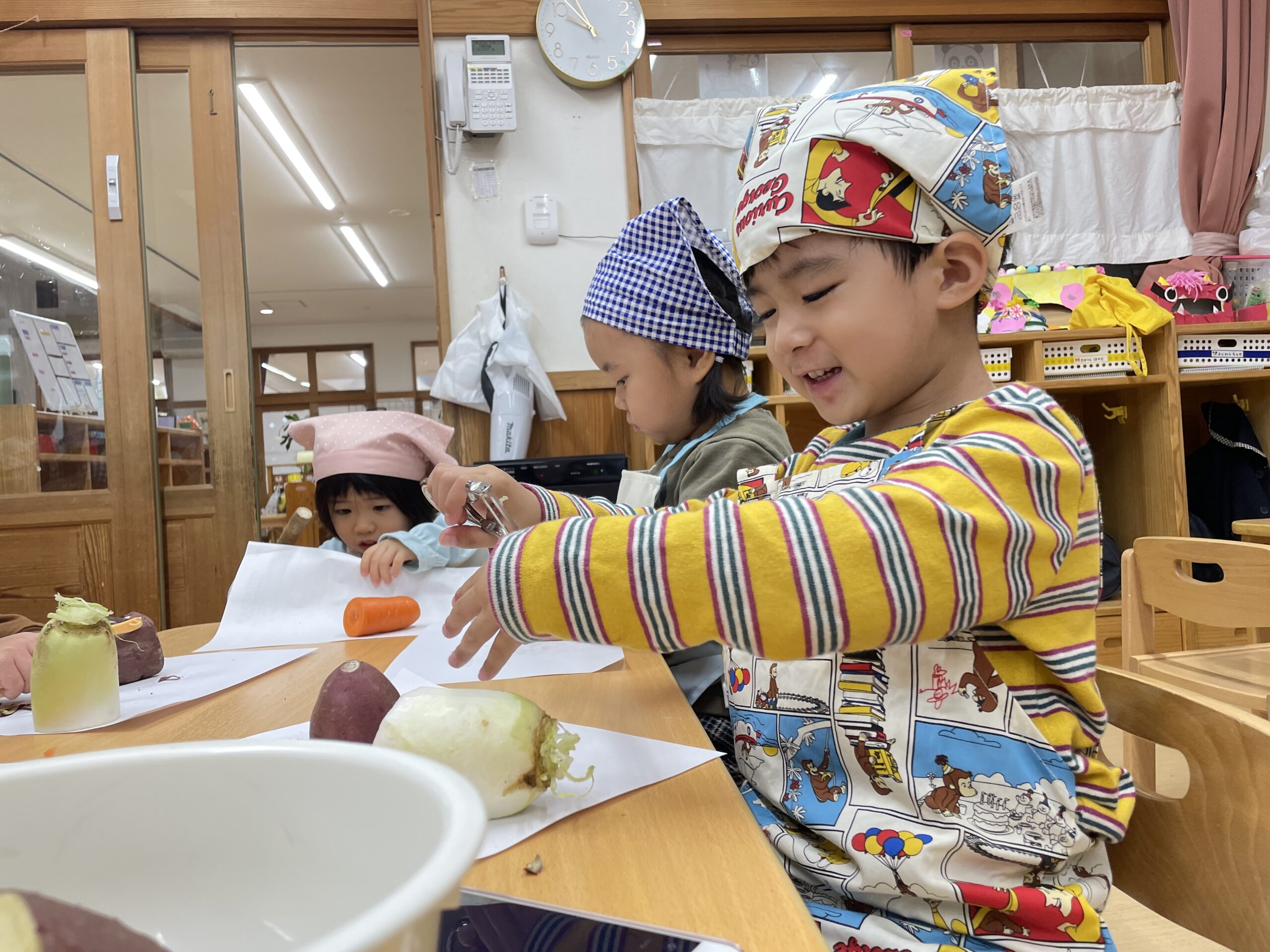 うめ組(3歳児)さんは野菜の皮むきをしてもらいました。ピーラーを使って皮をむきました。ピーラーを当てる角度がとっても大事。難しい作業でしたがコツを掴んで綺麗に皮を剝いてくれました!