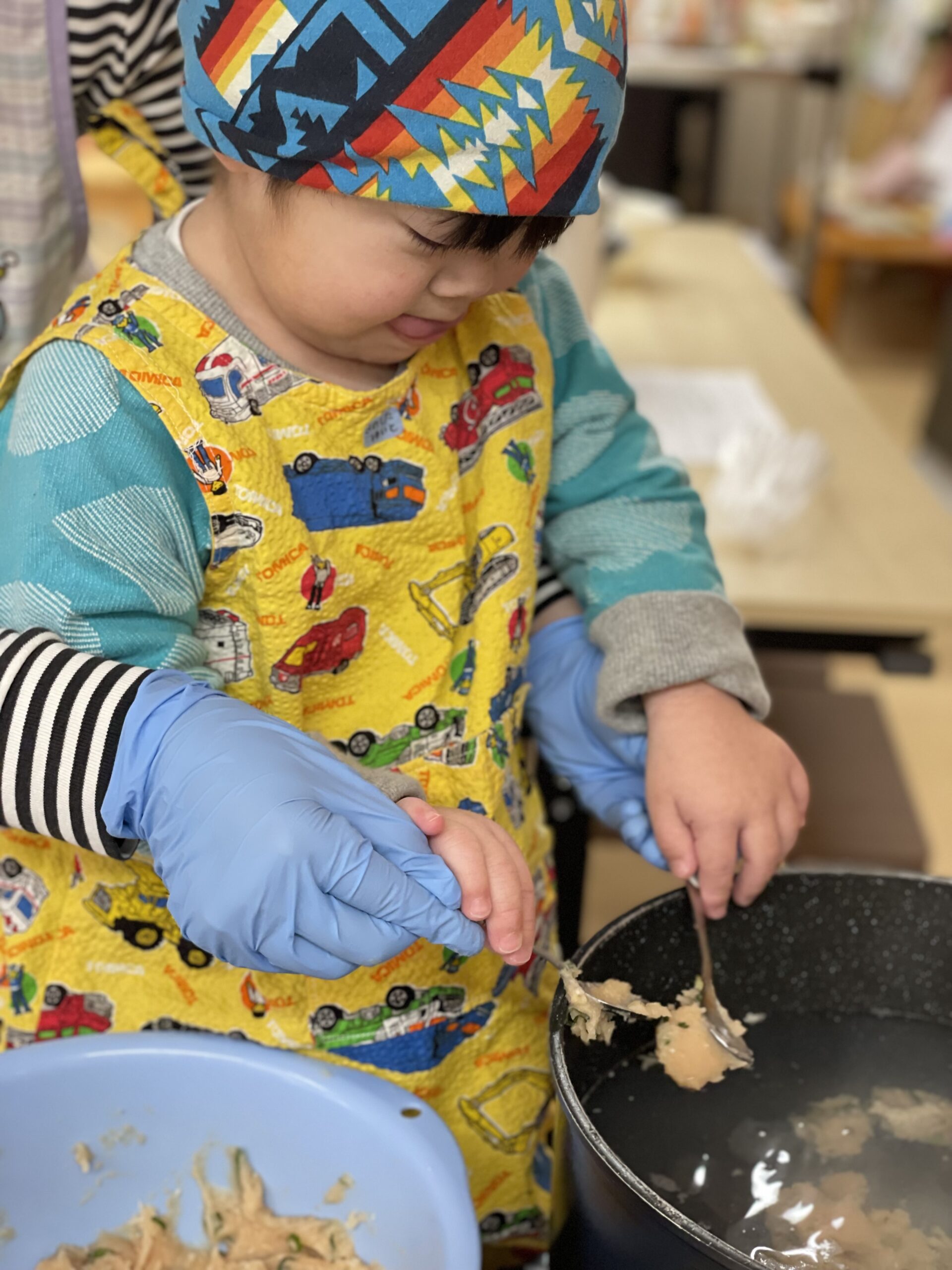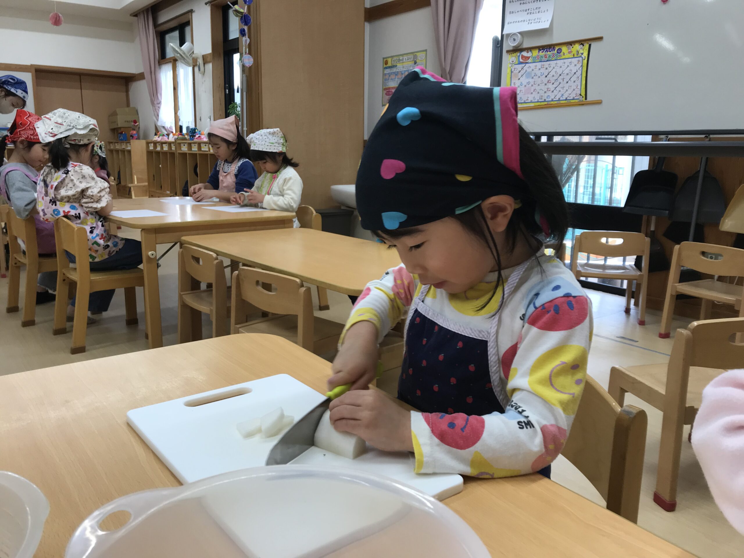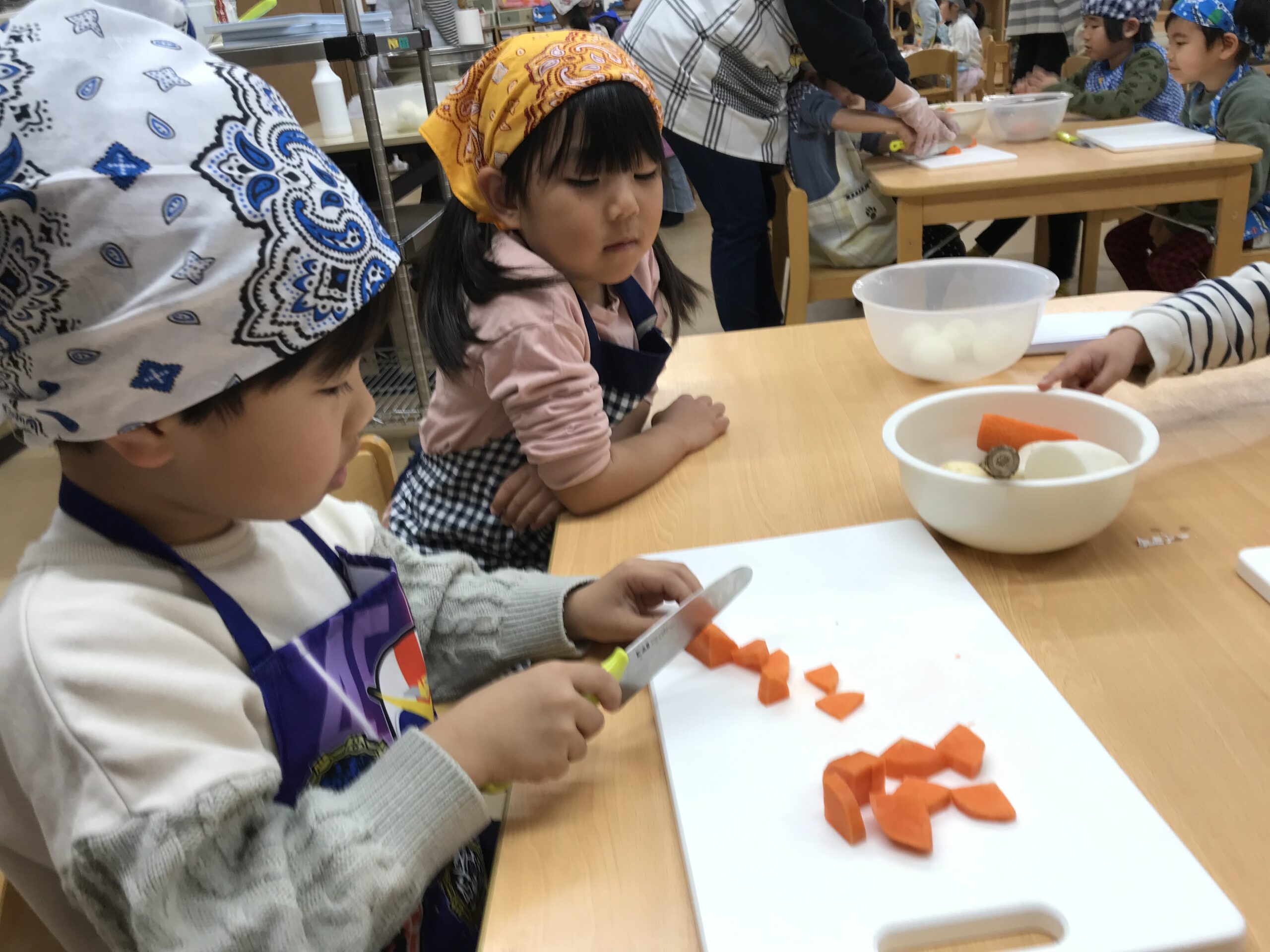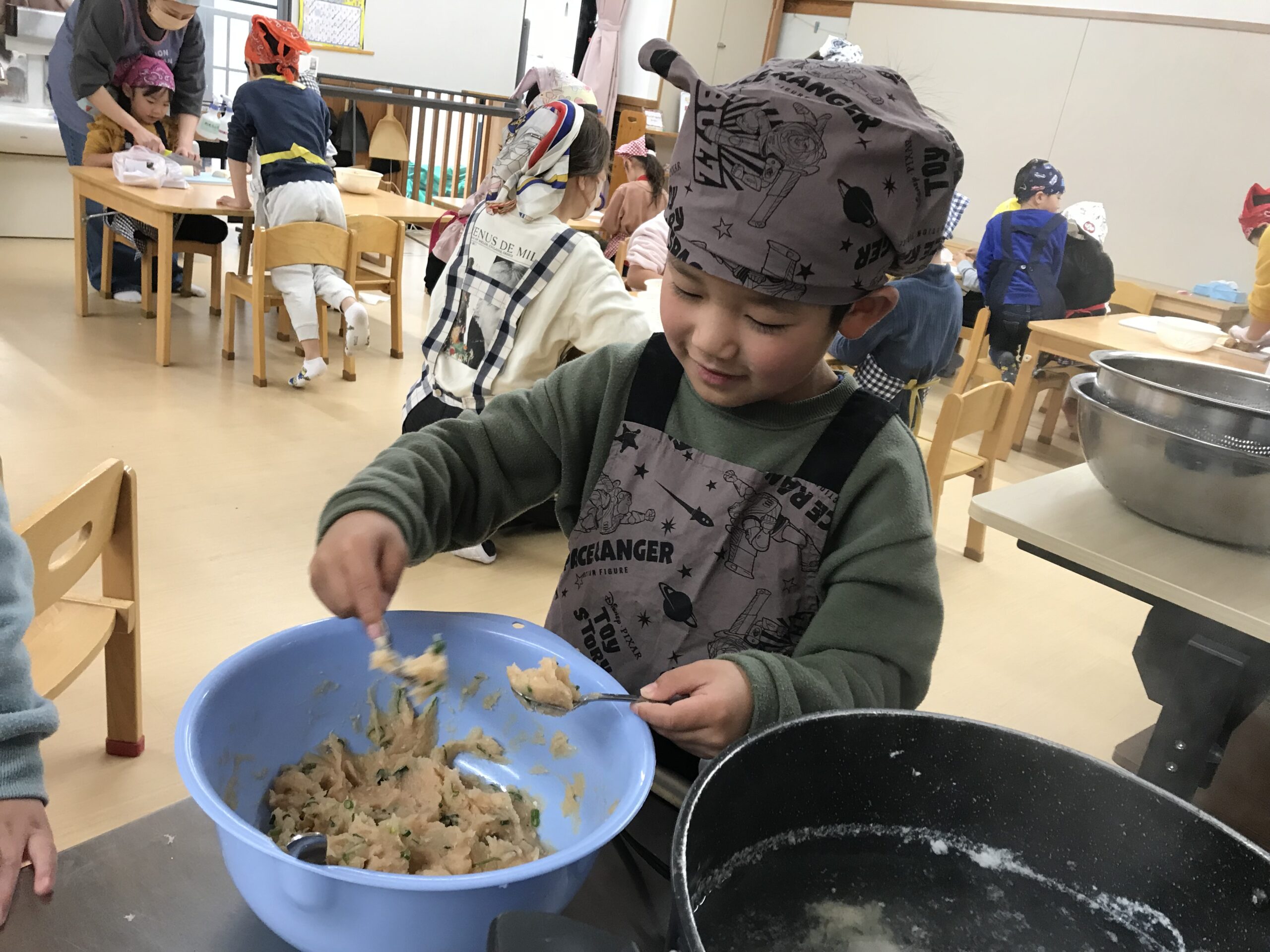 もも組(5歳児)さんは、野菜を切ったり卵を剥いたり、つみれを作ったりと色々な作業をしてもらいました。包丁の使い方がとっても上手になり、手際よく切ってくれました!つみれもスプーンを使って上手に形にしていましたよ!
