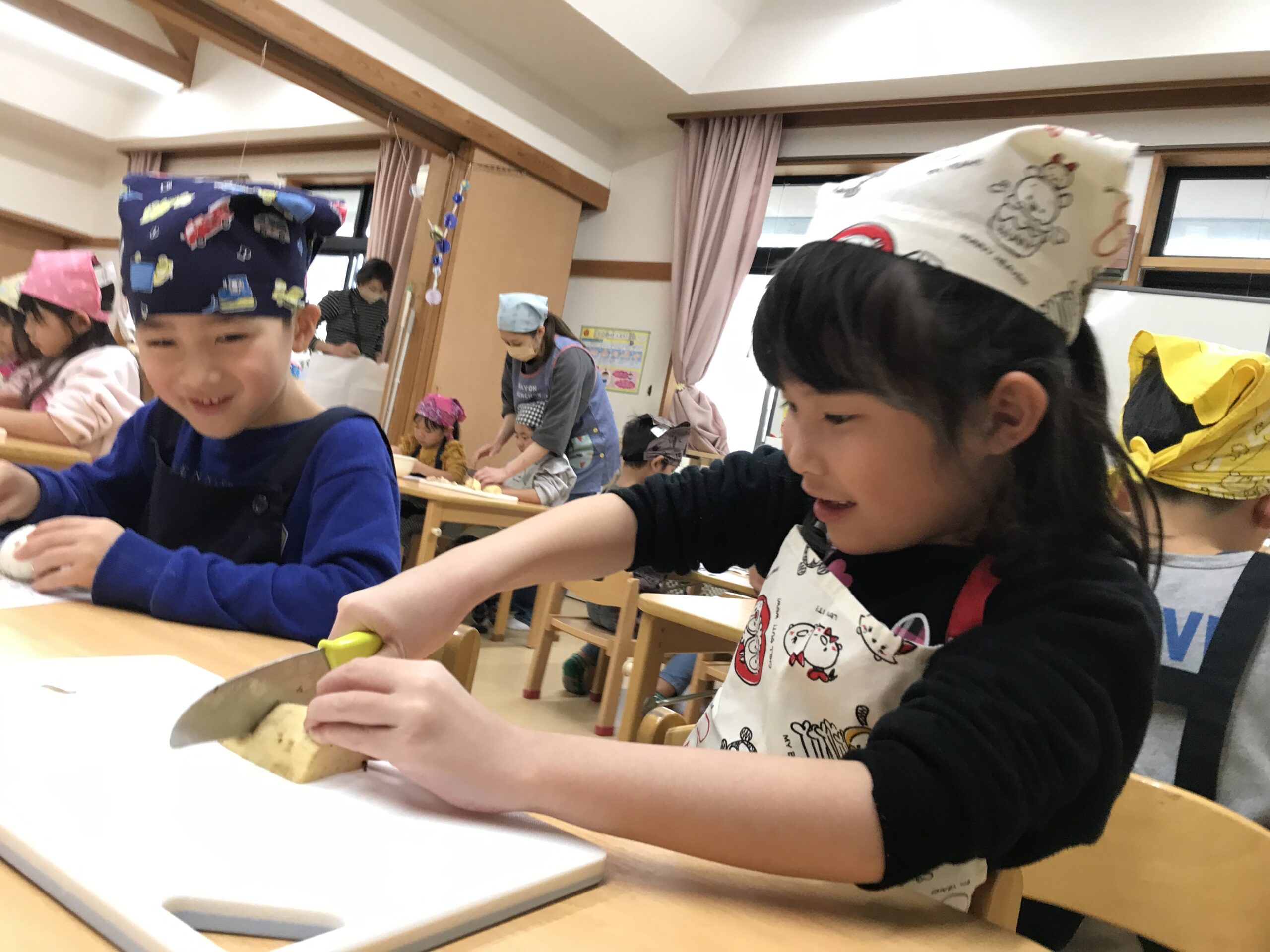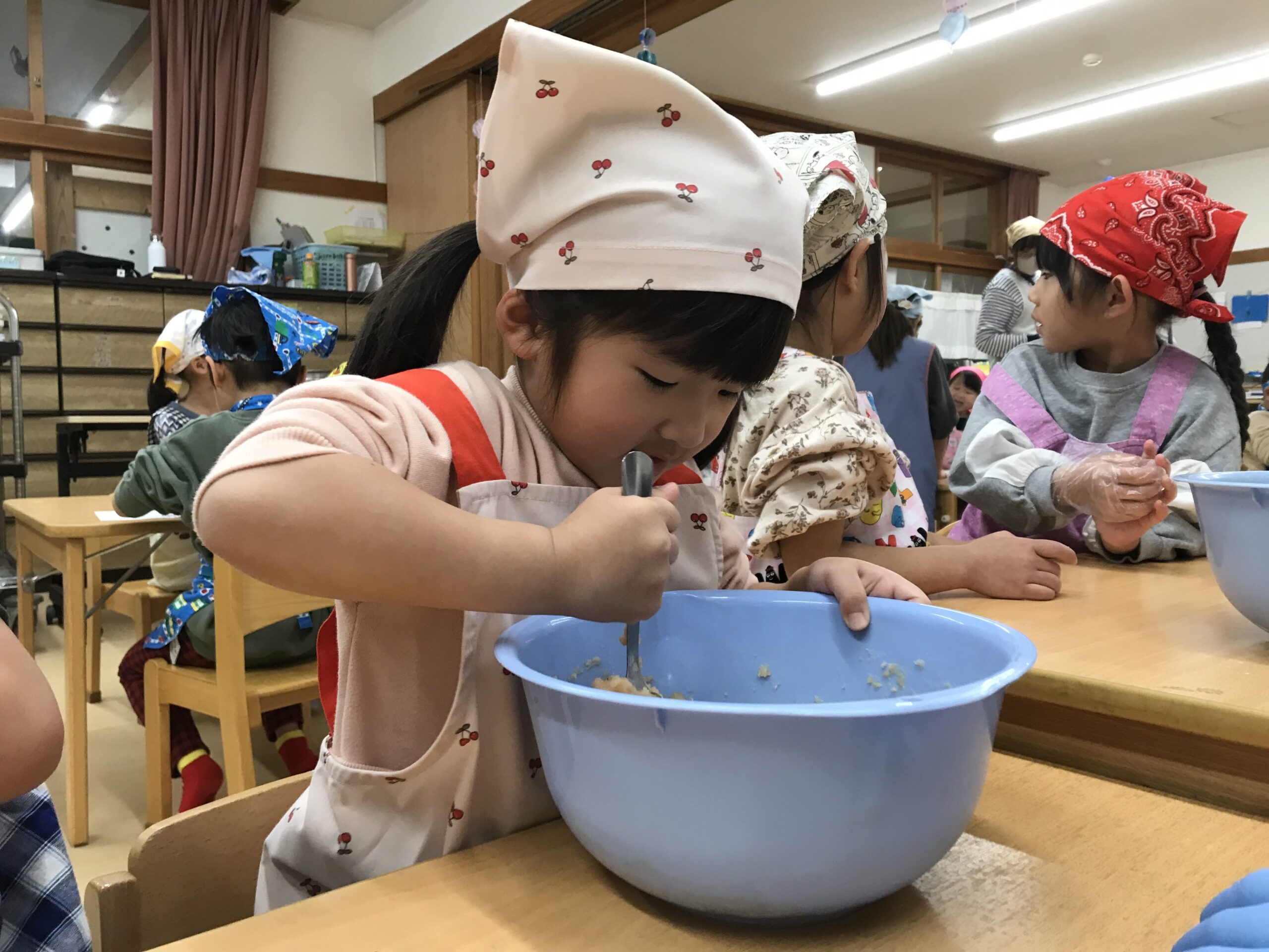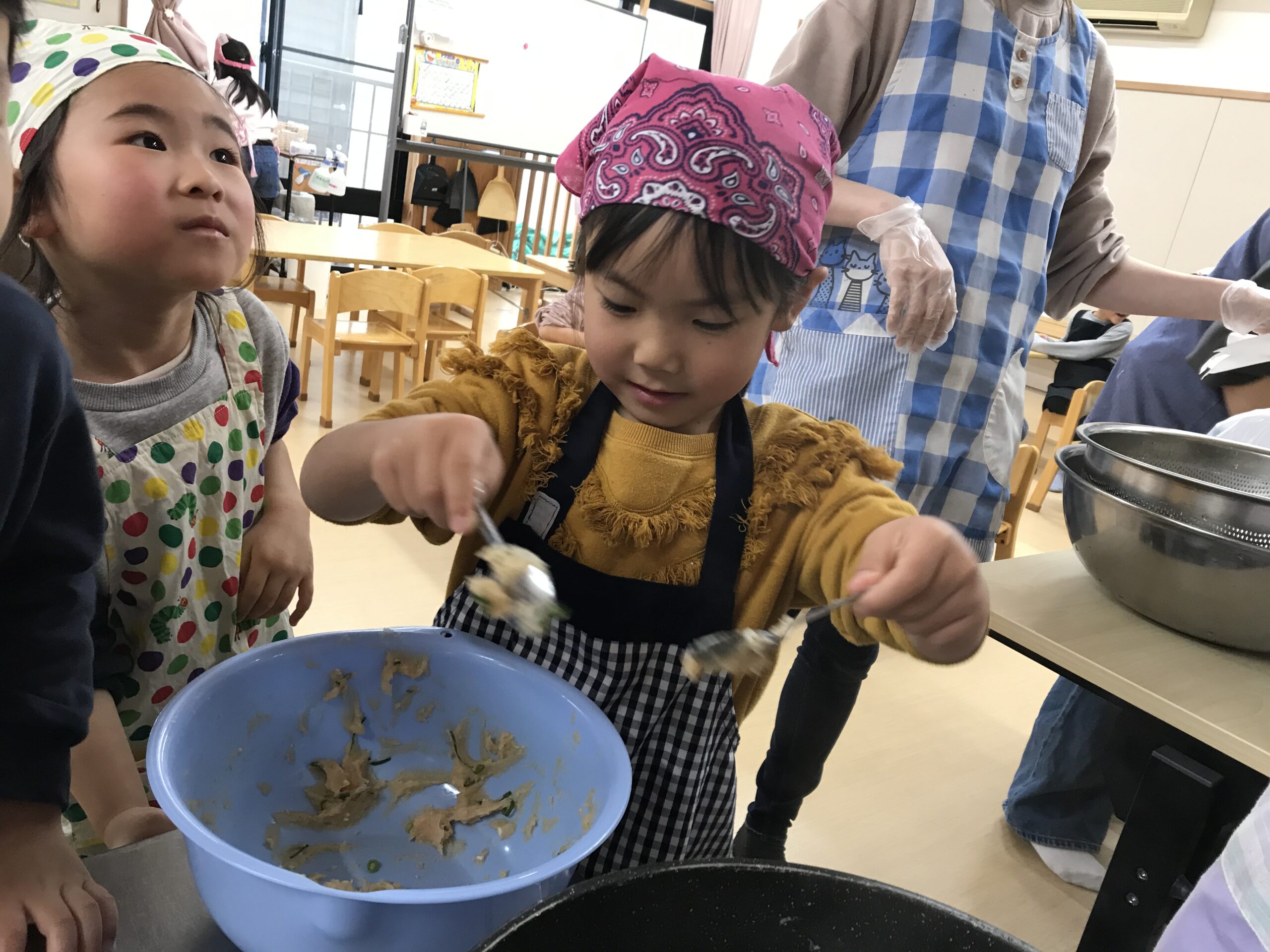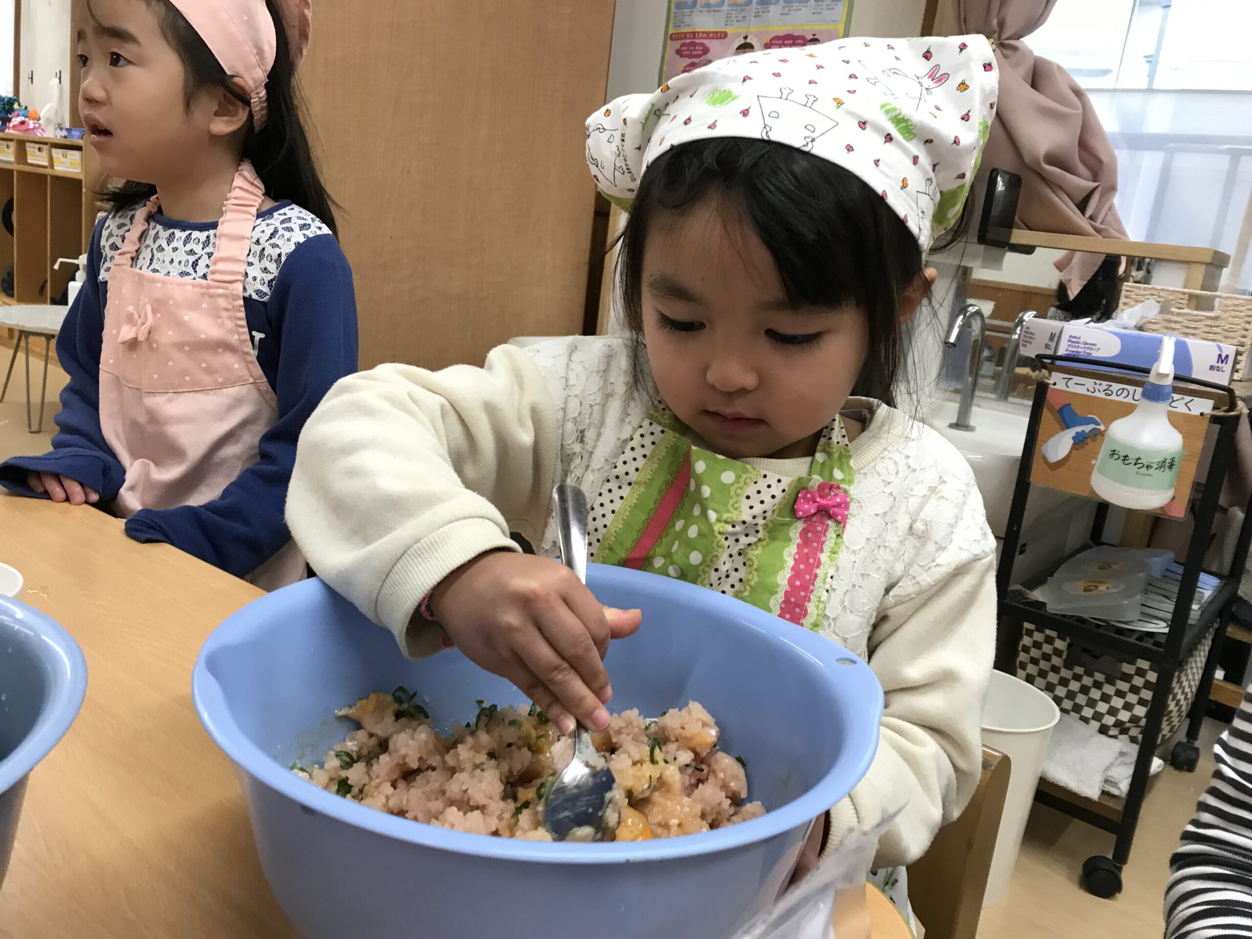 もも組(5歳児)さんは、野菜を切ったり卵を剥いたり、つみれを作ったりと色々な作業をしてもらいました。包丁の使い方がとっても上手になり、手際よく切ってくれました!つみれもスプーンを使って上手に形にしていましたよ!