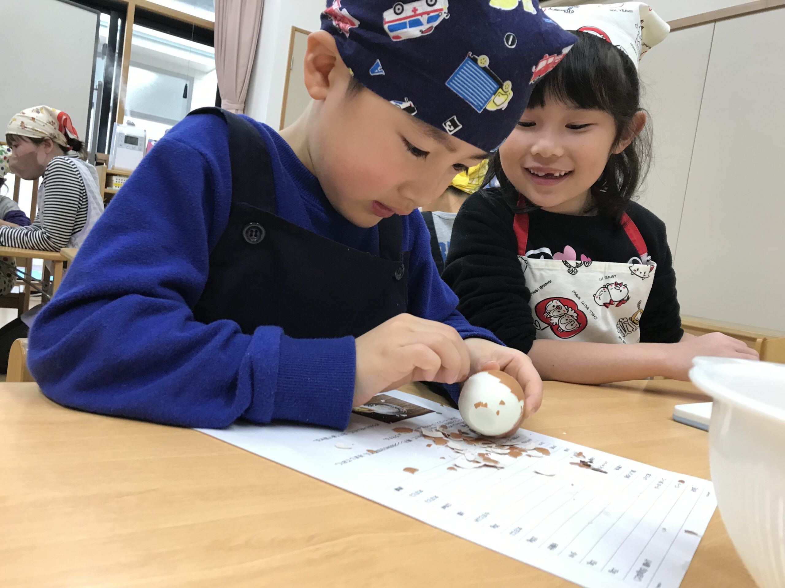 さくら組(4歳児)さんには皮を剥いた野菜を切ってもらいました!包丁を持ち、「気を付けて~」と緊張感もありながら楽しく野菜を切っている様子がありました。「お母さんは切るのはやいよ!」とお話しながら頑張っていました。卵の殻も剥いてくれました!