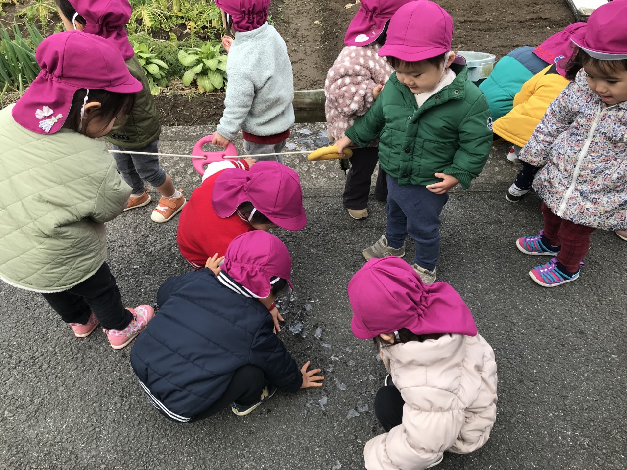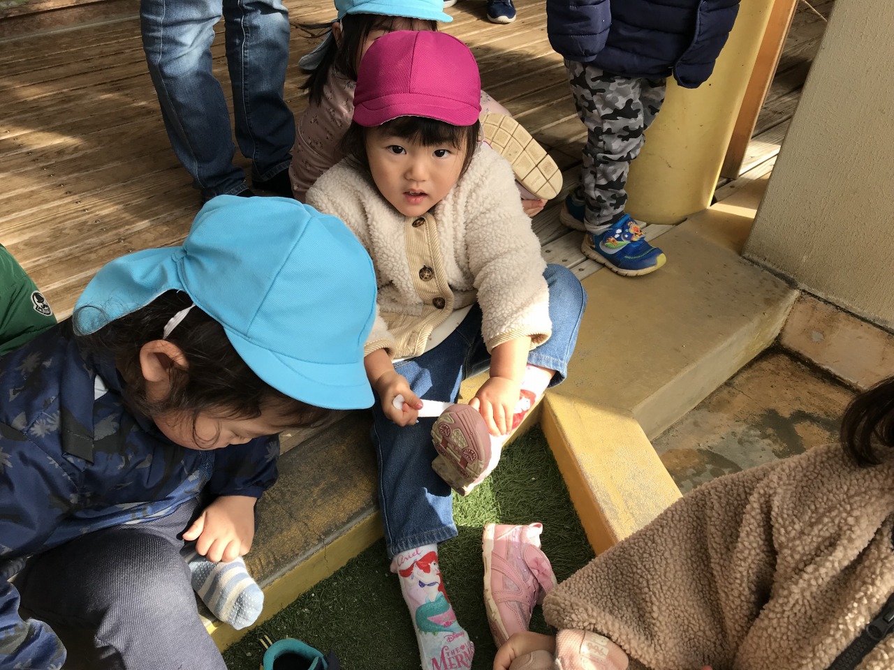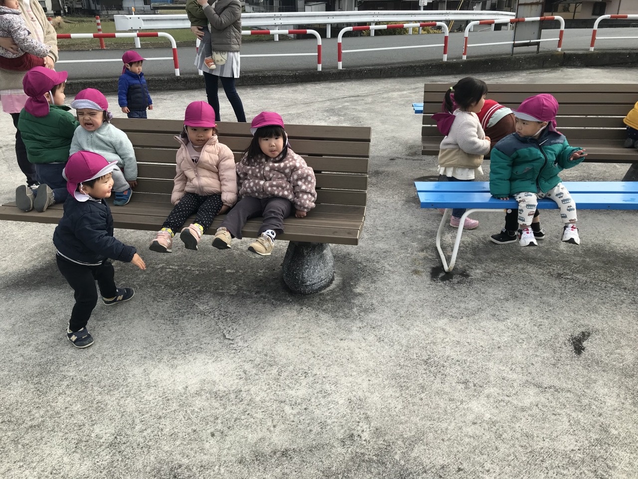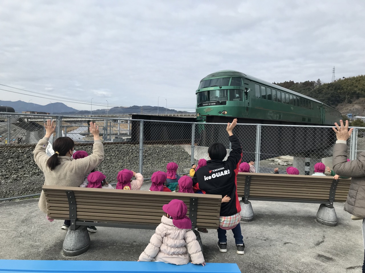 今日すみれ組(1歳児)は汽車を見にお散歩に出掛けました。「汽車見に散歩行く?」と子ども達に尋ねると「うん!」と返事をして嬉しそうでした。自分で帽子を被ったり靴を履いたりとお外に行く準備をして出発です!園を出てすぐバケツに氷が張っているのを見つけて実際に触ったり、足で踏んで”パリパリ”という音を楽しんだりと冬の自然を感じることができました。広場に着いてからは、汽車が来るまで保育士等と追いかけっこをしたり、ベンチに座って「何色が来るかな~」とお話をしたりして楽しく待ちました!ゆふいんの森号と普通列車が通ると嬉しそうに手を振っていた子ども達でした。帰り道も「赤い汽車だったね」「ゆふいんの森も通ったね」「氷があったね」と会話をしながら元気いっぱいで園まで帰りました。またお散歩に行こうね♪