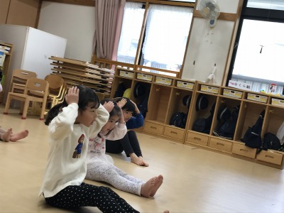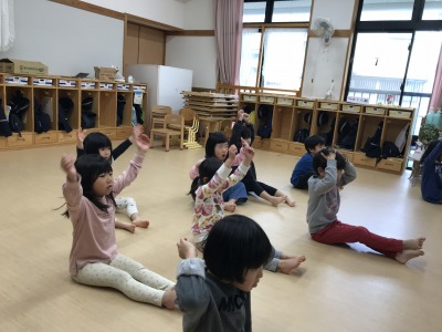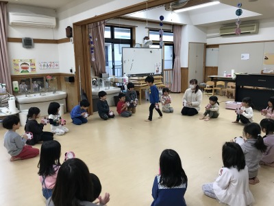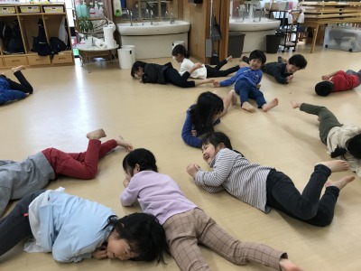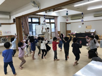 お友達と二人組になって手押し車をしたり、講師の先生が弾くピアノの音をよく聞いて音階をハンドサインで表現し楽しみました。