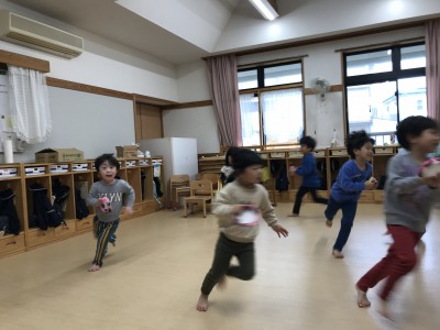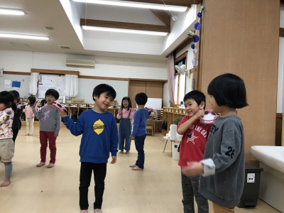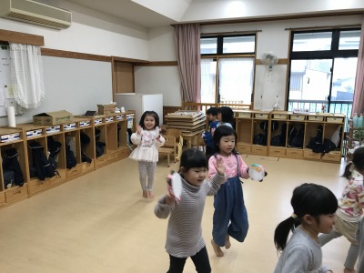 その後、タンバリンに魔法をかけハンドルに変身させインディアンの元まで出かけて行き、到着すると、今度はさくら組(4歳児)さんがインディアンになりタンバリン片手に「エッホッホ」とリズムにのって動きまわっていました。