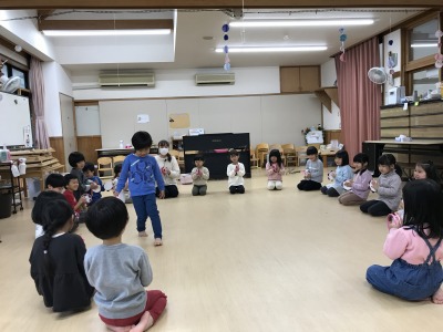 最後は、みんなで円になって座り、お友達の足の動きに合わせて周りのお友達がタンバリンを叩くというリズム打ちに挑戦!