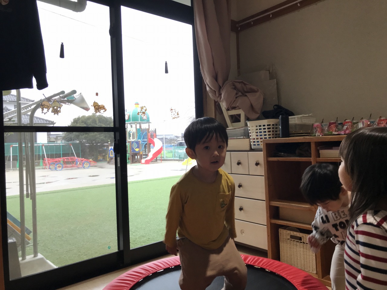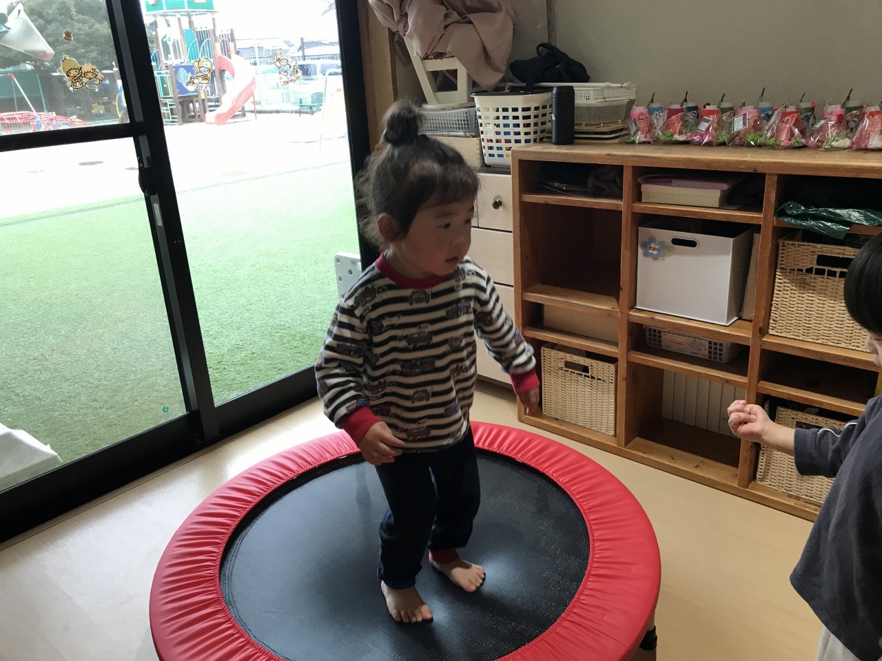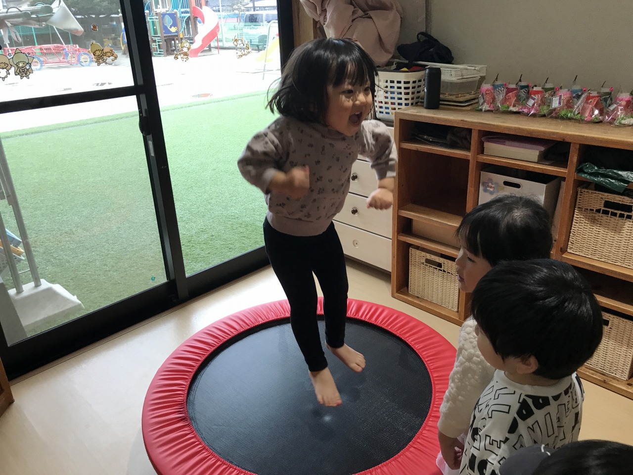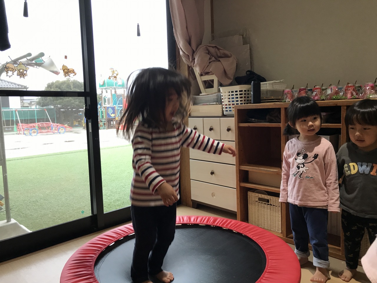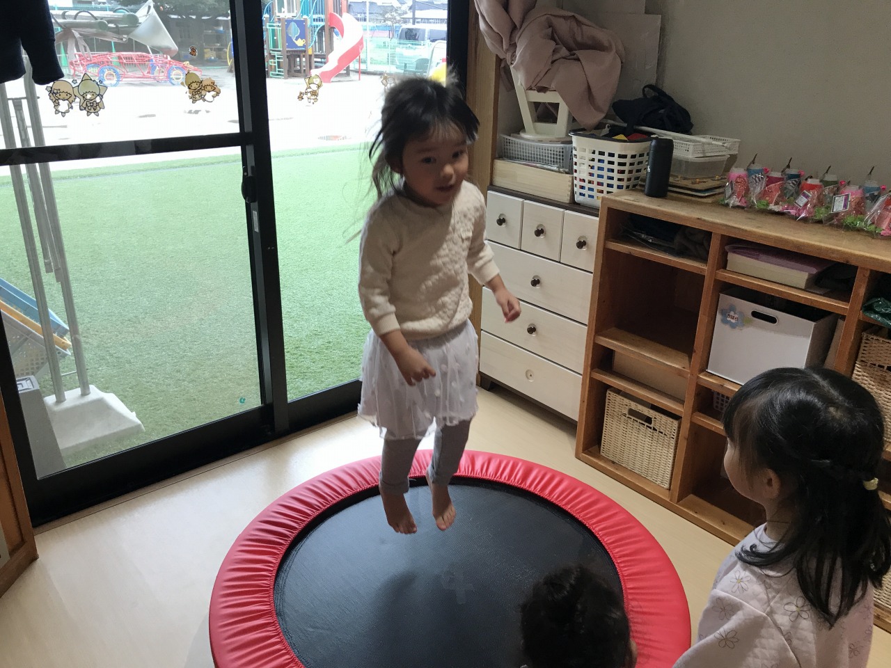 連日雨が続いて、子ども達も戸外で遊べず残念そうです。今日は体を動かすコーナーを作って、運動遊びをしたい子はホールでトランポリンや両足ジャンプを楽しみました。順番を待つ事や、10秒ずつ跳ぶことを知らせると、みんなが約束を守って楽しむ姿が見られました。友だちが跳んでいる間は、「1.2.3….」と他の子が数えてくれます。数字に興味がある子ども達はほとんどの子が10まで数えることができます。ルールや決まりを覚えていき、楽しく遊ぶことができるようになってきている子ども達です。室内では、指先遊びの中でハサミや糊遊び、お箸練習、お絵描きをして遊びました。ハサミの使い方も随分上手になってきて、しっかり切れるようになってきた子もいます。うめ組(3歳児)になる準備として、遊びの中から楽しめるように少しずつ練習中の子ども達です。