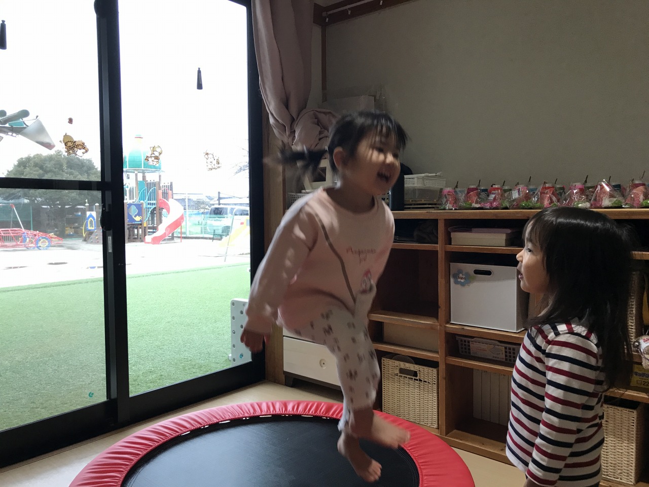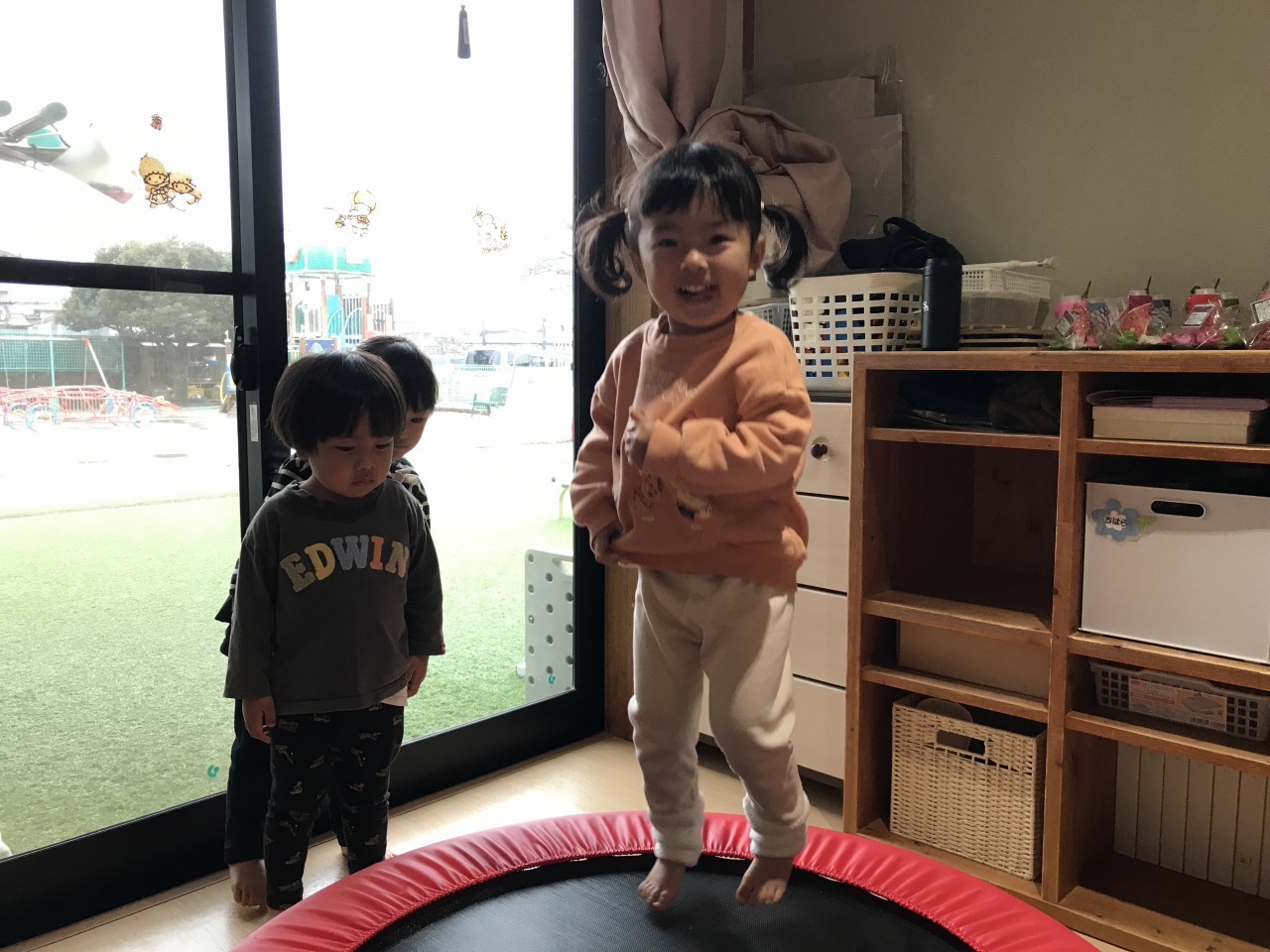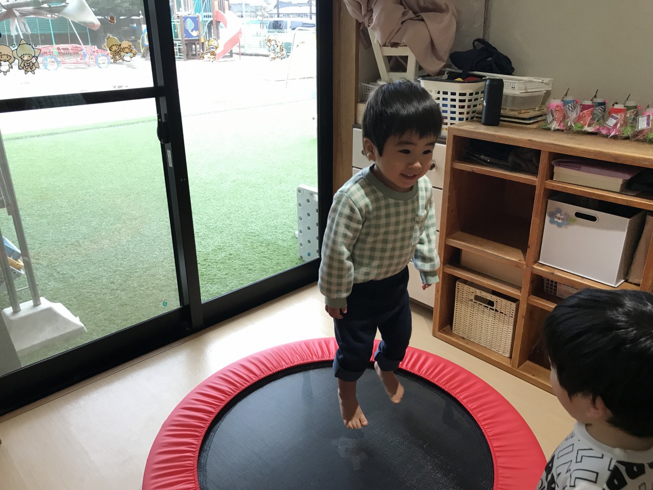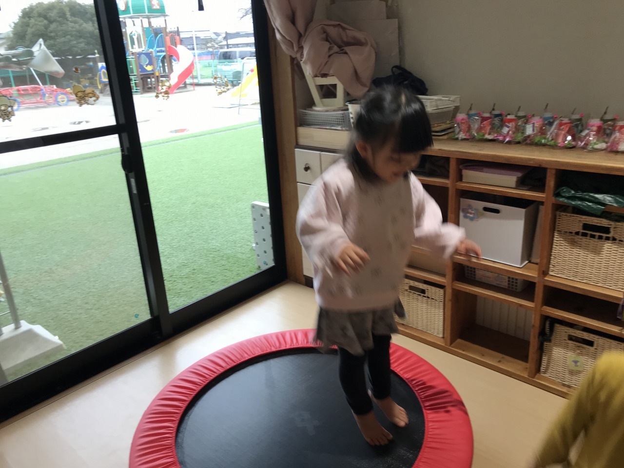 連日雨が続いて、子ども達も戸外で遊べず残念そうです。今日は体を動かすコーナーを作って、運動遊びをしたい子はホールでトランポリンや両足ジャンプを楽しみました。順番を待つ事や、10秒ずつ跳ぶことを知らせると、みんなが約束を守って楽しむ姿が見られました。友だちが跳んでいる間は、「1.2.3….」と他の子が数えてくれます。数字に興味がある子ども達はほとんどの子が10まで数えることができます。ルールや決まりを覚えていき、楽しく遊ぶことができるようになってきている子ども達です。室内では、指先遊びの中でハサミや糊遊び、お箸練習、お絵描きをして遊びました。ハサミの使い方も随分上手になってきて、しっかり切れるようになってきた子もいます。うめ組(3歳児)になる準備として、遊びの中から楽しめるように少しずつ練習中の子ども達です。