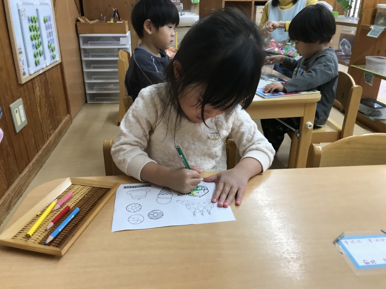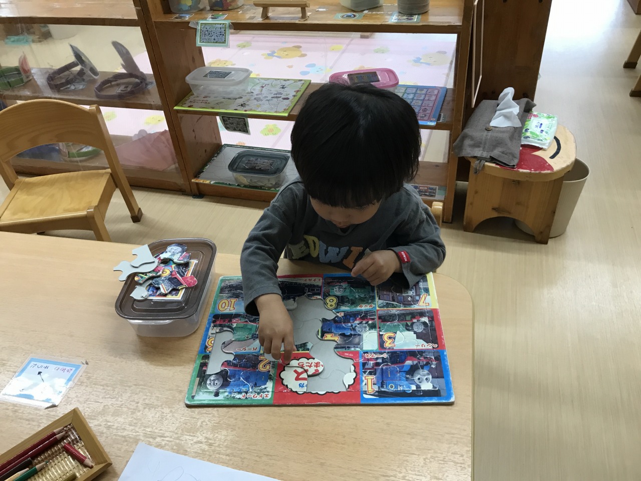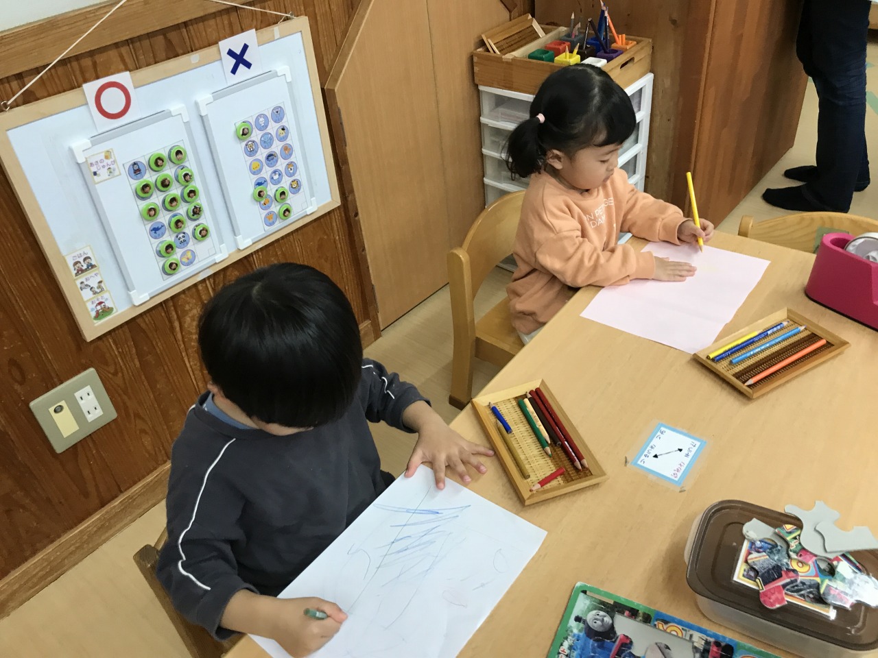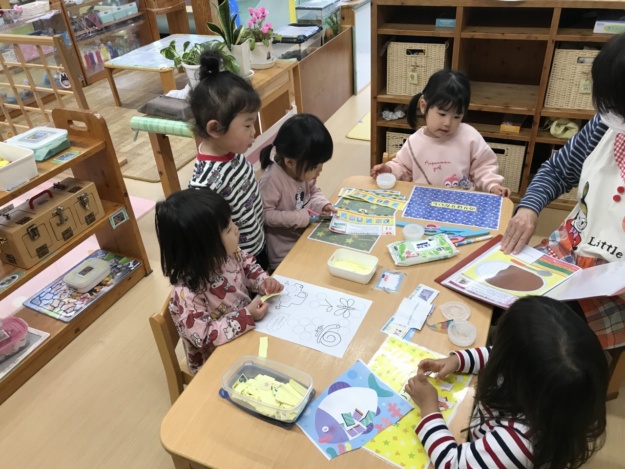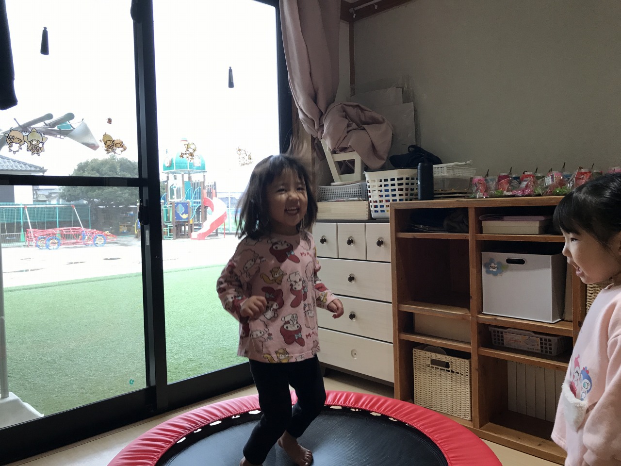 連日雨が続いて、子ども達も戸外で遊べず残念そうです。今日は体を動かすコーナーを作って、運動遊びをしたい子はホールでトランポリンや両足ジャンプを楽しみました。順番を待つ事や、10秒ずつ跳ぶことを知らせると、みんなが約束を守って楽しむ姿が見られました。友だちが跳んでいる間は、「1.2.3….」と他の子が数えてくれます。数字に興味がある子ども達はほとんどの子が10まで数えることができます。ルールや決まりを覚えていき、楽しく遊ぶことができるようになってきている子ども達です。室内では、指先遊びの中でハサミや糊遊び、お箸練習、お絵描きをして遊びました。ハサミの使い方も随分上手になってきて、しっかり切れるようになってきた子もいます。うめ組(3歳児)になる準備として、遊びの中から楽しめるように少しずつ練習中の子ども達です。
