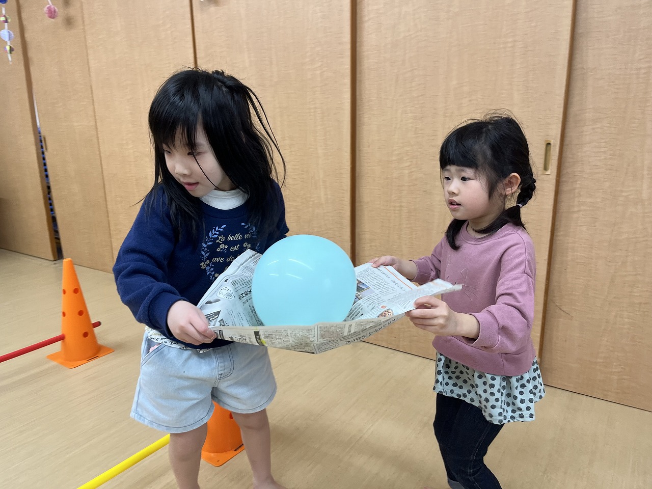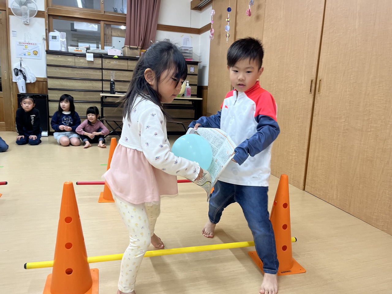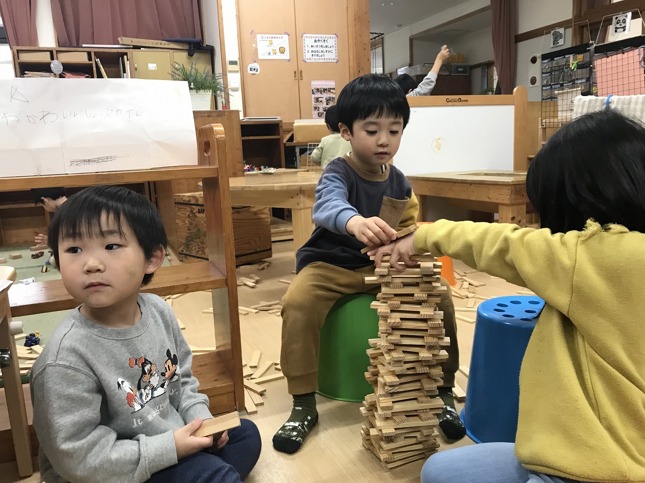 マフラーづくりやカプラ、風船遊びなどそれぞれのコーナーで自分のしたい遊びをじっくり楽しんでいる子どもたちです。移行で来ているたんぽぽ組さんも楽しい遊びにワクワク!さくら組(4歳児)が優しくお世話をしてくれています。「遊んであげてね」と言わなくても今まで自分たちがお兄ちゃん、お姉ちゃんに遊んでもらったから!と自然と手を繋ぎ、優しい関わりができています。異年齢で過ごす中で優しい気持ちが育っていっている子ども達です。