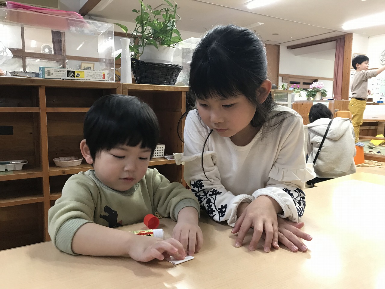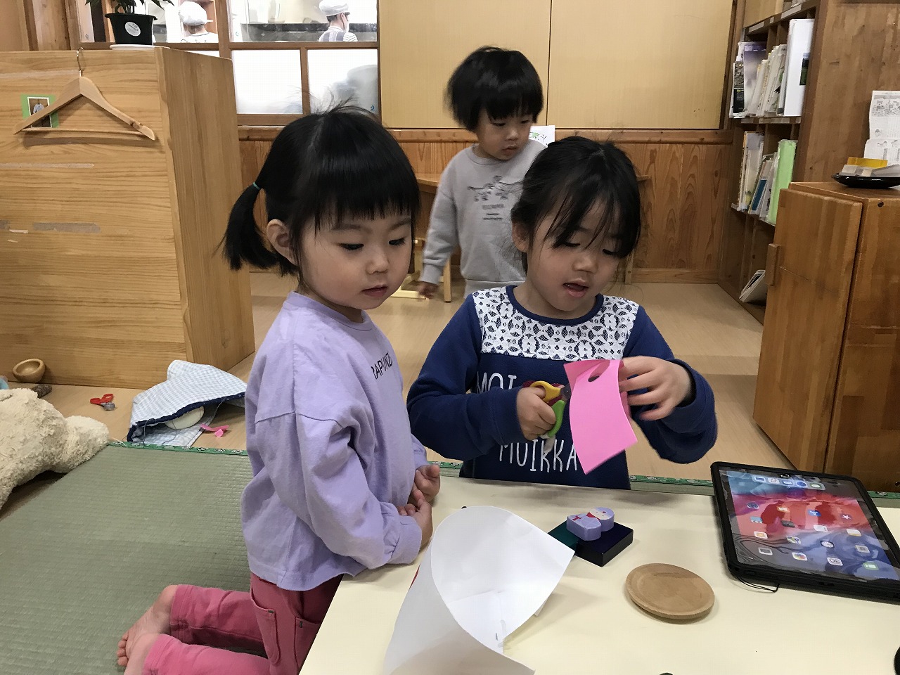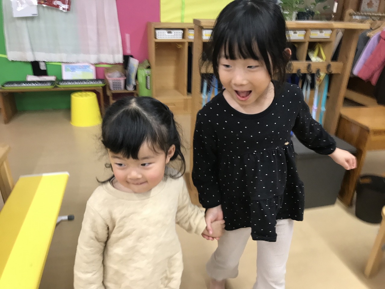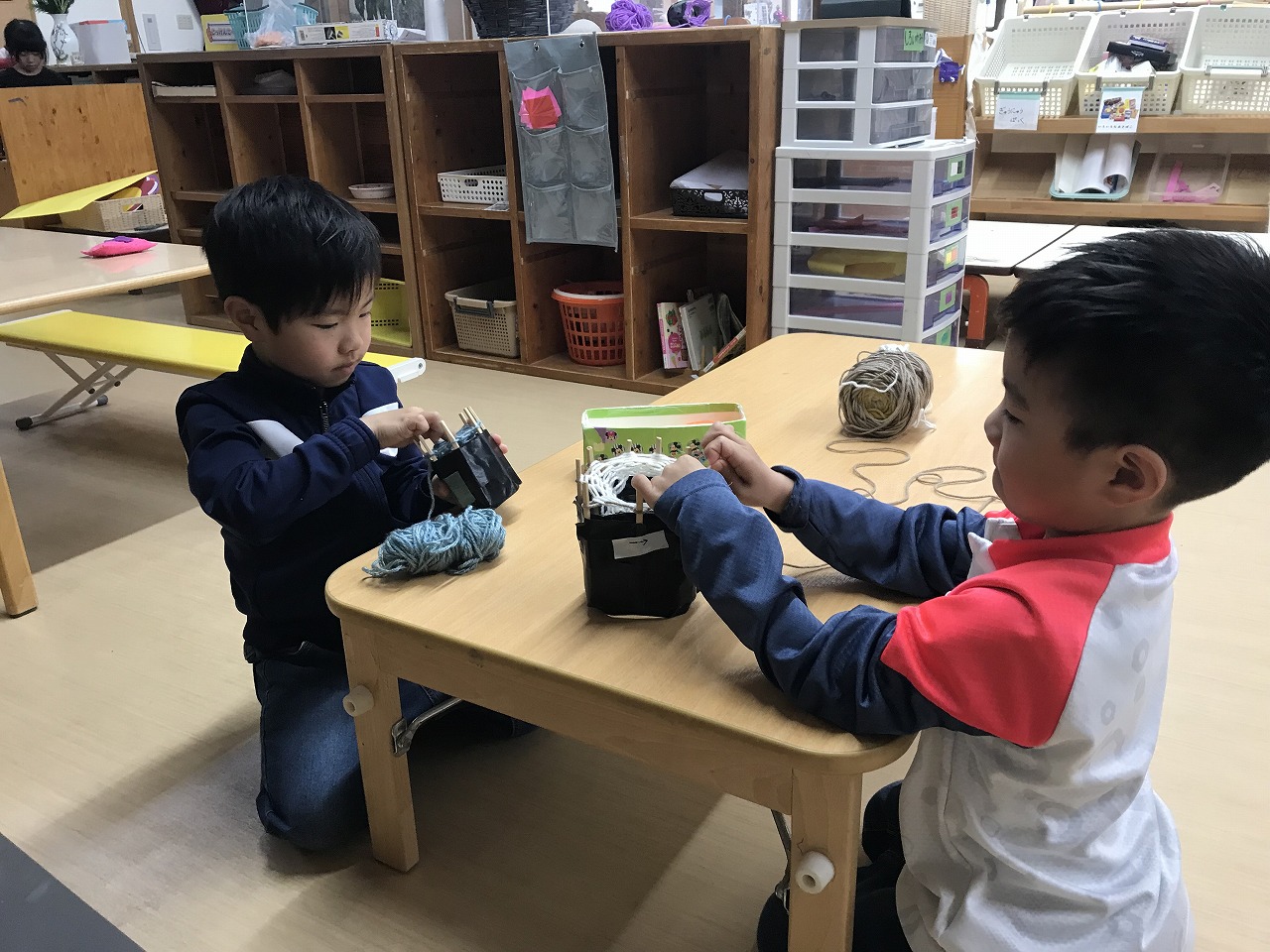マフラーづくりやカプラ、風船遊びなどそれぞれのコーナーで自分のしたい遊びをじっくり楽しんでいる子どもたちです。移行で来ているたんぽぽ組さんも楽しい遊びにワクワク!さくら組(4歳児)が優しくお世話をしてくれています。「遊んであげてね」と言わなくても今まで自分たちがお兄ちゃん、お姉ちゃんに遊んでもらったから!と自然と手を繋ぎ、優しい関わりができています。異年齢で過ごす中で優しい気持ちが育っていっている子ども達です。
