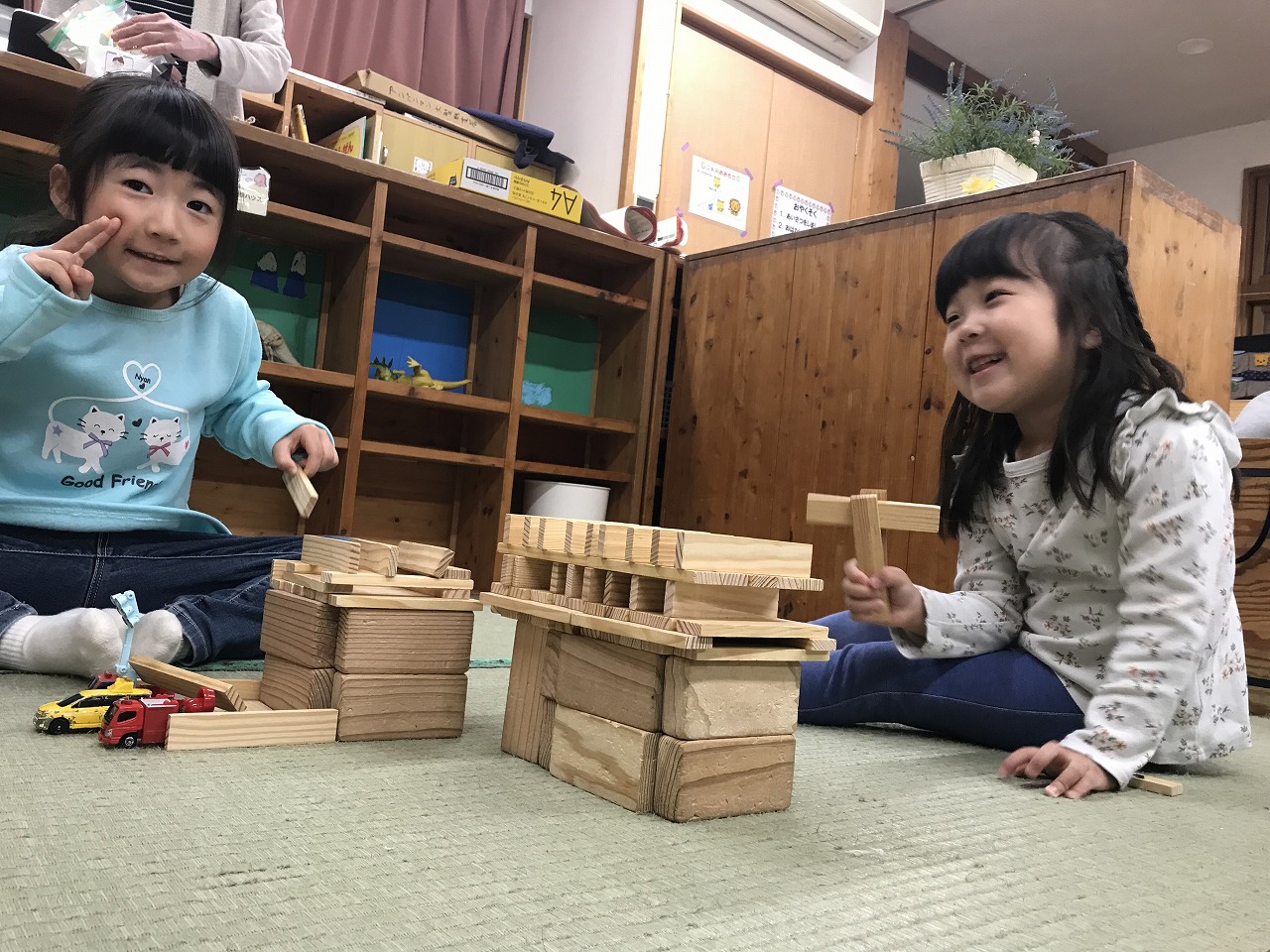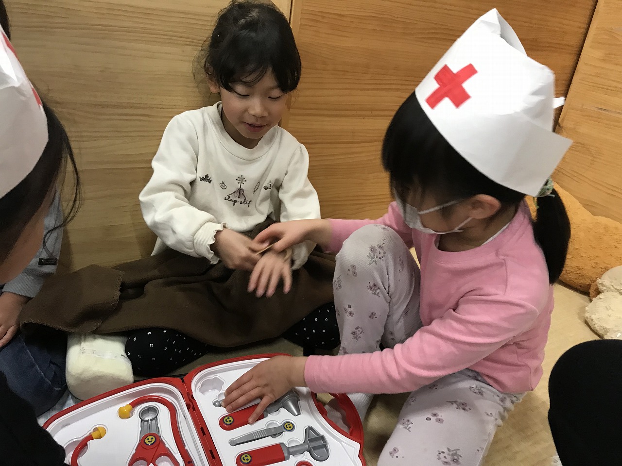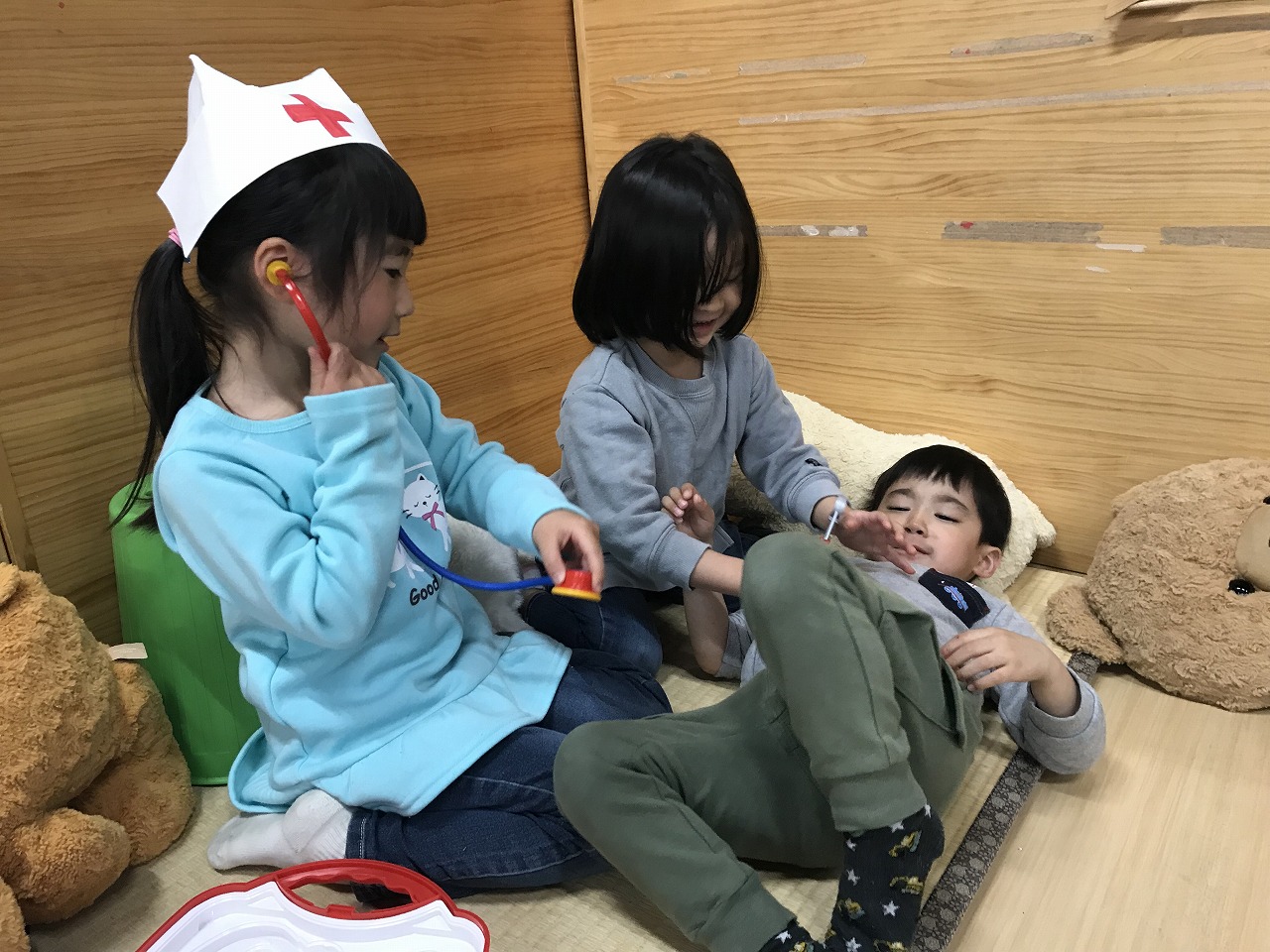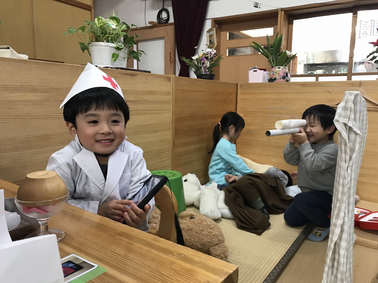 以上児さんたちが遊ぶわくわくランドには楽しいコーナーが沢山あります!今週から新しくできた病院コーナーは大人気!白衣を着てすっかり気分はお医者さん♩聴診器をつけて「もしもし~…注射が痛いですよ~」などなりきって遊んでいました。白衣の数は限られていますが、お友達としっかり貸し借りし合いながら仲良く使うことができていました。昨日消防署で救急車のお話も聞いたので、イメージもぐんぐん広がっているようです。