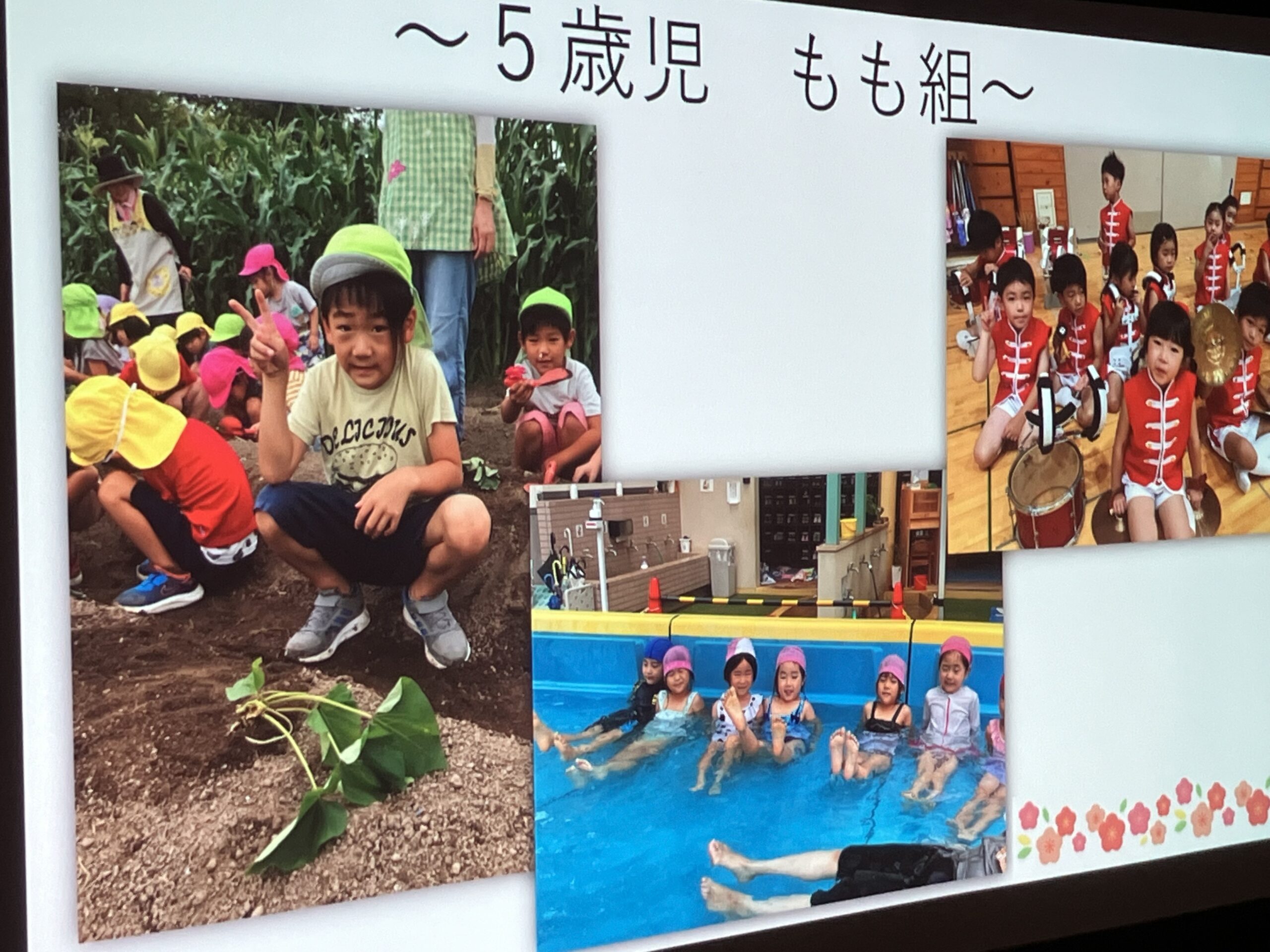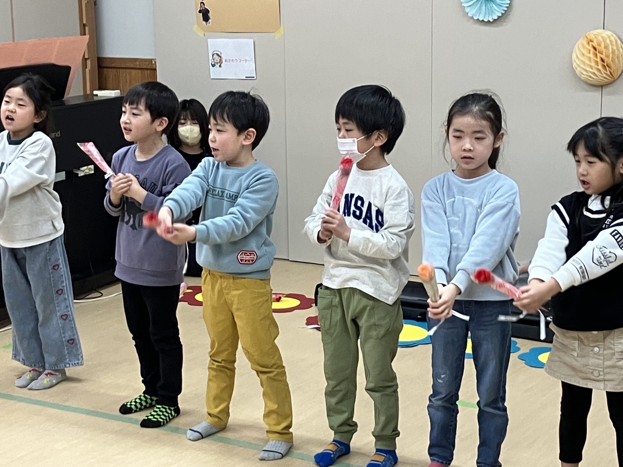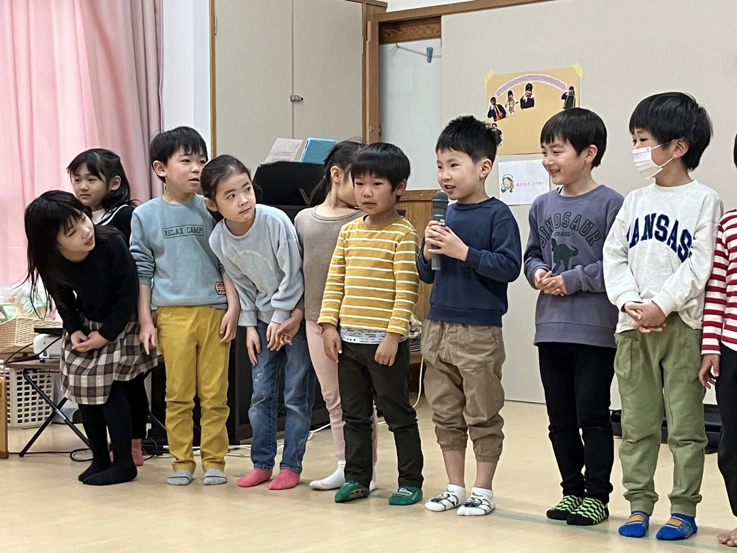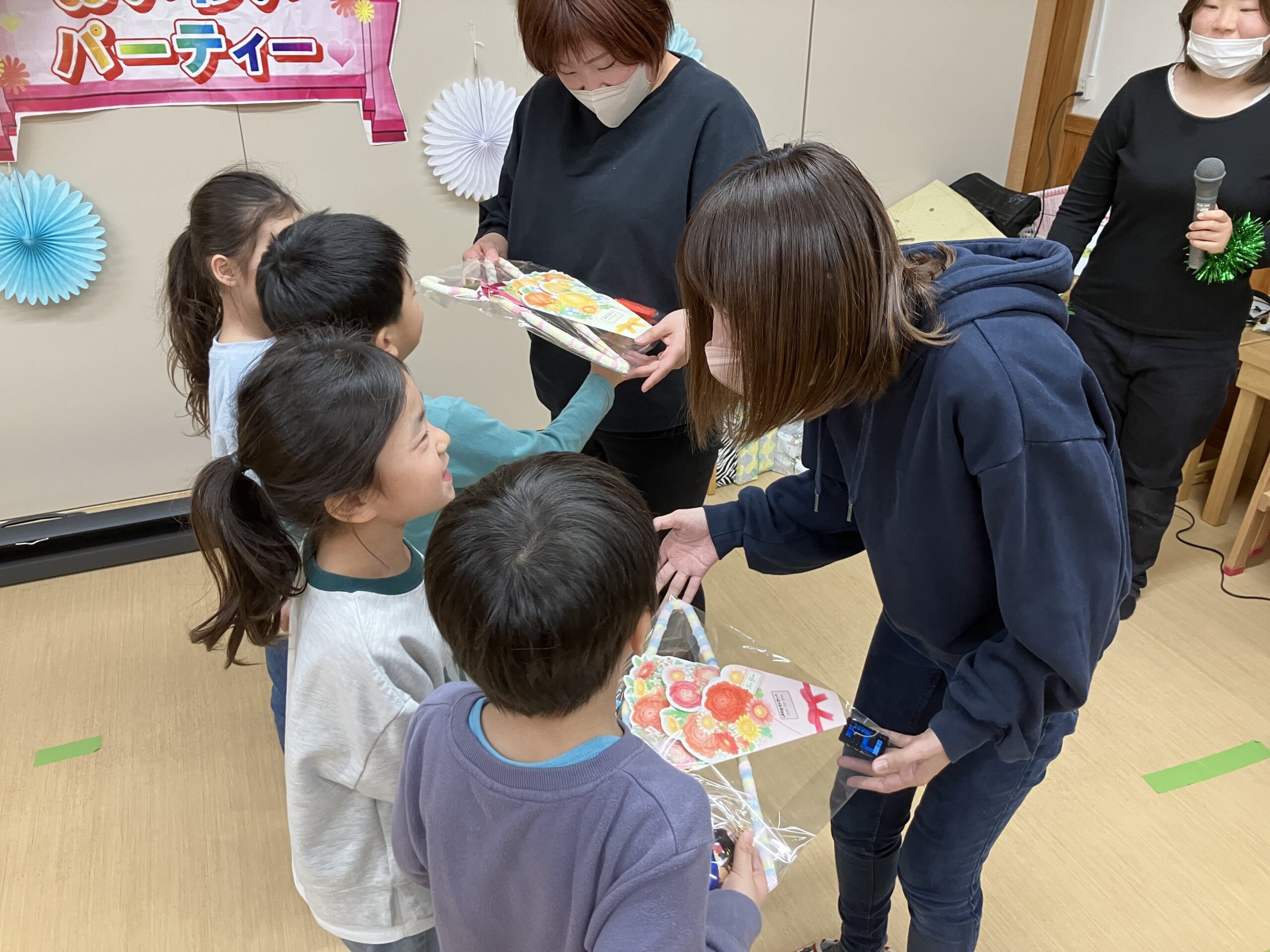 今日は、もも組(年長児)のお祝いパーティーが開かれました。虹の曲に合わせて、もも組が入場!まず最初、もも組に将来の夢のインタビューをしました。さすが、もも組さん、みんなの前で堂々と「〇〇になりたいです。〇〇がしたいです。」と発表してくれました。その次に、ひよこ組(0歳児)・楽器遊び→すみれ組(1歳児)・踊り→たんぽぽ組(2歳児)・手話と歌→うめ・さくら組(3.4歳児)・歌→もも組(5歳児)踊り・歌の順に出し物を披露しました。とても上手でかわいかったです。保育士等からの踊りの出し物もあり、子どもたちも2曲目、一緒にノリノリで踊って楽しみました。思い出のスライドショーは、あんなこと、こんなこともあったと、懐かしく思い出されました。プレゼント交換では、子ども達一人一人が一生懸命作ったプレゼントを、グループ同士で交換し、うれしそうな姿が見られました。もも組の女の子が、「先生、たのしい ♪」と笑顔で言っていたのが印象的で、今日のお祝いパーティー、全園児で有意義に楽しく過ごすことができたと思います。