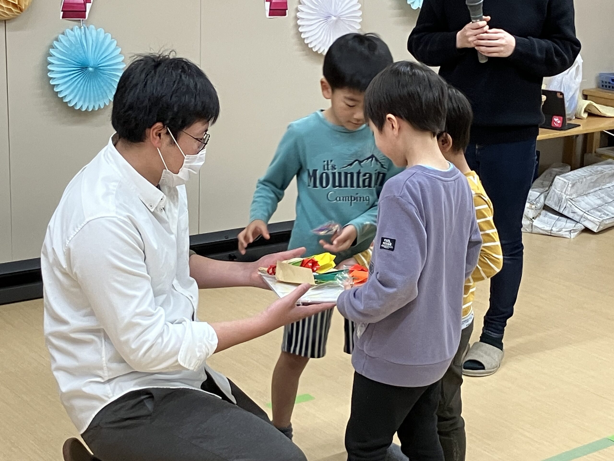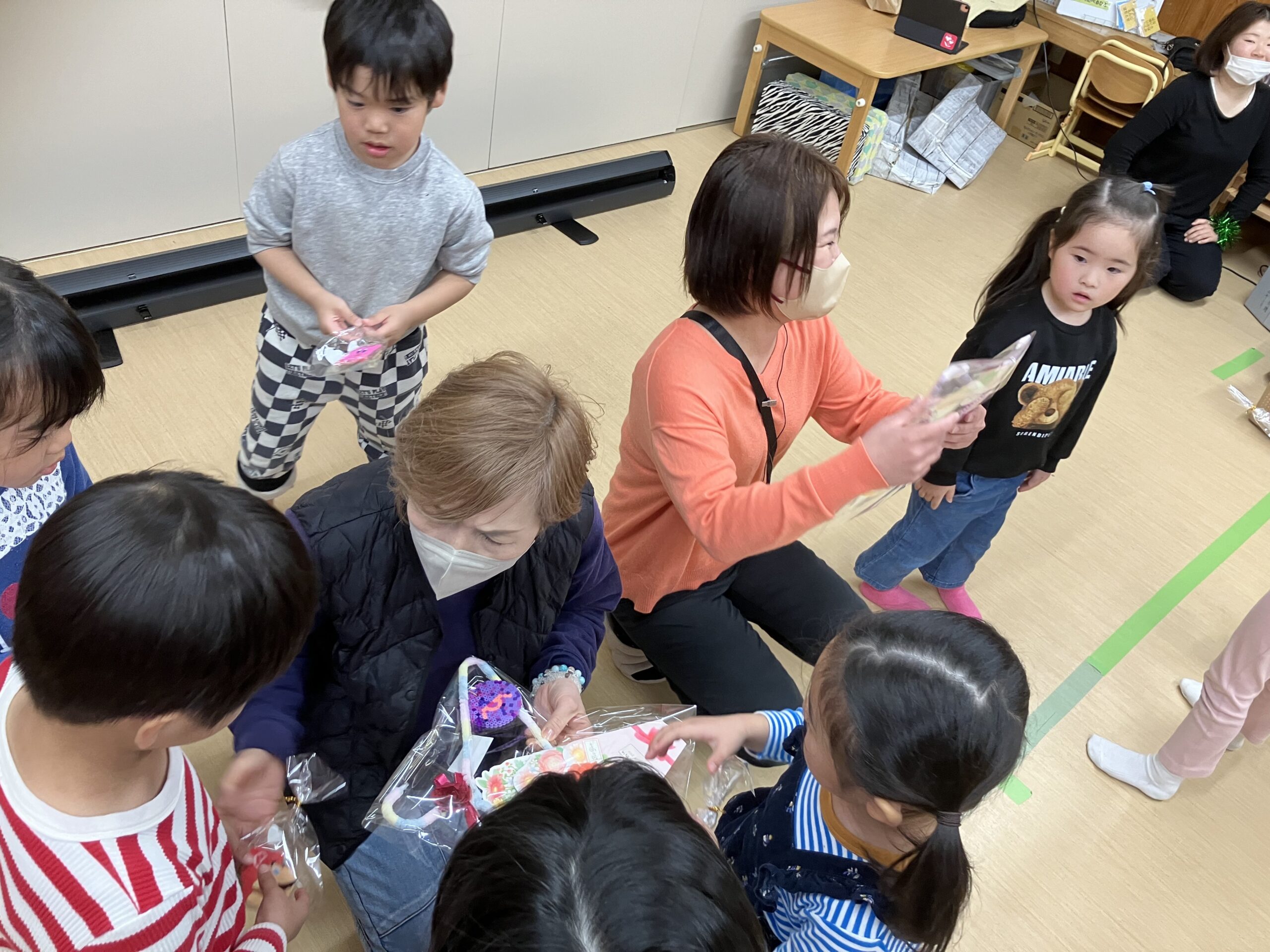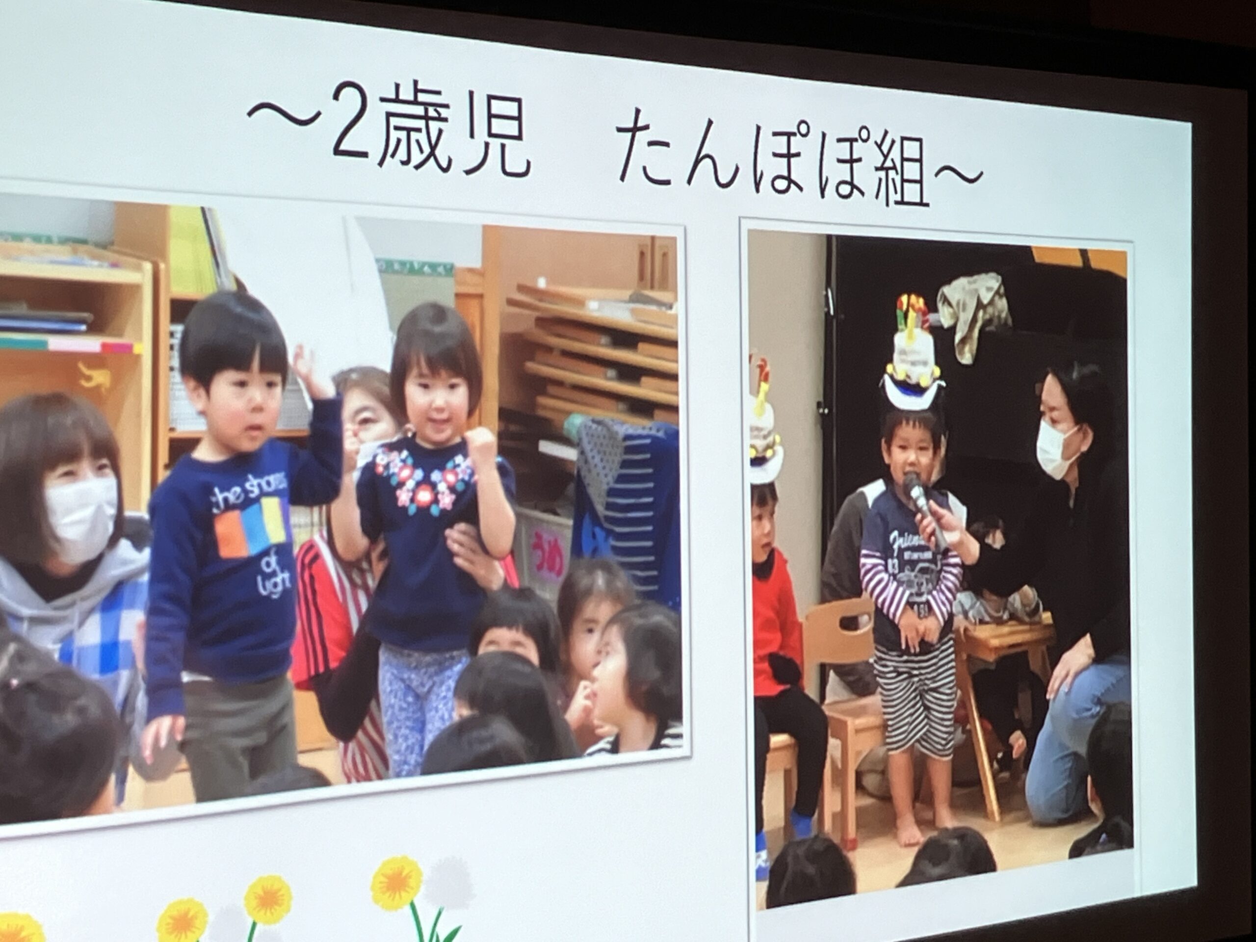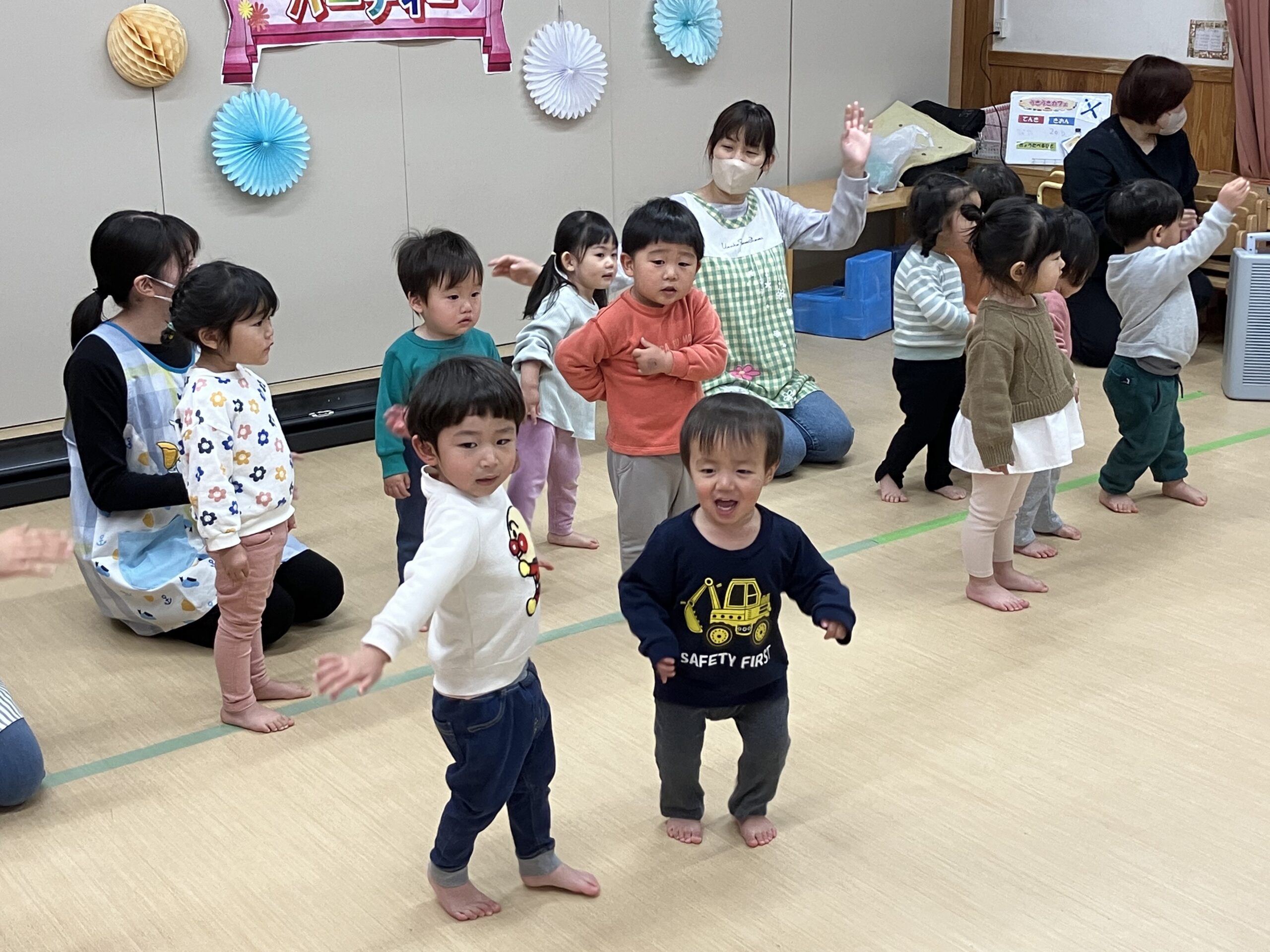 今日は、もも組(年長児)のお祝いパーティーが開かれました。虹の曲に合わせて、もも組が入場!まず最初、もも組に将来の夢のインタビューをしました。さすが、もも組さん、みんなの前で堂々と「〇〇になりたいです。〇〇がしたいです。」と発表してくれました。その次に、ひよこ組(0歳児)・楽器遊び→すみれ組(1歳児)・踊り→たんぽぽ組(2歳児)・手話と歌→うめ・さくら組(3.4歳児)・歌→もも組(5歳児)踊り・歌の順に出し物を披露しました。とても上手でかわいかったです。保育士等からの踊りの出し物もあり、子どもたちも2曲目、一緒にノリノリで踊って楽しみました。思い出のスライドショーは、あんなこと、こんなこともあったと、懐かしく思い出されました。プレゼント交換では、子ども達一人一人が一生懸命作ったプレゼントを、グループ同士で交換し、うれしそうな姿が見られました。もも組の女の子が、「先生、たのしい ♪」と笑顔で言っていたのが印象的で、今日のお祝いパーティー、全園児で有意義に楽しく過ごすことができたと思います。