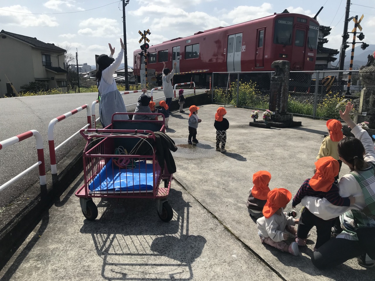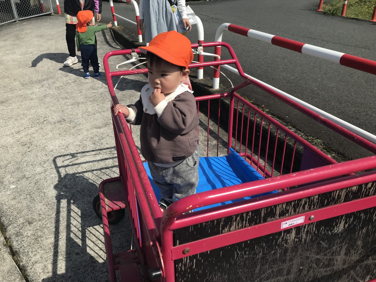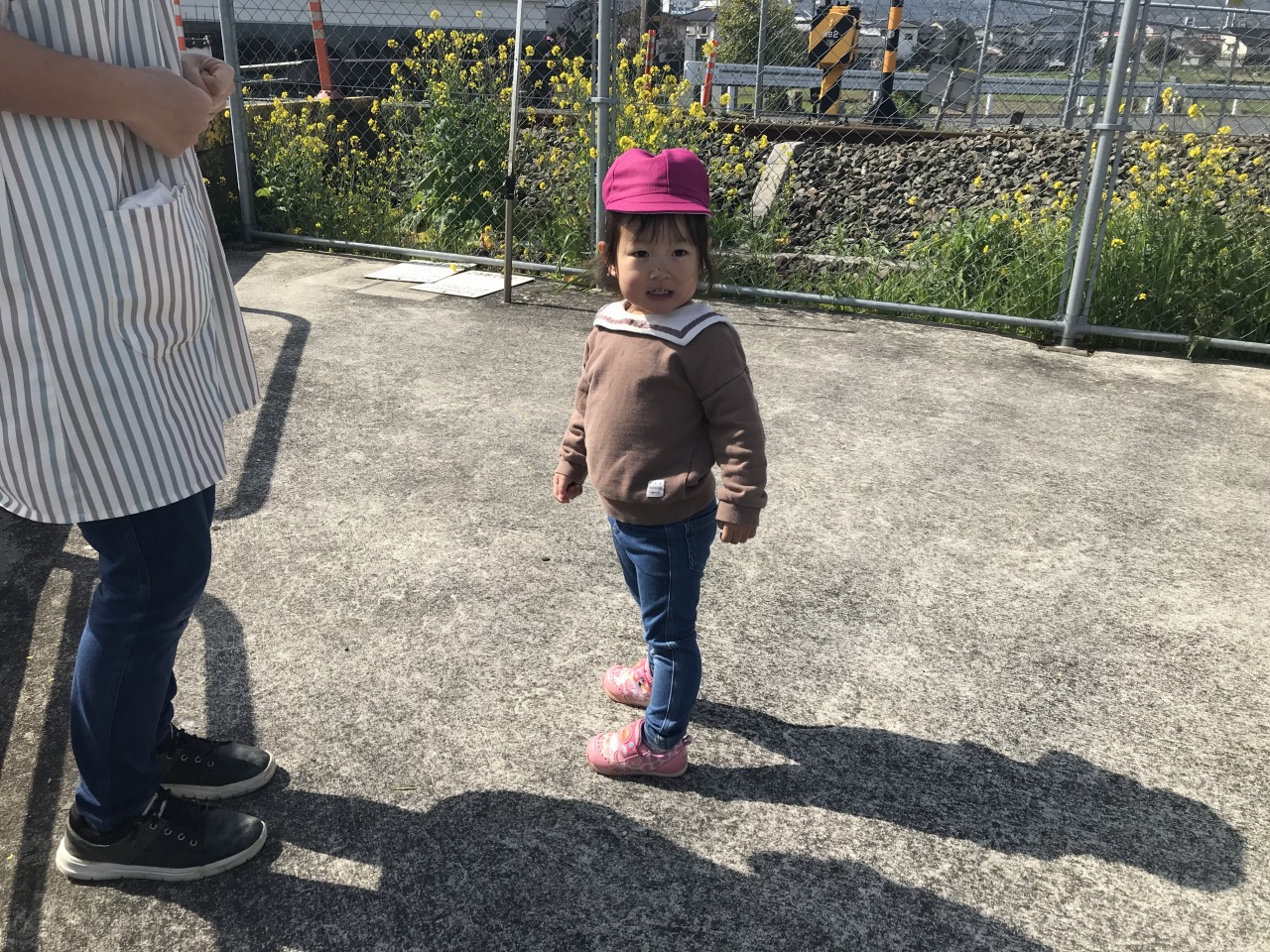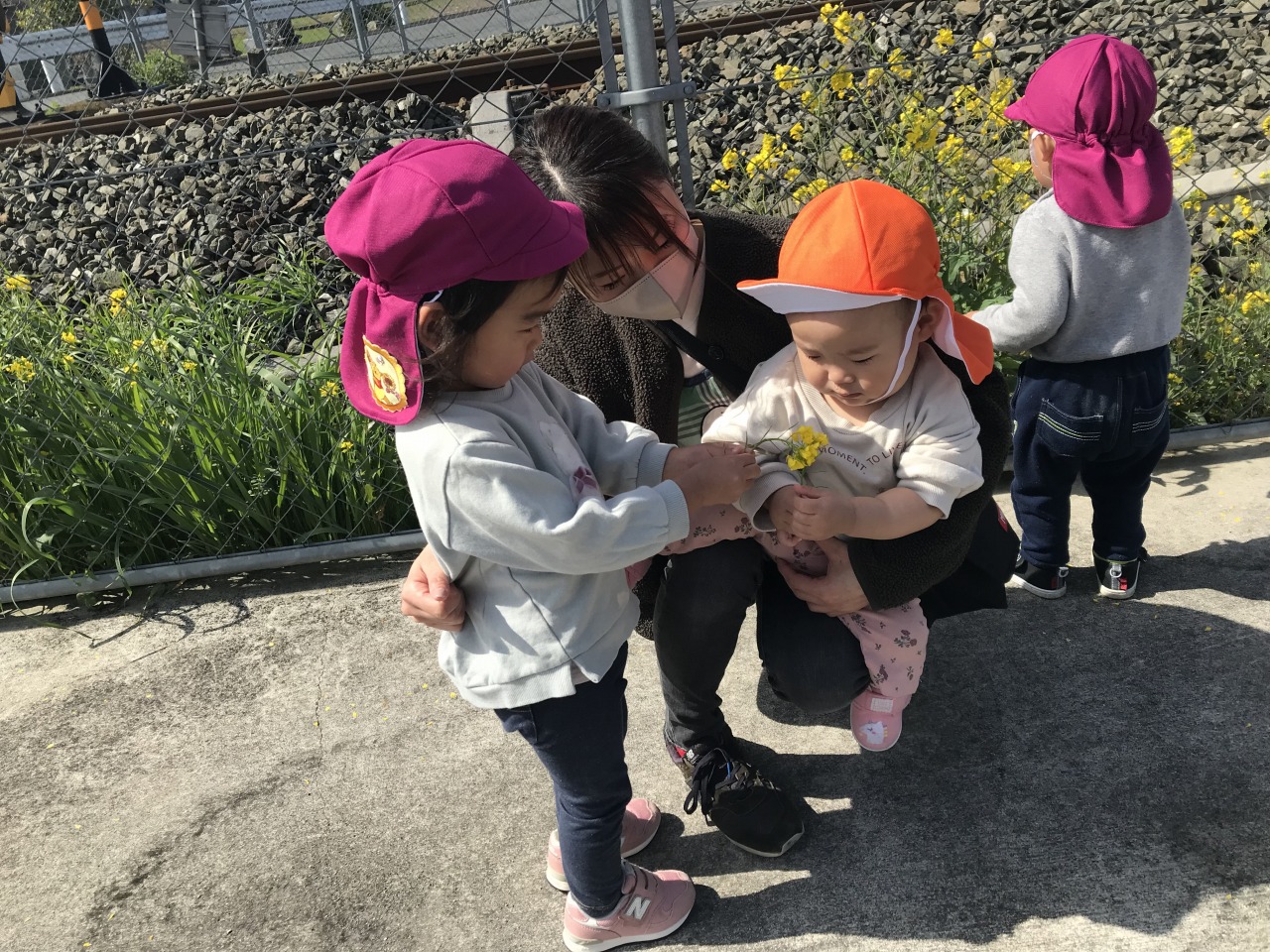 今日は天気が良かったので、ひよこ組(0歳児)とすみれ組(1歳児)は一緒に汽車を見に散歩に出掛けました!「ガタンゴトン見に行こうね」と保育士等が声を掛けると「きしゃみにいく~!」「おさんぽいく~!」と大喜びでした。ひよこ組は歩けるお友だちは保育士等と手を繋いで歩いたり避難車に乗って行ったりし、すみれ組は皆で誘導ロープを持って行きました。川を泳いでいるカモを見つけて指を差したり、バイパスを通っていくトラックやごみ収集車に手を振ったりしながら楽しく歩きました。汽車を見る広場に着いてからは菜の花を摘んだり、働く車を見たりと思い思いに遊びを楽しんでいた子ども達です。帰りも元気に歩いて帰りました!!またお散歩に行こうね♪