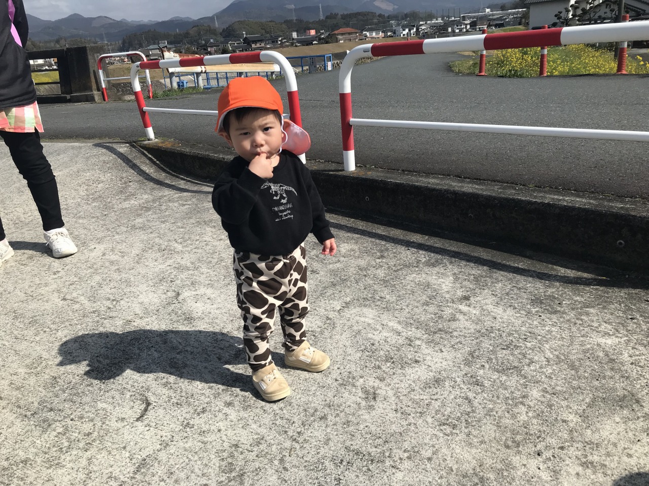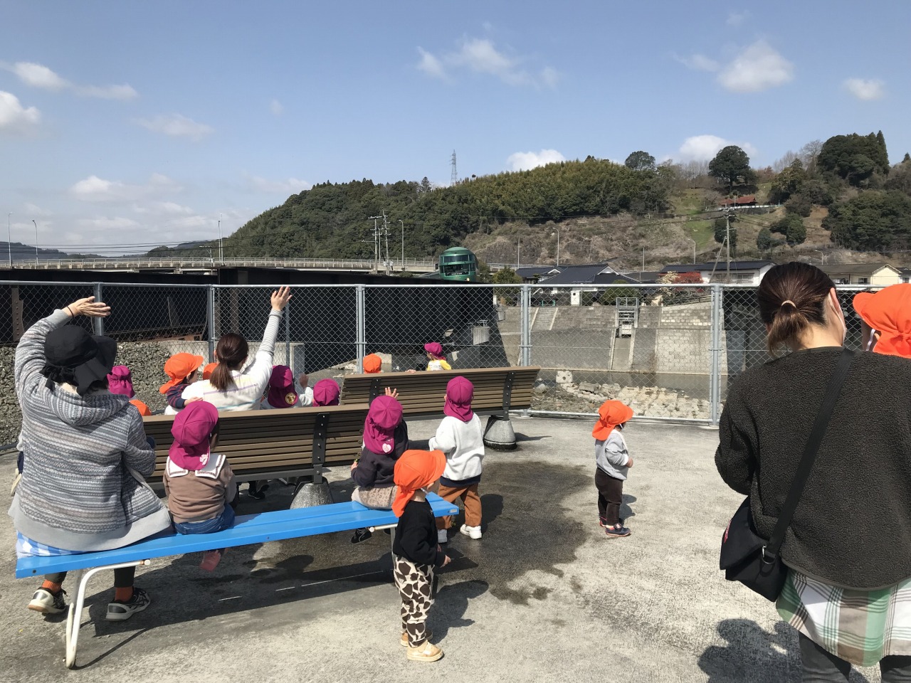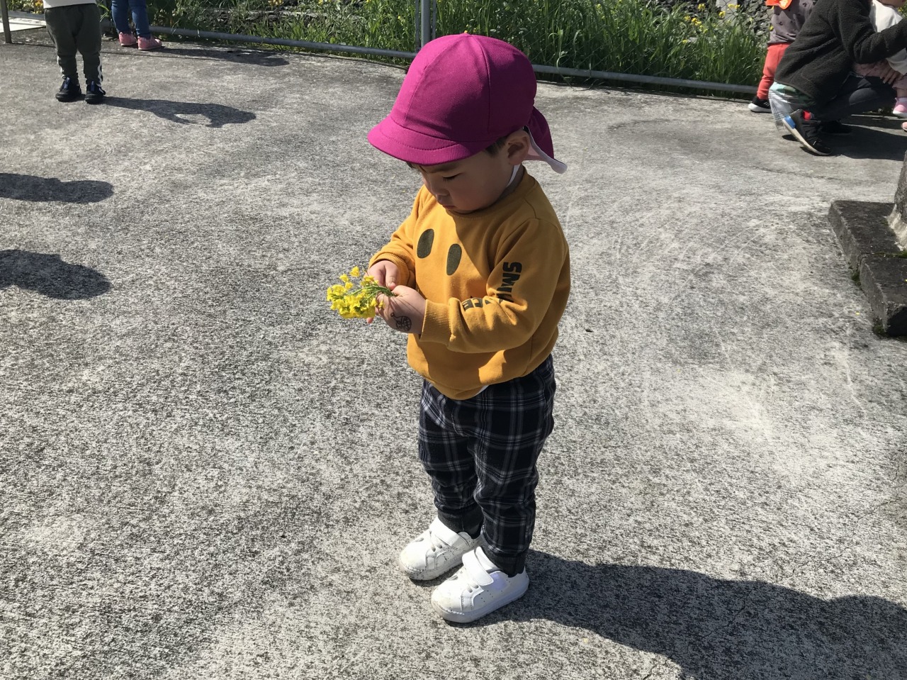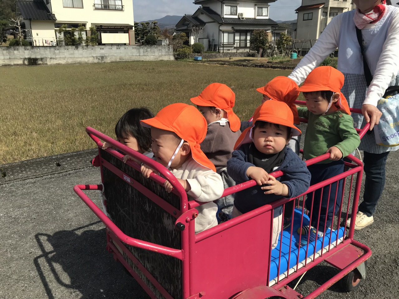 今日は天気が良かったので、ひよこ組(0歳児)とすみれ組(1歳児)は一緒に汽車を見に散歩に出掛けました!「ガタンゴトン見に行こうね」と保育士等が声を掛けると「きしゃみにいく~!」「おさんぽいく~!」と大喜びでした。ひよこ組は歩けるお友だちは保育士等と手を繋いで歩いたり避難車に乗って行ったりし、すみれ組は皆で誘導ロープを持って行きました。川を泳いでいるカモを見つけて指を差したり、バイパスを通っていくトラックやごみ収集車に手を振ったりしながら楽しく歩きました。汽車を見る広場に着いてからは菜の花を摘んだり、働く車を見たりと思い思いに遊びを楽しんでいた子ども達です。帰りも元気に歩いて帰りました!!またお散歩に行こうね♪