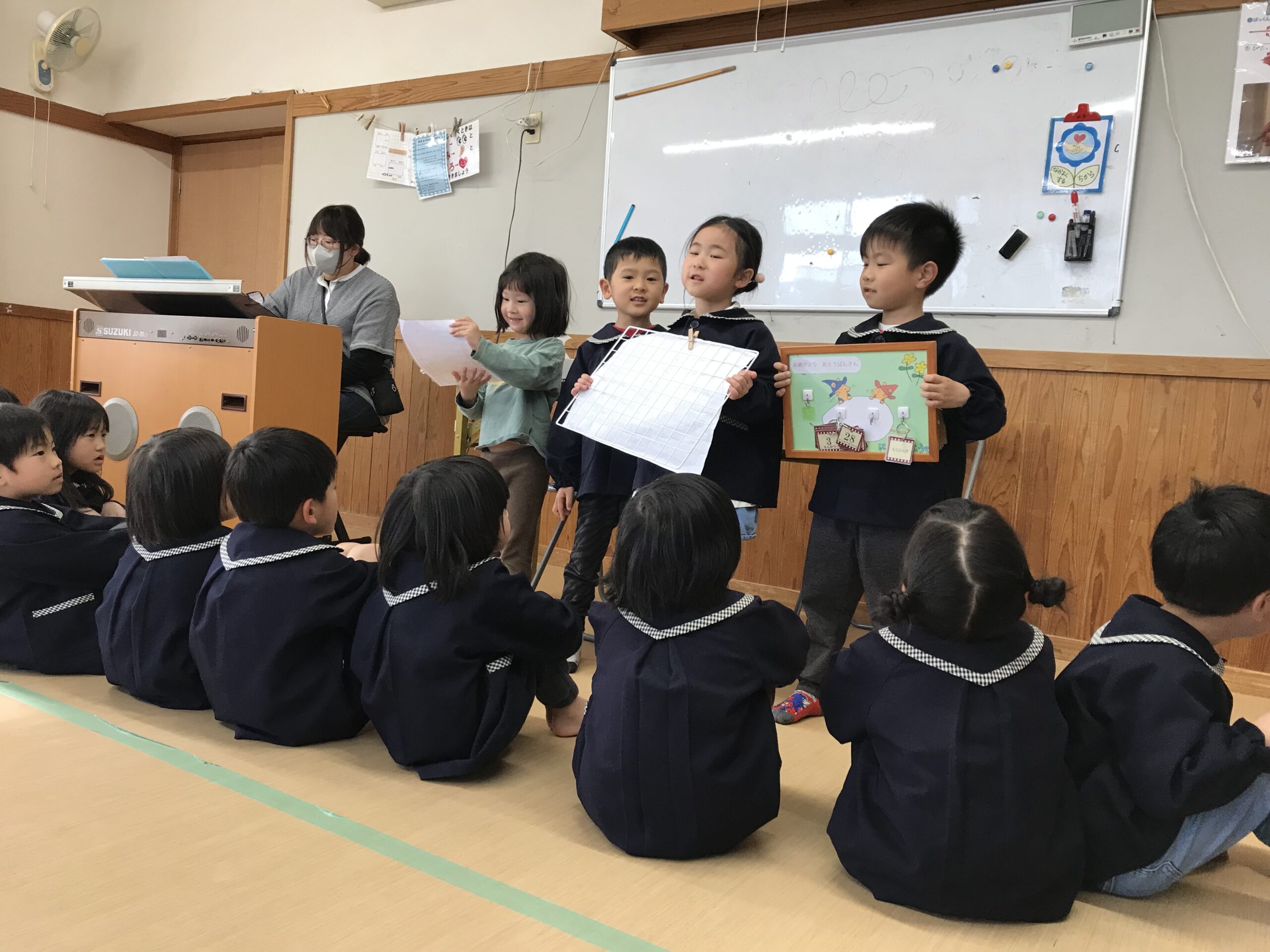 今日はお帰りのお集まりの様子をご紹介します。お集まりの時間は、季節の歌を歌ったり、今日何をして遊んだのかをお友達と共有したり、今日のキラキラ名人(お友達のかっこよかった様子)を見つけた人はみんなの前で発表をしたりとみんなで1日を振り返る時間です。「今日はどんなお話があるのかな?」「キラキラ名人は誰かなぁ」とみんなドキドキ楽しみにしています。みんなで輪になって、お当番さんが司会進行をしてくれます。お集まりの時間には子ども達のたくさんの育ちが見られます。みんなの前で伝えたいことを言葉にして発表することはとても難しいことですが一生懸命考えながら話す子ども達です。他にも、周りを見ながら司会進行をしたり、お友達の良い所を見つけたり…。みんなドキドキしながらも積極的に手を挙げて発表してくれます!とっても可愛らしいエピソードだったり、お友達同士をよく見ているなぁと感心したりと子ども達のお話はとにかく楽しくて面白いです!お友達の話を聞くことも上手になりました。1日の振り返りをした後は、明日の予定をお知らせします。子ども達は自分たちで次の日に持ってくるものの準備を頑張っているようです。明日の予定がわかると「明日も楽しみ~」とウキウキでお帰りのご挨拶をしています。「こども園楽しい!」と笑顔で声を掛けてくれるキラキラの子ども達です。