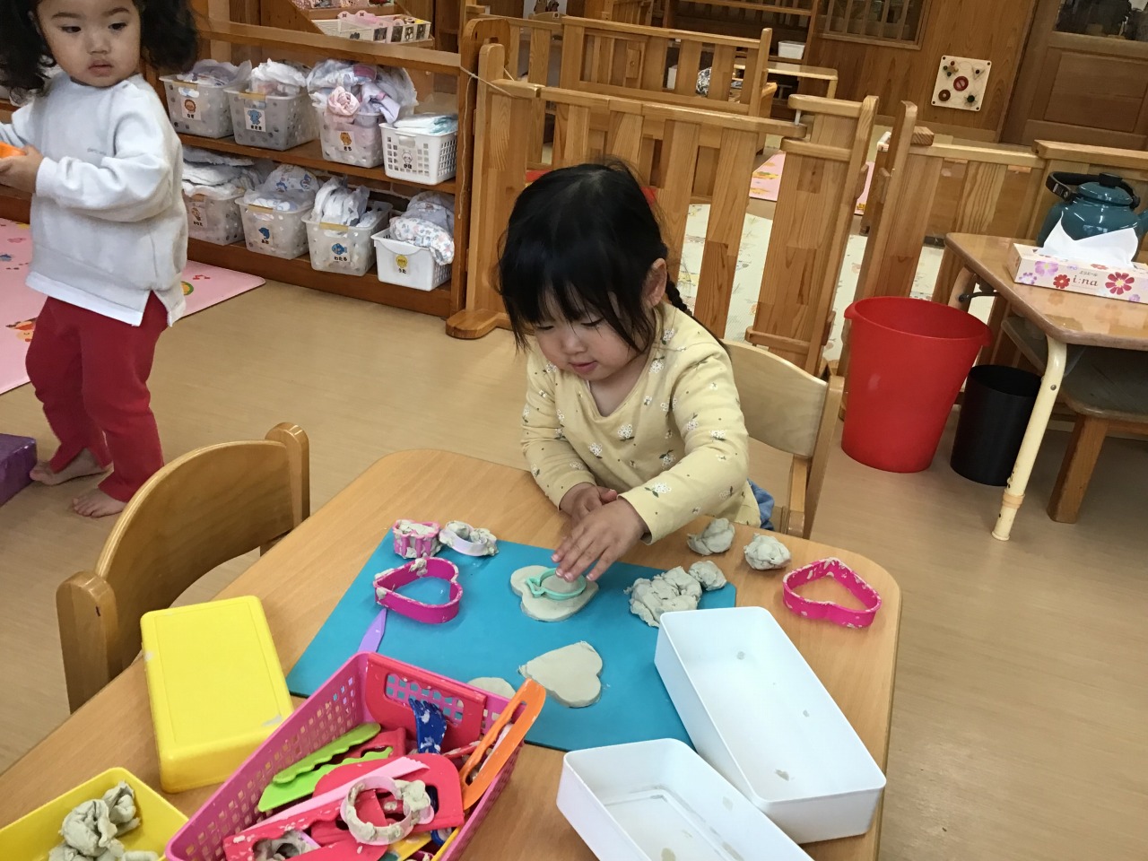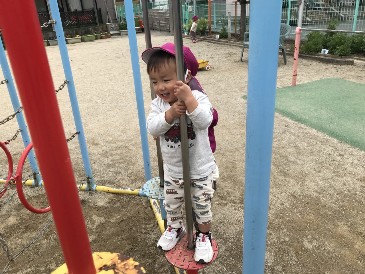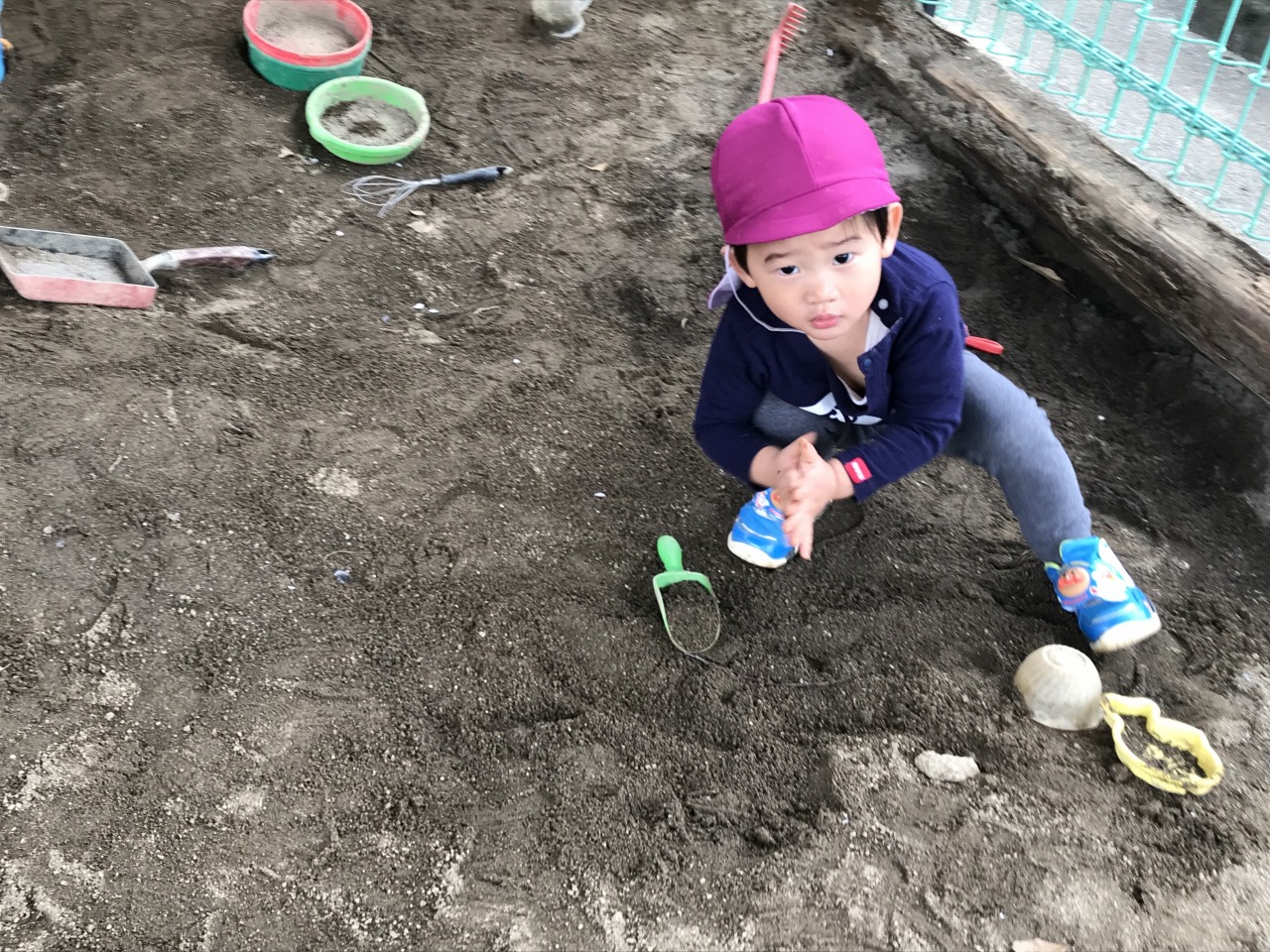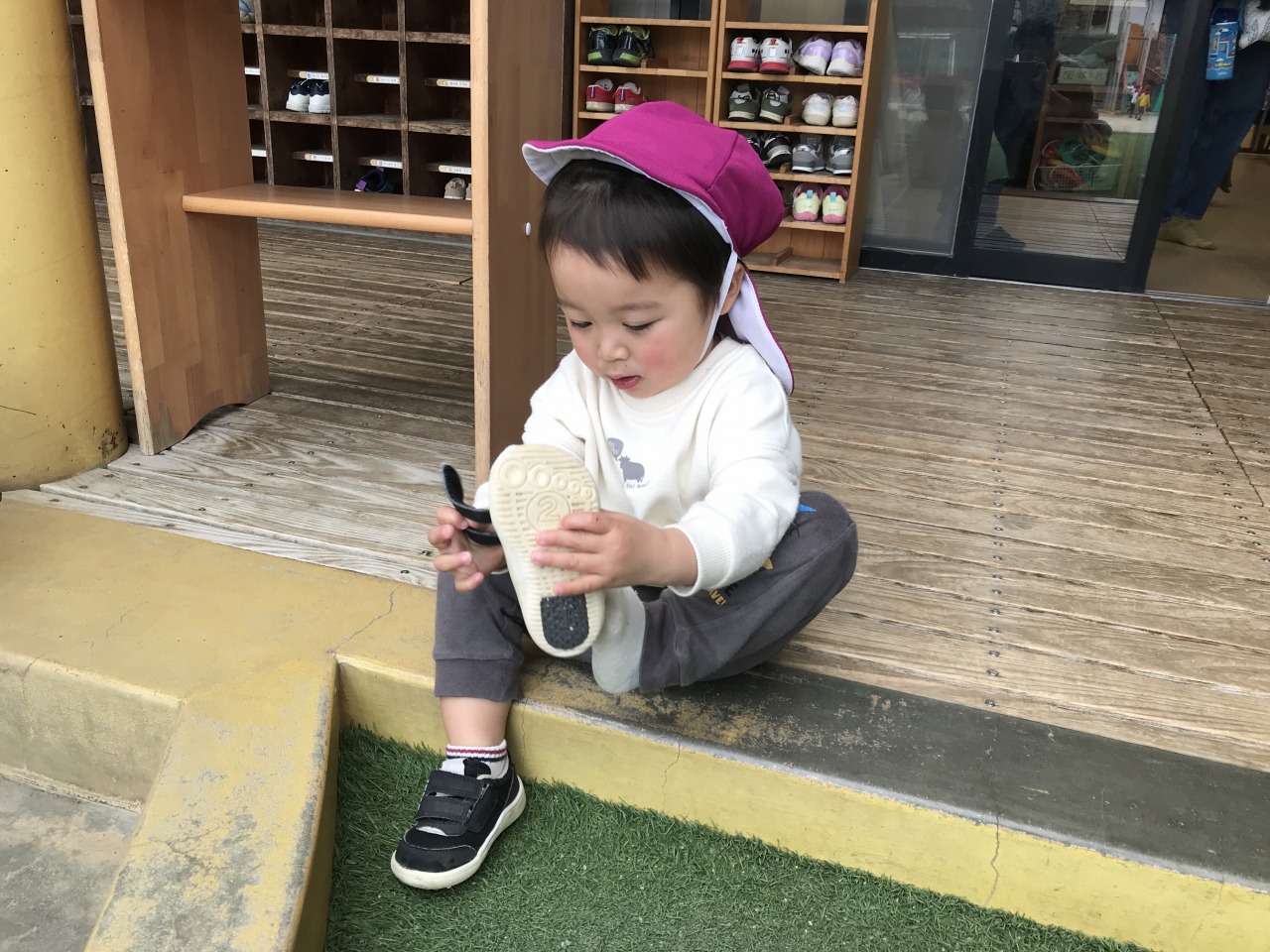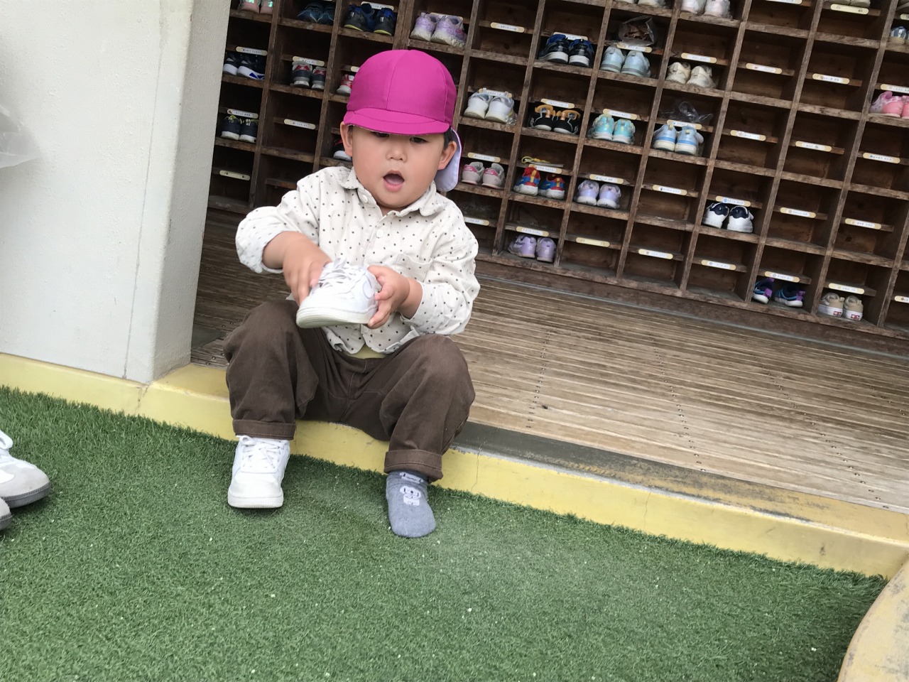 すみれ組(1歳児)は、雨が降る前にお外で遊びました。「せんせい~」と言って保育士に手伝ってもらっていたことも、
