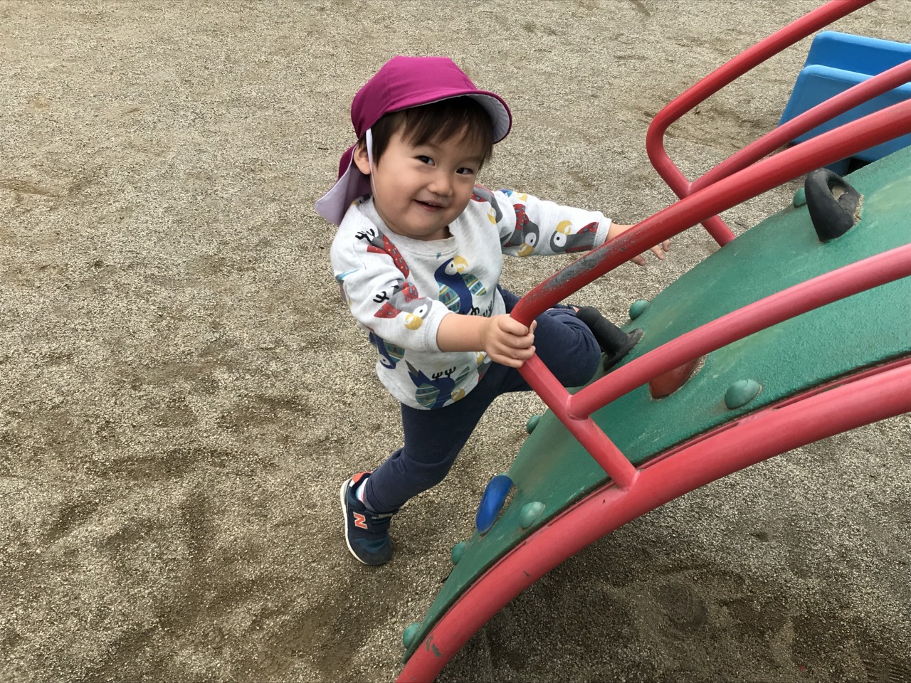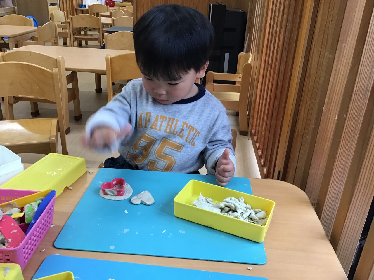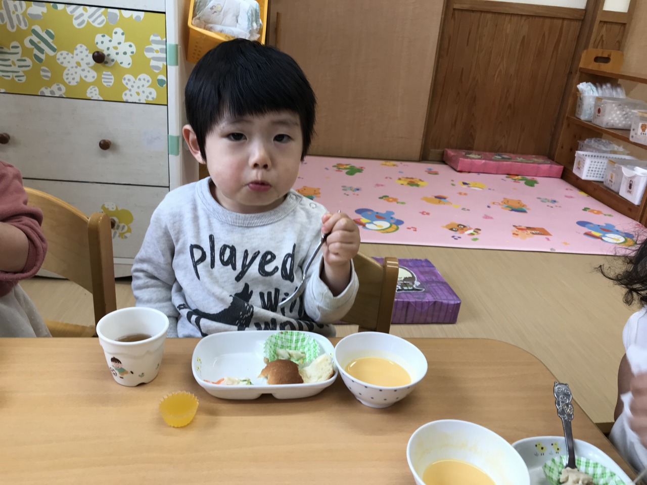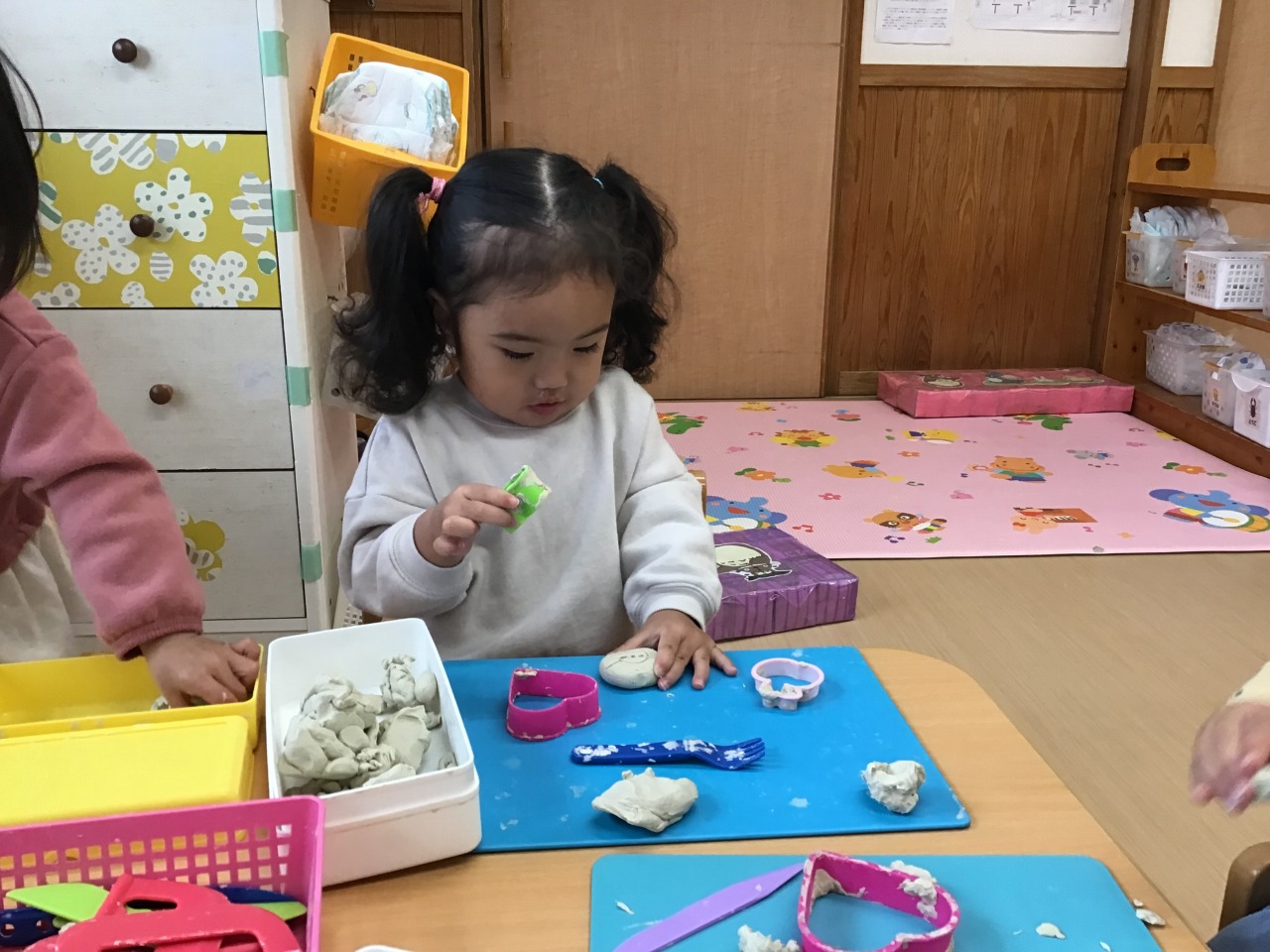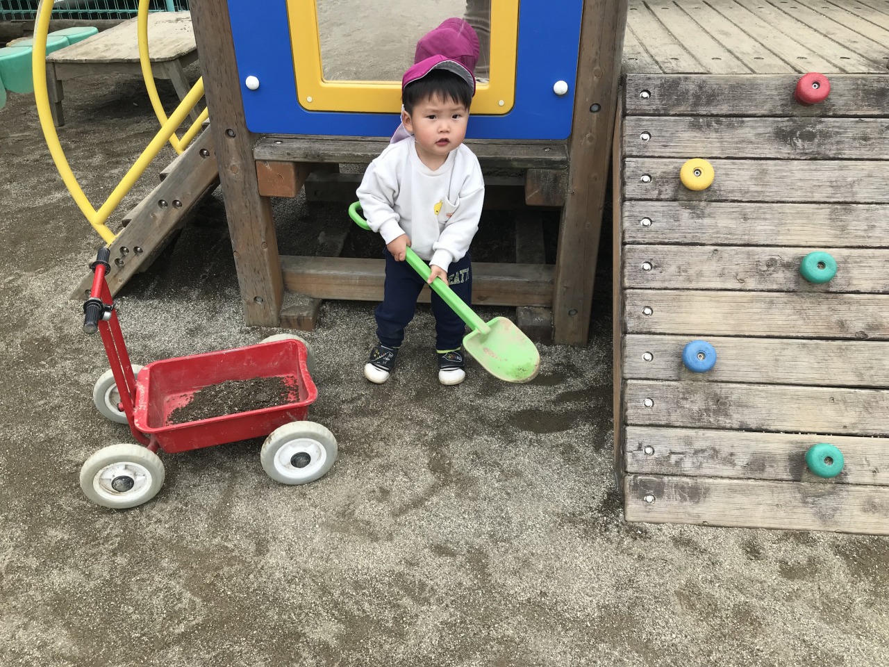 すみれ組(1歳児)は、雨が降る前にお外で遊びました。「せんせい~」と言って保育士に手伝ってもらっていたことも、
