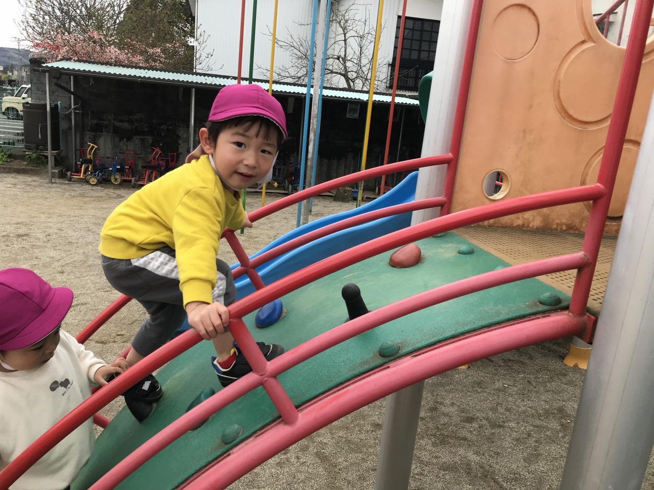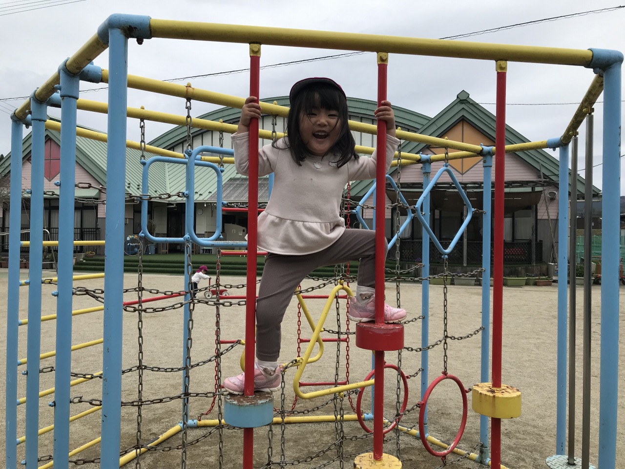 今では“自分でがんばろう“とやってみようとする気持ちが感じられるようになりました。たくさんできることが増えて自信もついて戸外遊びでも怖がらずに様々なことに挑戦することができています。。高いところに登って「見ててね」と言う表情からは自信が感じられます。靴を履いたり、遊具に登る時には手を添えていたり、食事では口に運んであげたりしていましたが、その手伝っていた手を少しずつ手を離していくことに寂しさを感じつつも一年間すみれ組のみんなと過ごしてきて一人ひとりのたくさんの成長を側で感じ、見守ることができたことをとても嬉しく思います。これからも成長していく姿を楽しみにしています。